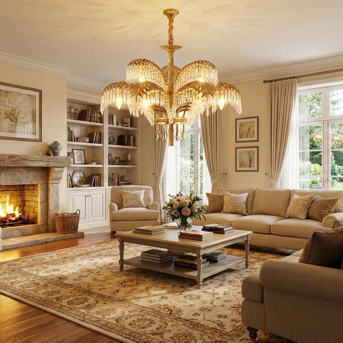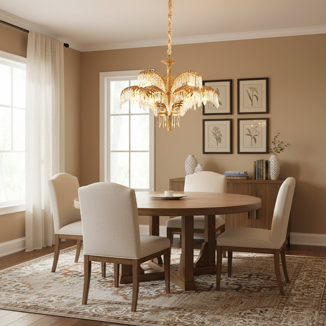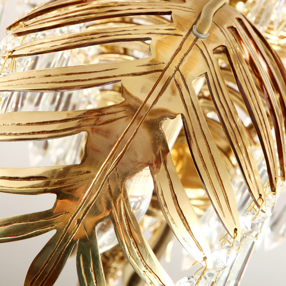 This Brass Palm Leaf Crystal Chandelier blends Italian artistic influences with exquisite craftsmanship, a golden marvel for your home. It presents natural elements in a light yet luxurious way! Cleverly suspended crystal or glass ornaments interplay with brass leaves, creating a shimmering interplay of light and shadow. It brings a unique style to your living room, dining room, or master bedroom, blending tropical flair with modern luxury.