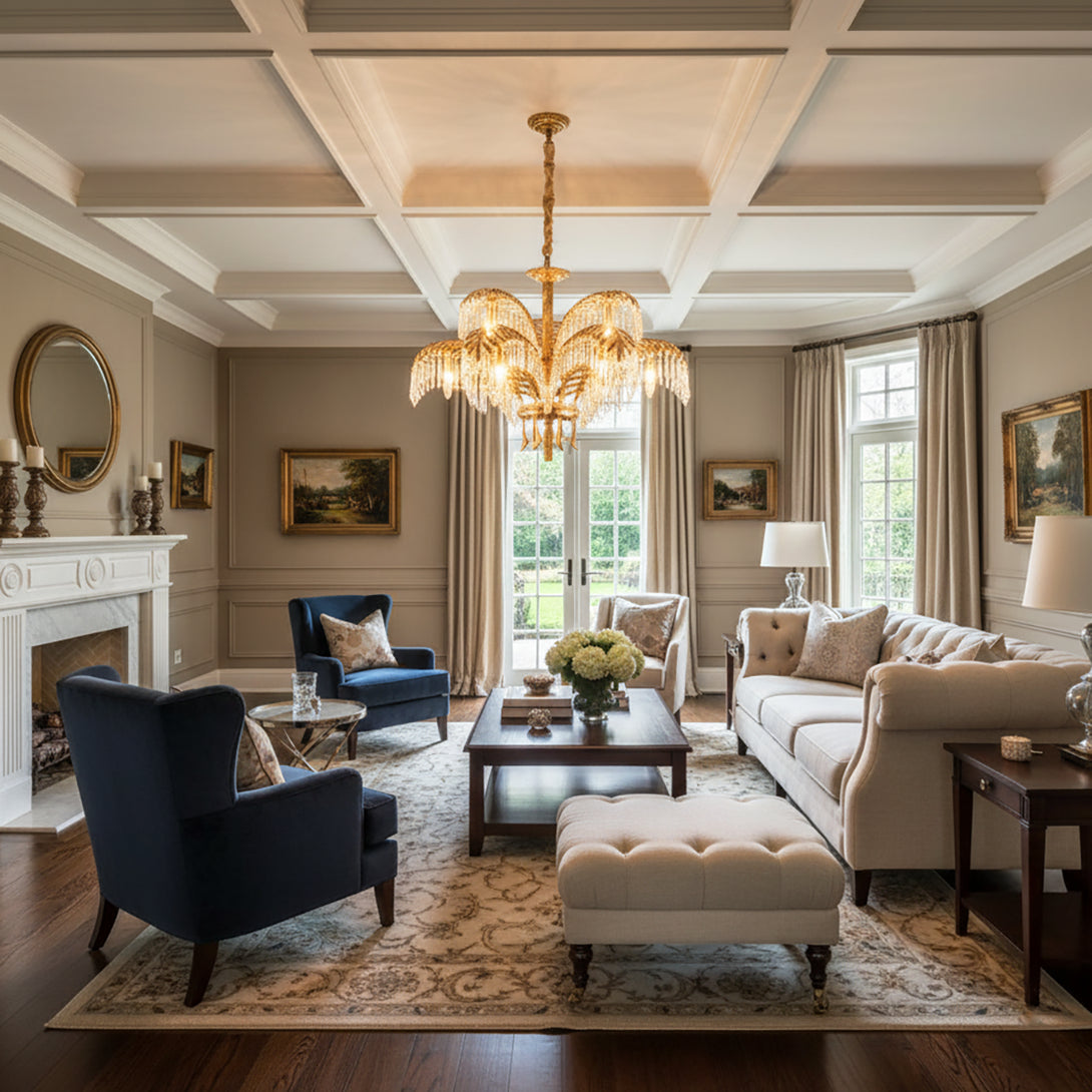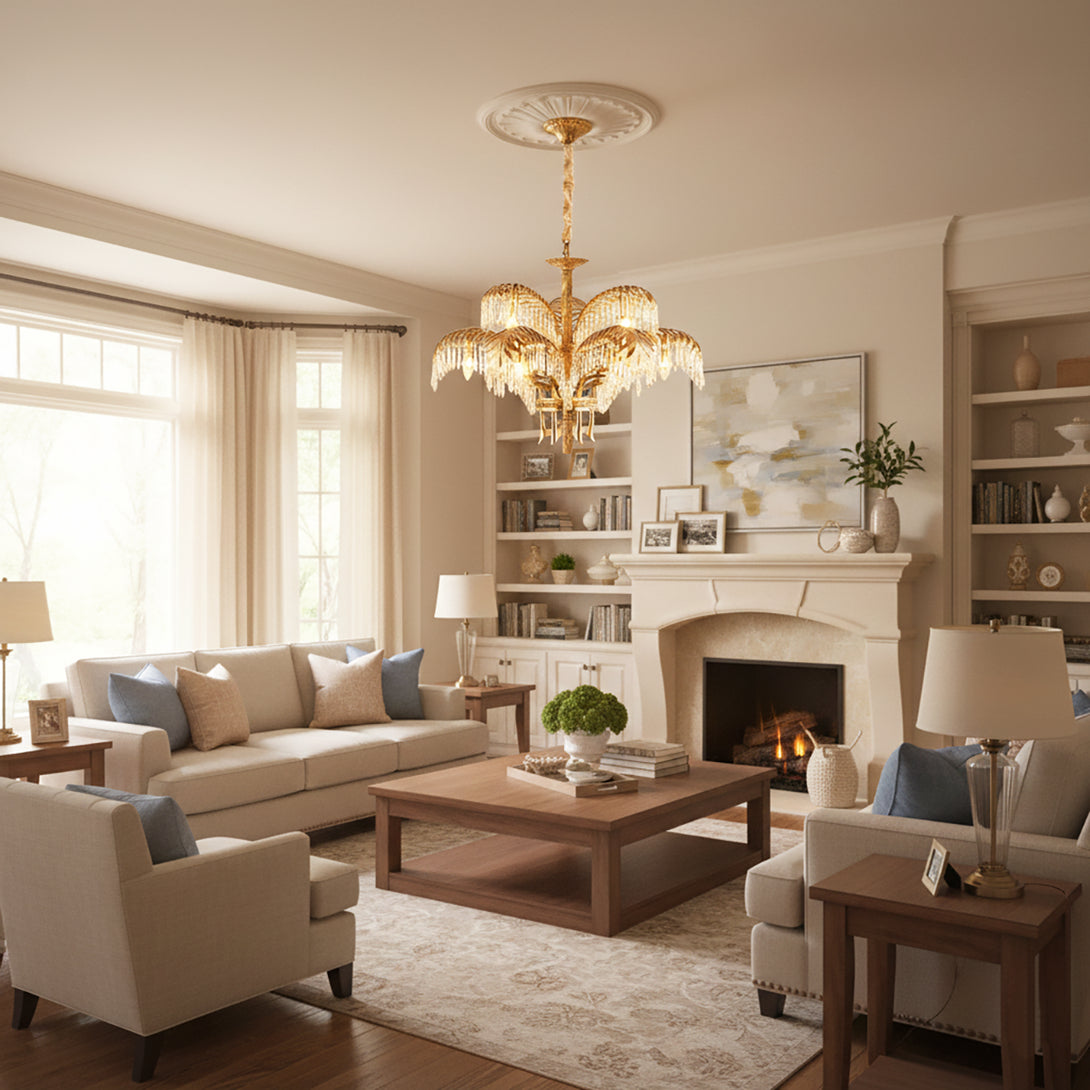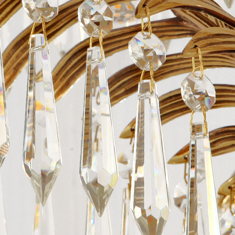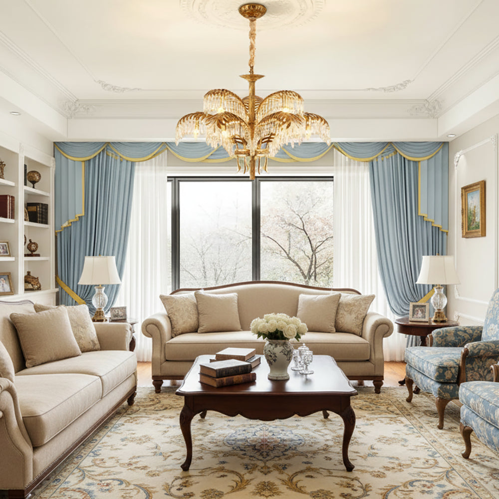 This Brass Palm Leaf Crystal Chandelier blends Italian artistic influences with exquisite craftsmanship, a golden marvel for your home. It presents natural elements in a light yet luxurious way! Cleverly suspended crystal or glass ornaments interplay with brass leaves, creating a shimmering interplay of light and shadow. It brings a unique style to your living room, dining room, or master bedroom, blending tropical flair with modern luxury.