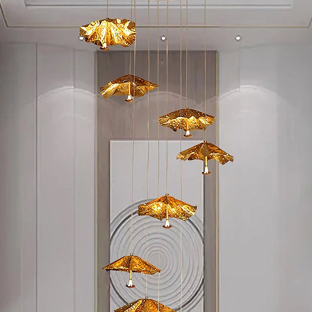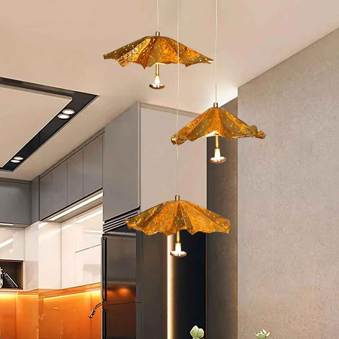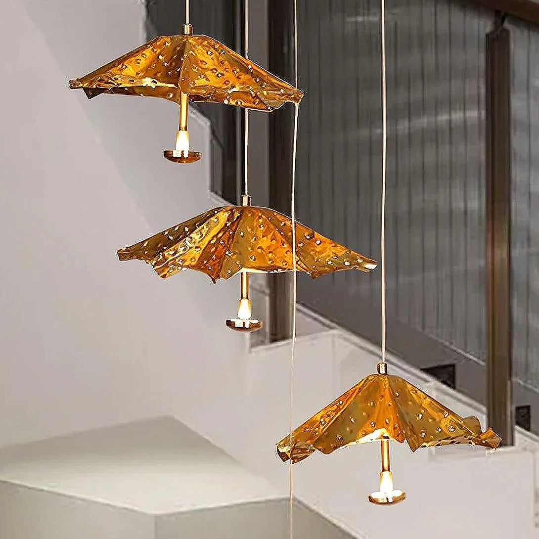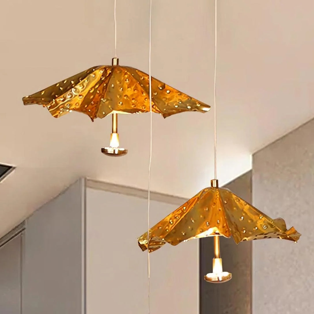 This artistic Modern Livra Chandelier from korewolamp is a truly unique and playful fixture that challenges conventional lighting design. The striking lampshade is shaped like an inverted umbrella or parasol and is finished in a vibrant, textured gold tone. The surface of the shade is intentionally designed with subtle indentations, giving the appearance of raindrops or a hammered surface, which enhances the light's reflection. A single light source hangs from the center, casting a focused glow beneath the dramatic canopy. This piece is a perfect statement for adding a touch of whimsy, color, and modern artistry above a dining table, kitchen island, or reading nook.