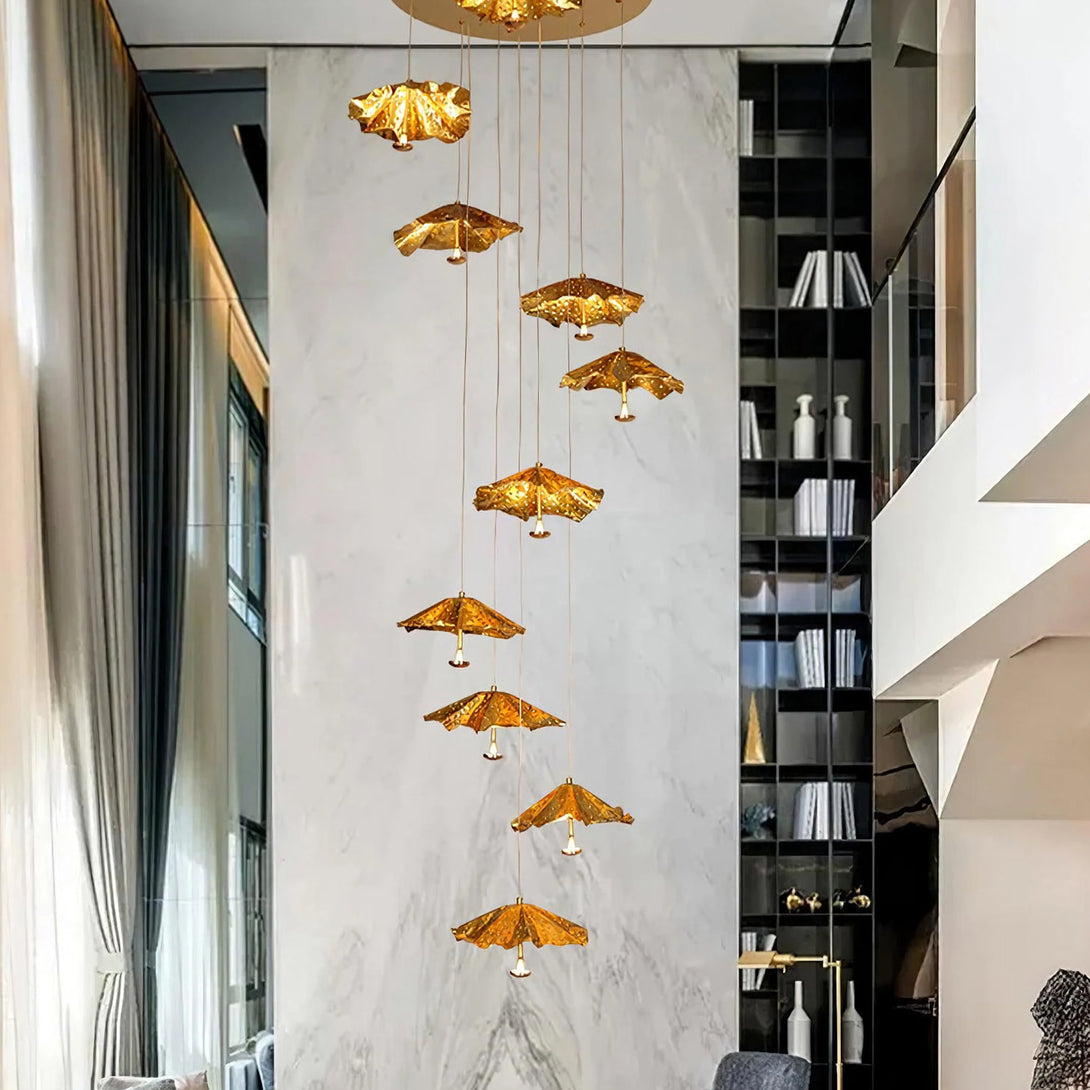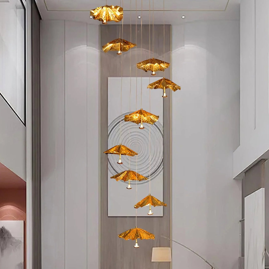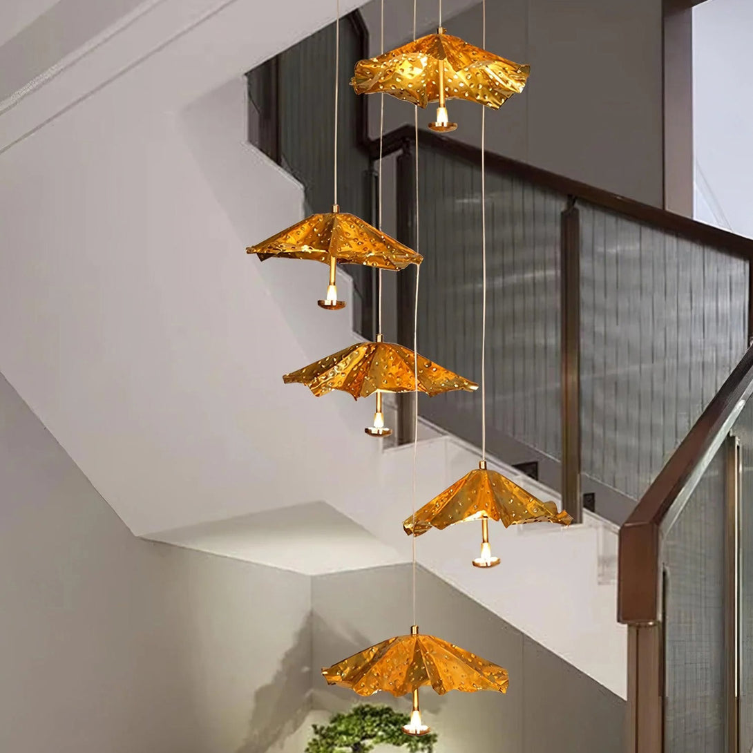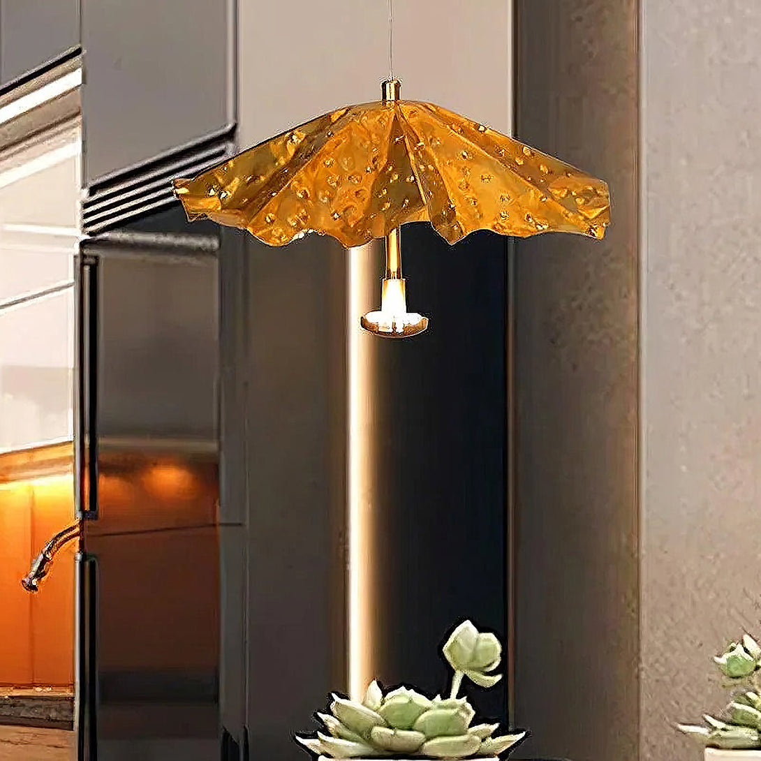 This artistic Modern Livra Chandelier from korewolamp is a truly unique and playful fixture that challenges conventional lighting design. The striking lampshade is shaped like an inverted umbrella or parasol and is finished in a vibrant, textured gold tone. The surface of the shade is intentionally designed with subtle indentations, giving the appearance of raindrops or a hammered surface, which enhances the light's reflection. A single light source hangs from the center, casting a focused glow beneath the dramatic canopy. This piece is a perfect statement for adding a touch of whimsy, color, and modern artistry above a dining table, kitchen island, or reading nook.