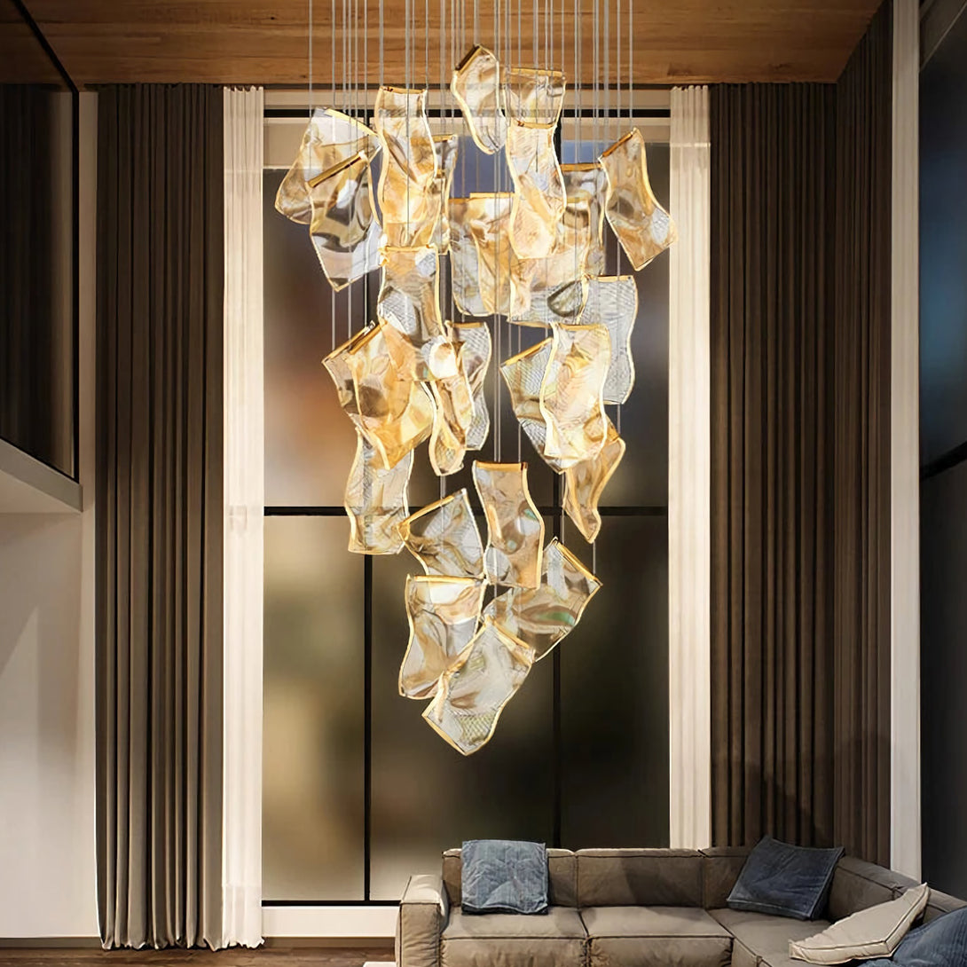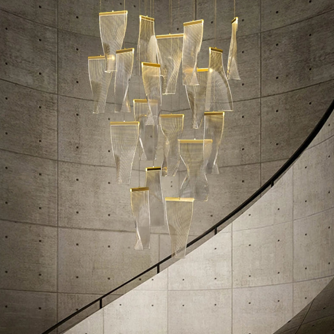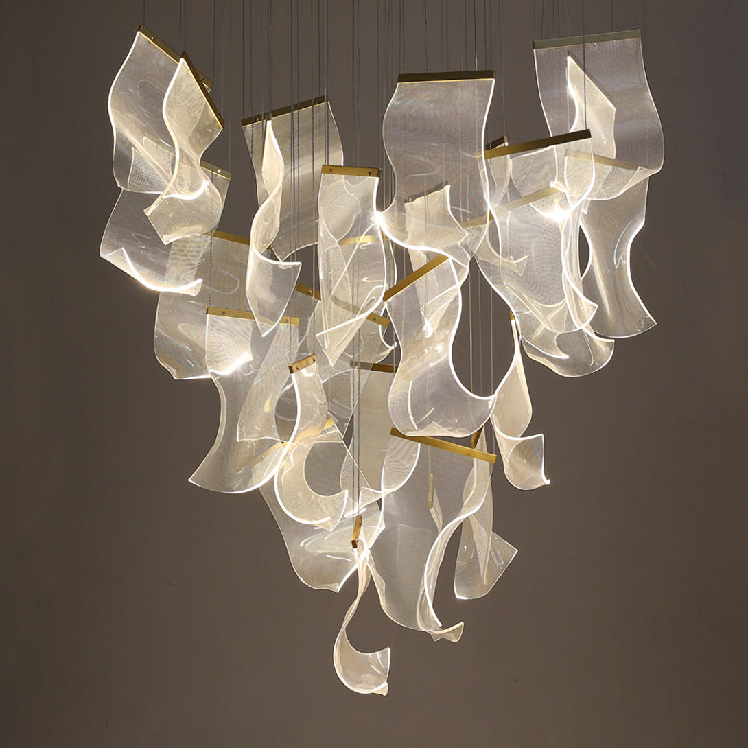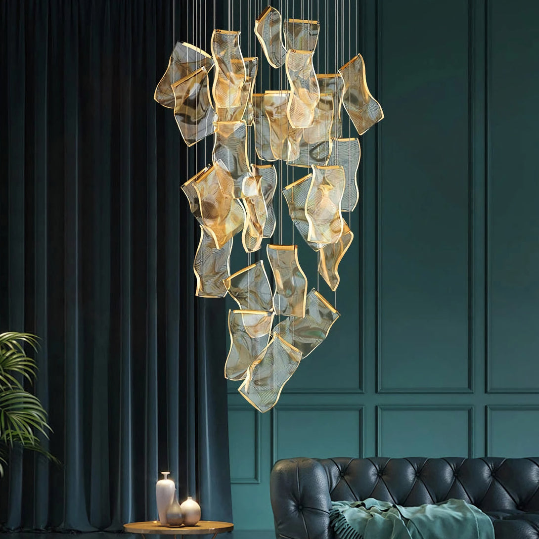 This spectacular Postmodern Creative Chandelier from korewolamp is a true work of art designed to be a showstopping centerpiece. It features seven individual pendants, each suspended at a different height, creating a dynamic, floating arrangement. The shades are the most striking element: they are crafted from a textured, sheer material with an abstract, marble-like pattern in gold and cream tones, shaped into organic, undulating forms that resemble flowing fabric. The perimeter of each shade is subtly illuminated, defining its fluid shape and casting a warm, artistic glow. This fixture is perfect for adding a sense of avant-garde luxury and soft, dramatic lighting to a modern dining room or high-end living area.