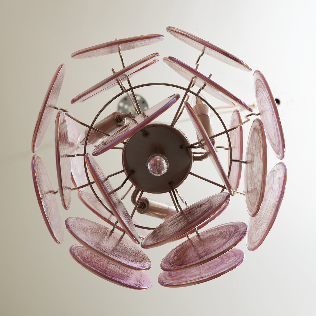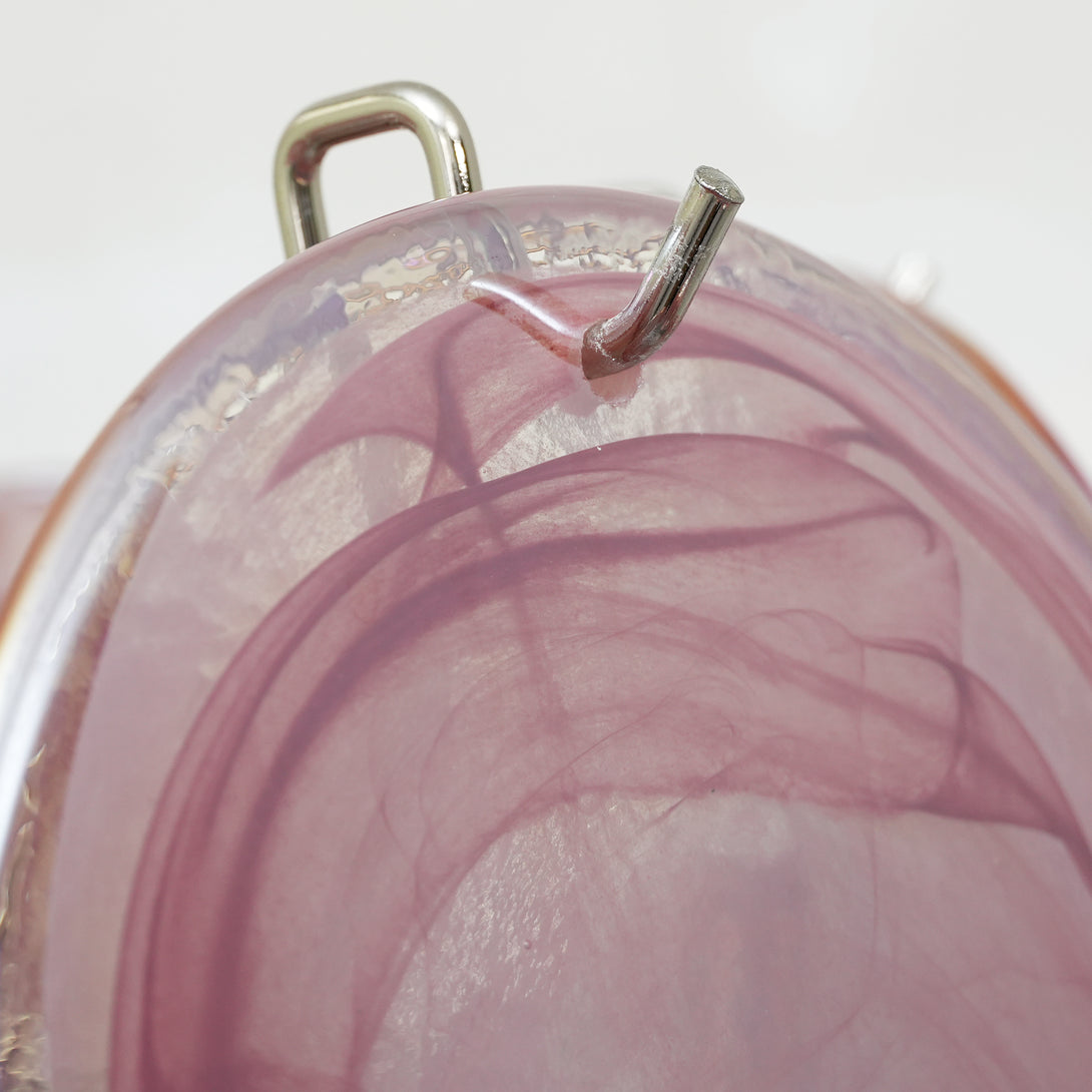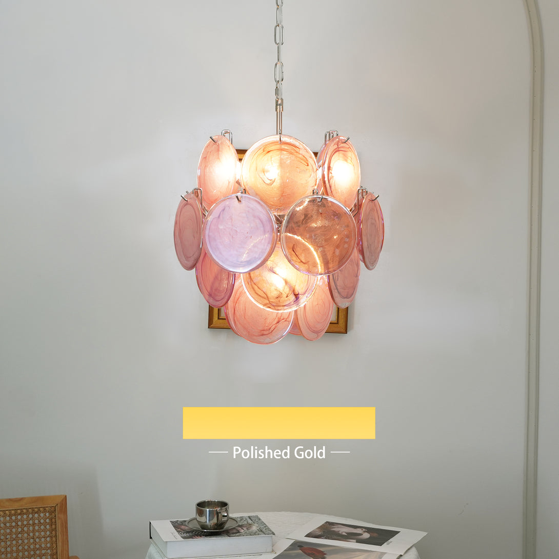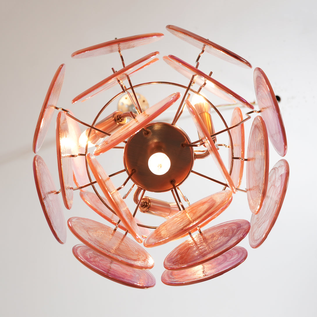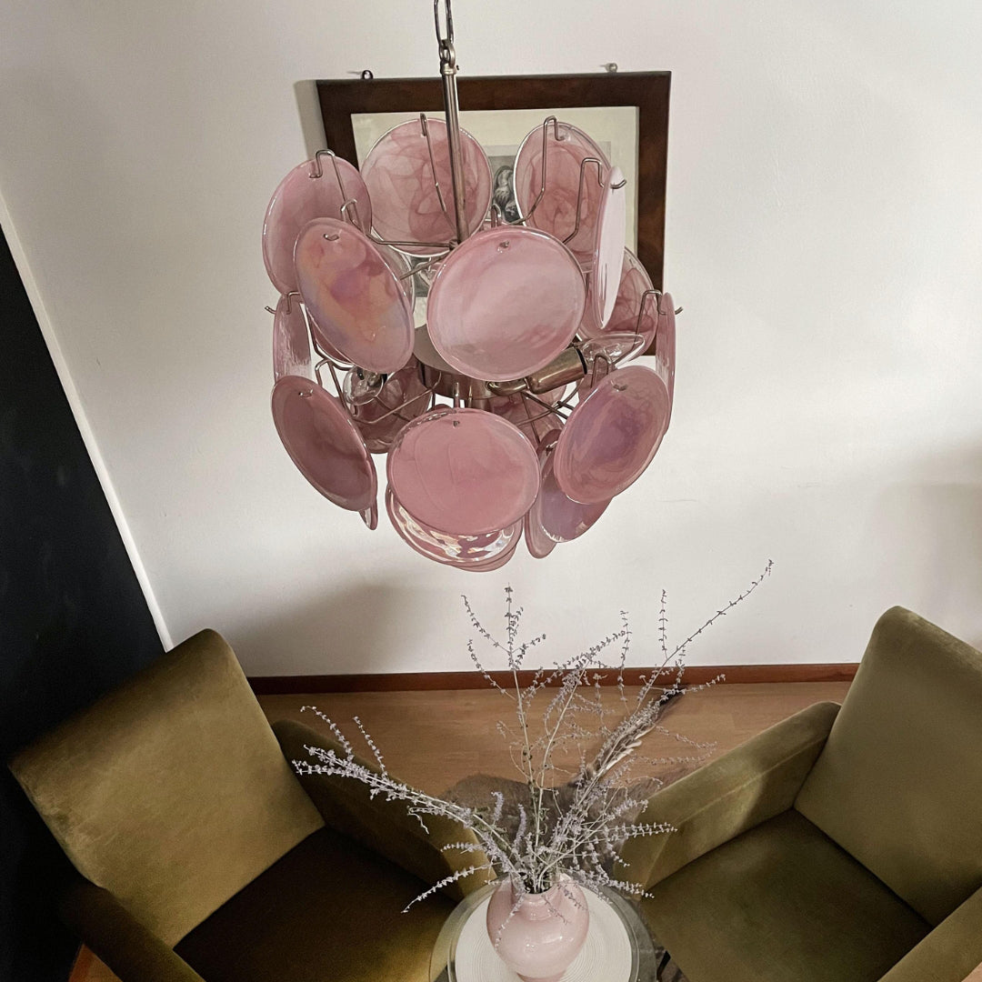 Vintage Murano Pink Glass Disks Chandelier. Add a touch of vintage elegance to your home with the stunning Murano Pink Disks Chandelier. Creating a captivating and sophisticated centerpiece that enhances any room's decor. The Pink Disks Chandelier provides a striking visual impact with its unique design and vibrant color. Provides a warm and inviting glow that adds a touch of elegance and charm to any space.