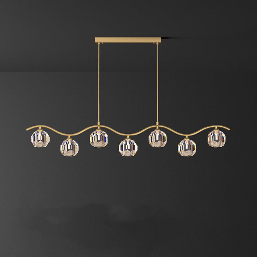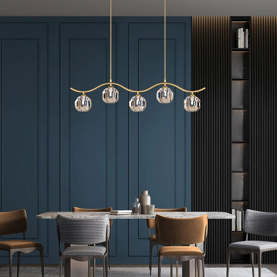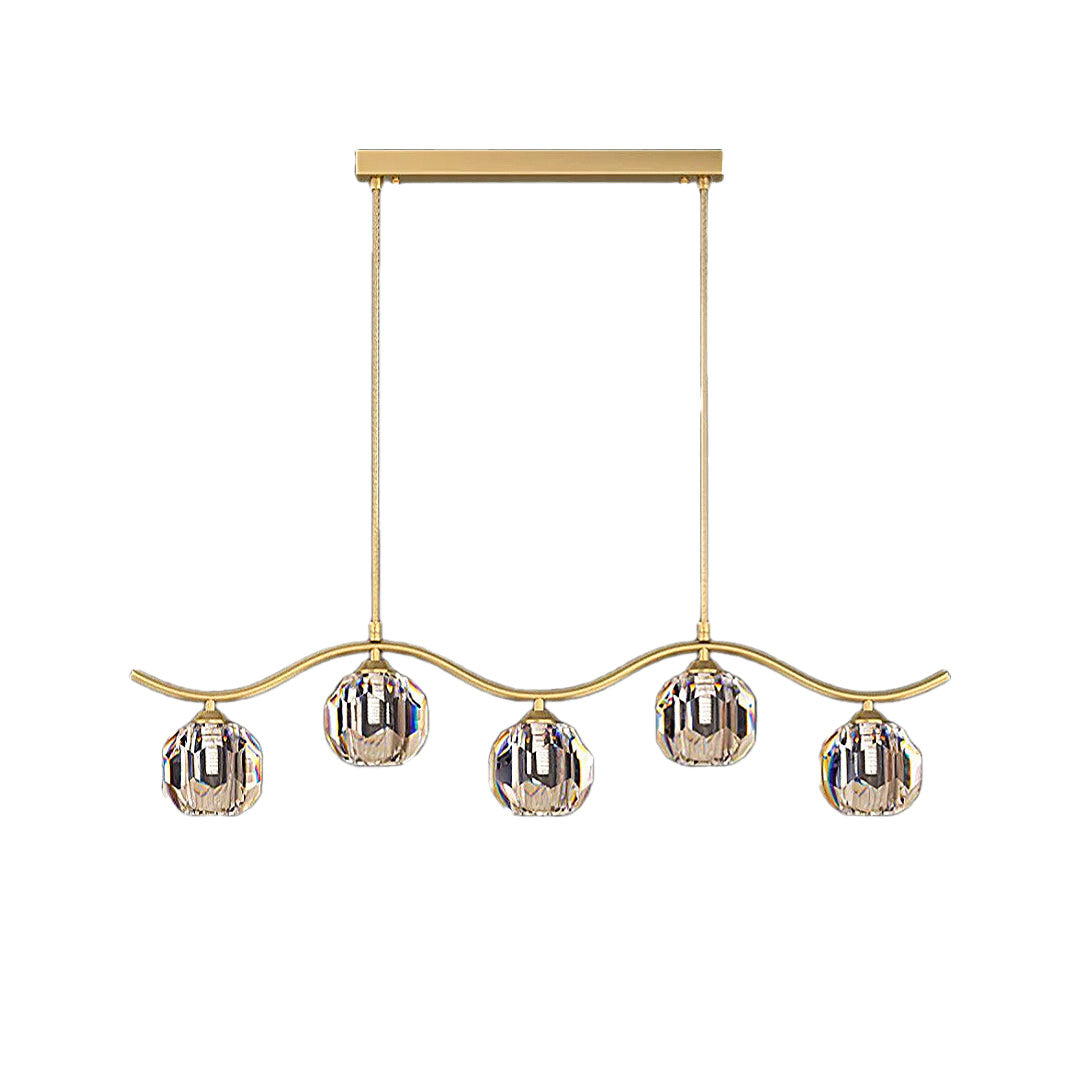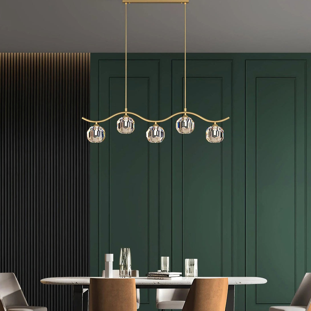 This Minimalist Wave Glass Orb Chandelier from korewolamp is a stunning and elegant fixture designed to be a centerpiece over a dining table or kitchen island. The design features a sleek, undulating metal bar in a polished gold finish that creates a beautiful wave-like silhouette. spherical, faceted crystal orbs hang from this bar, each designed to refract light in a dazzling, sparkling pattern. The minimalist design, combined with the luxurious sparkle of the crystal, gives this chandelier a sophisticated and contemporary feel.