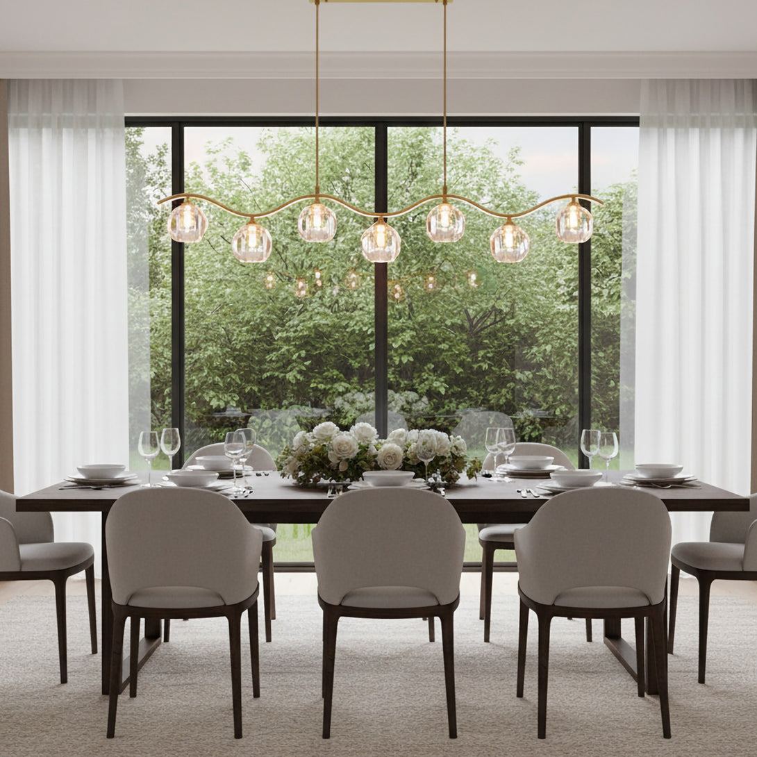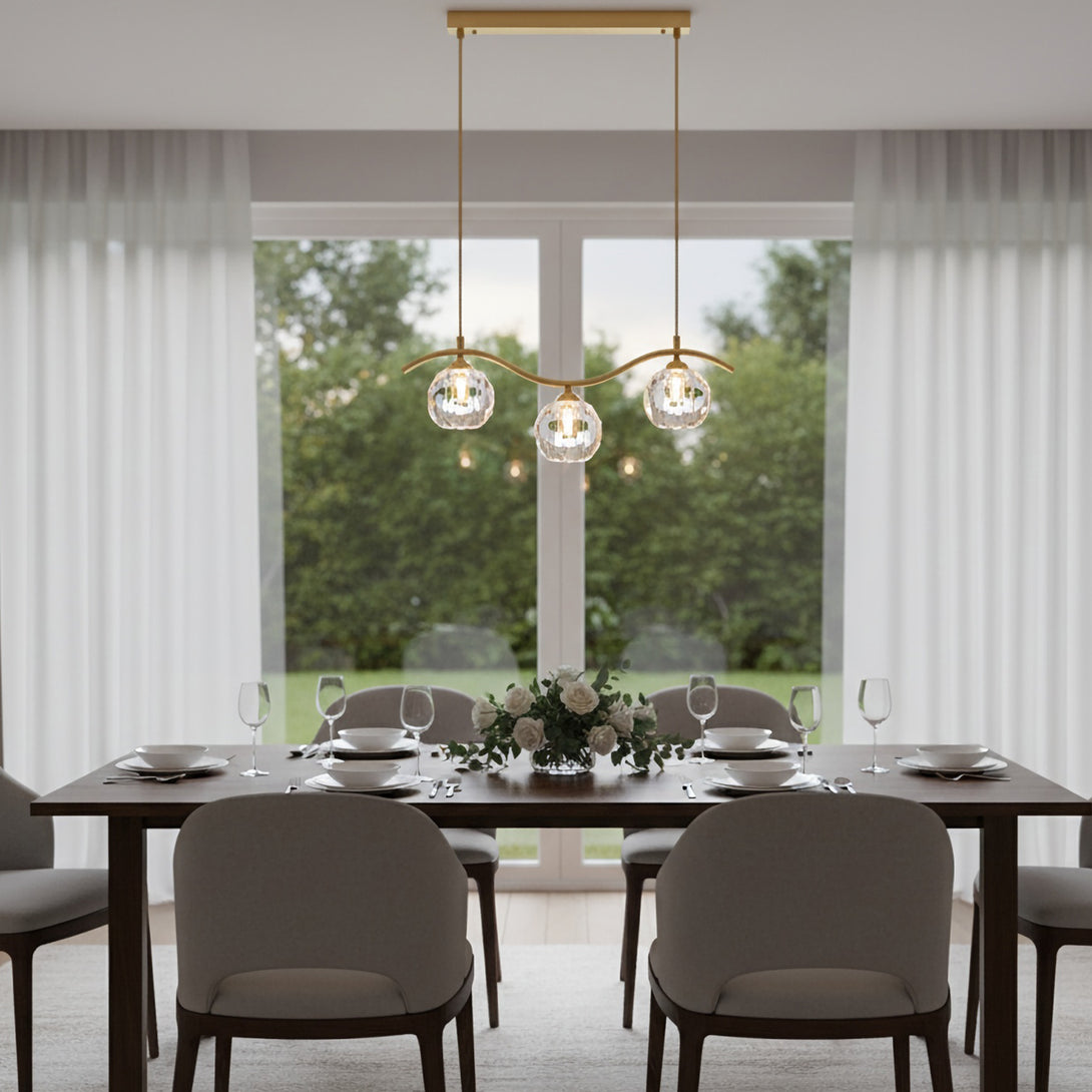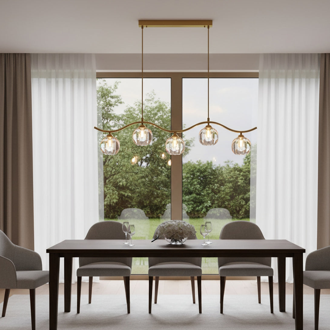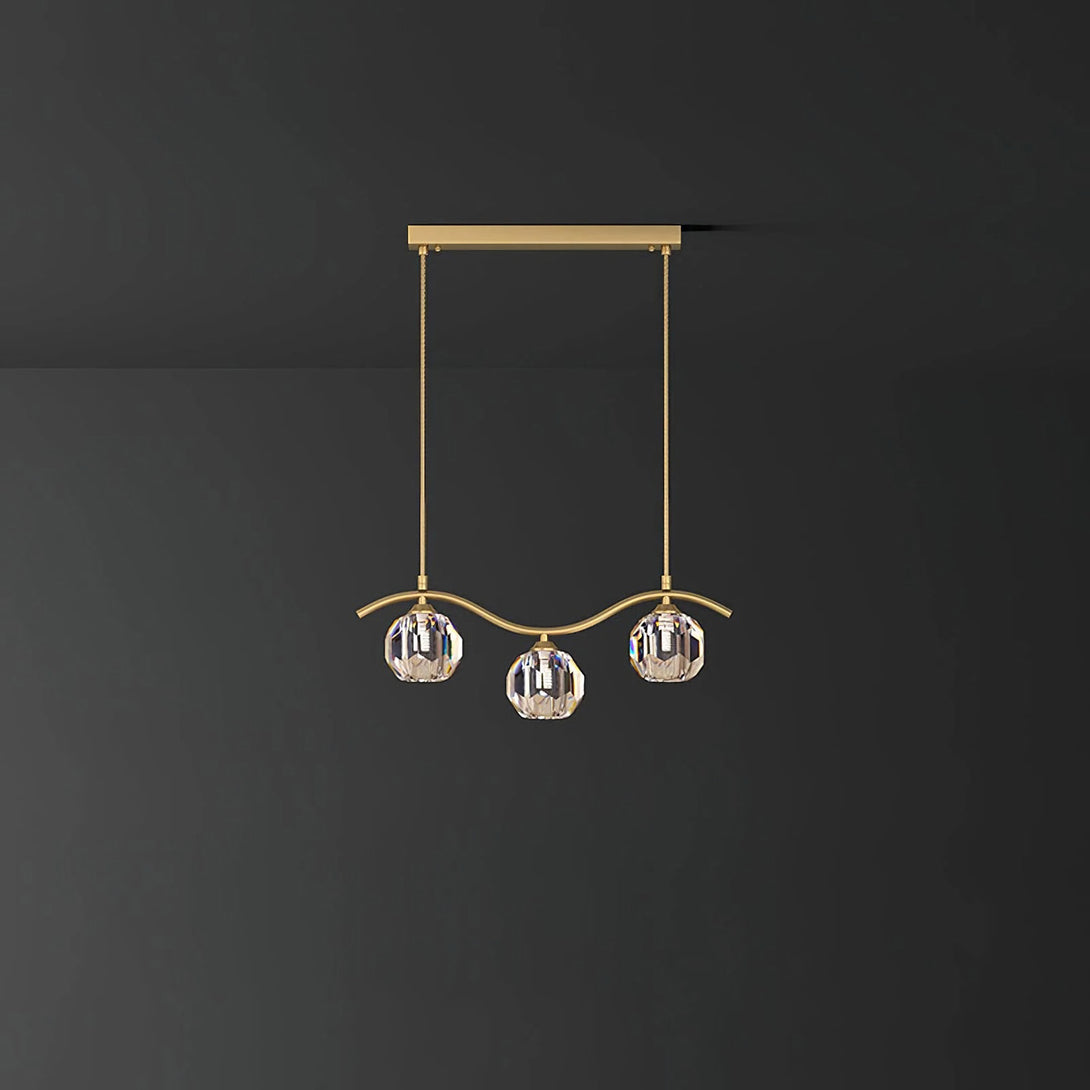 This Minimalist Wave Glass Orb Chandelier from korewolamp is a stunning and elegant fixture designed to be a centerpiece over a dining table or kitchen island. The design features a sleek, undulating metal bar in a polished gold finish that creates a beautiful wave-like silhouette. spherical, faceted crystal orbs hang from this bar, each designed to refract light in a dazzling, sparkling pattern. The minimalist design, combined with the luxurious sparkle of the crystal, gives this chandelier a sophisticated and contemporary feel.