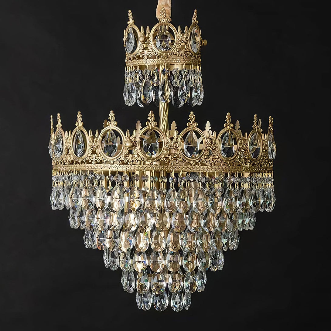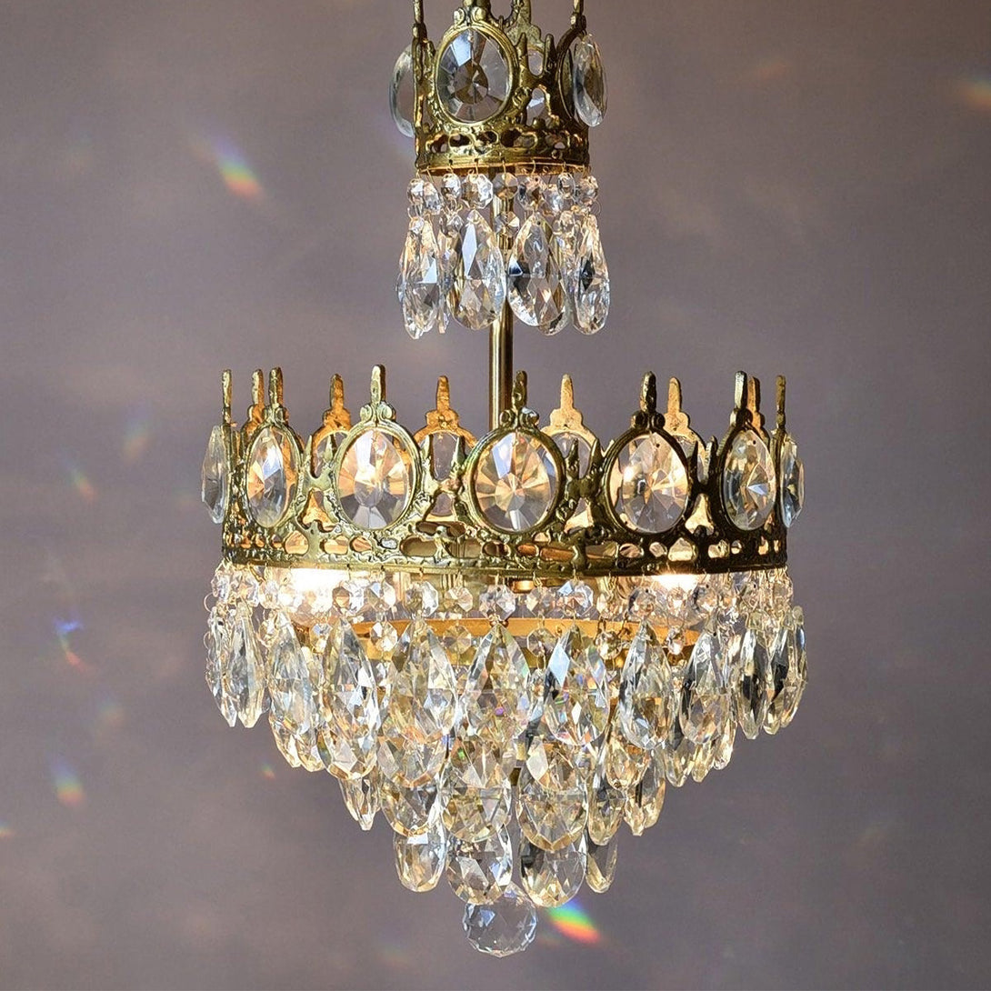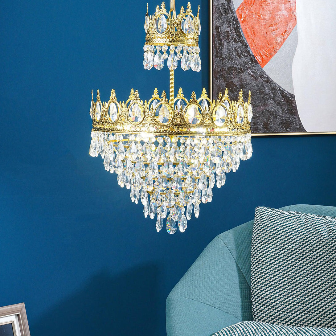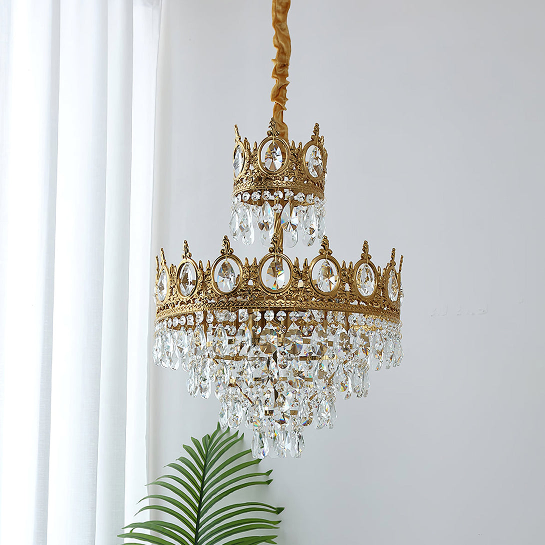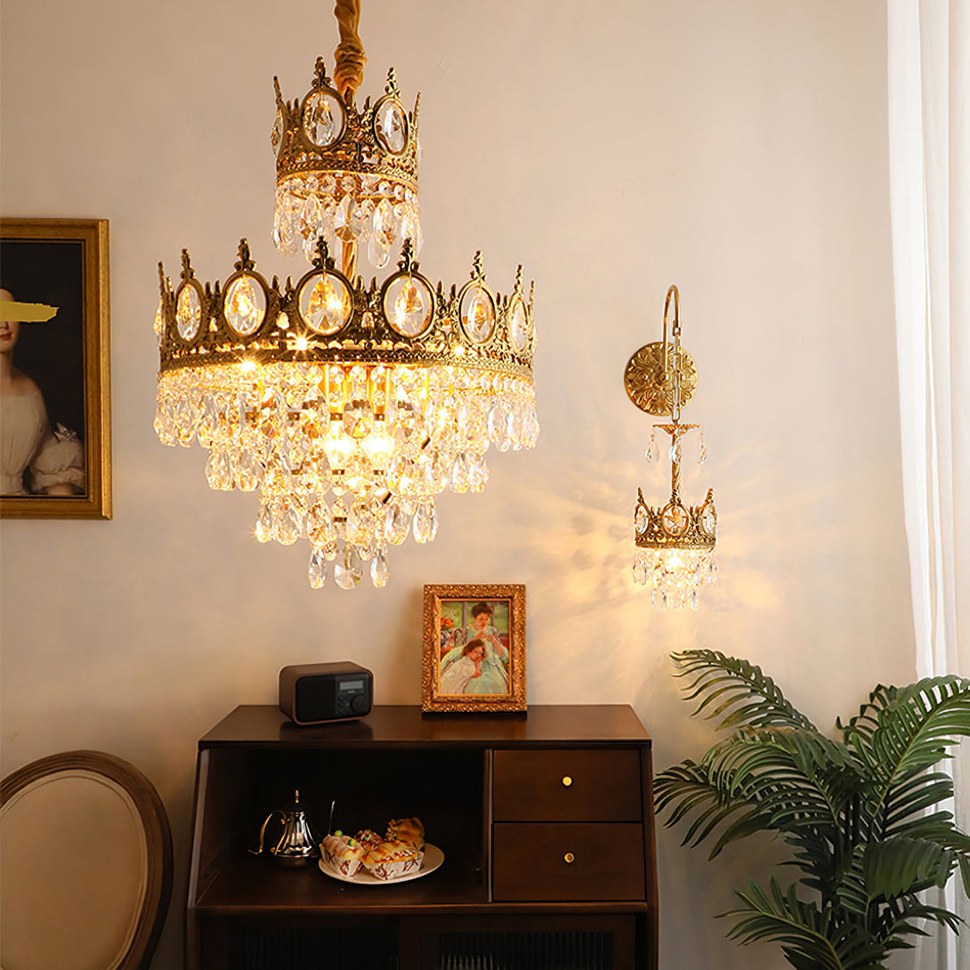 This magnificent Vintage Crystal Chandelier from korewolamp is a truly opulent and dramatic lighting piece. Its design is inspired by royal elegance, featuring a  structure that resembles an antique gold crown. Both tiers are elaborately detailed with ornate metalwork and circular glass or crystal medallions. Hundreds of clear, multi-faceted crystal prisms cascade down from the frame, creating a spectacular curtain of sparkle. The warm gold finish and the brilliant, shimmering crystals make this chandelier a breathtaking focal point, perfect for adding a sense of grandeur and luxury to a formal dining room, entryway, or ballroom.