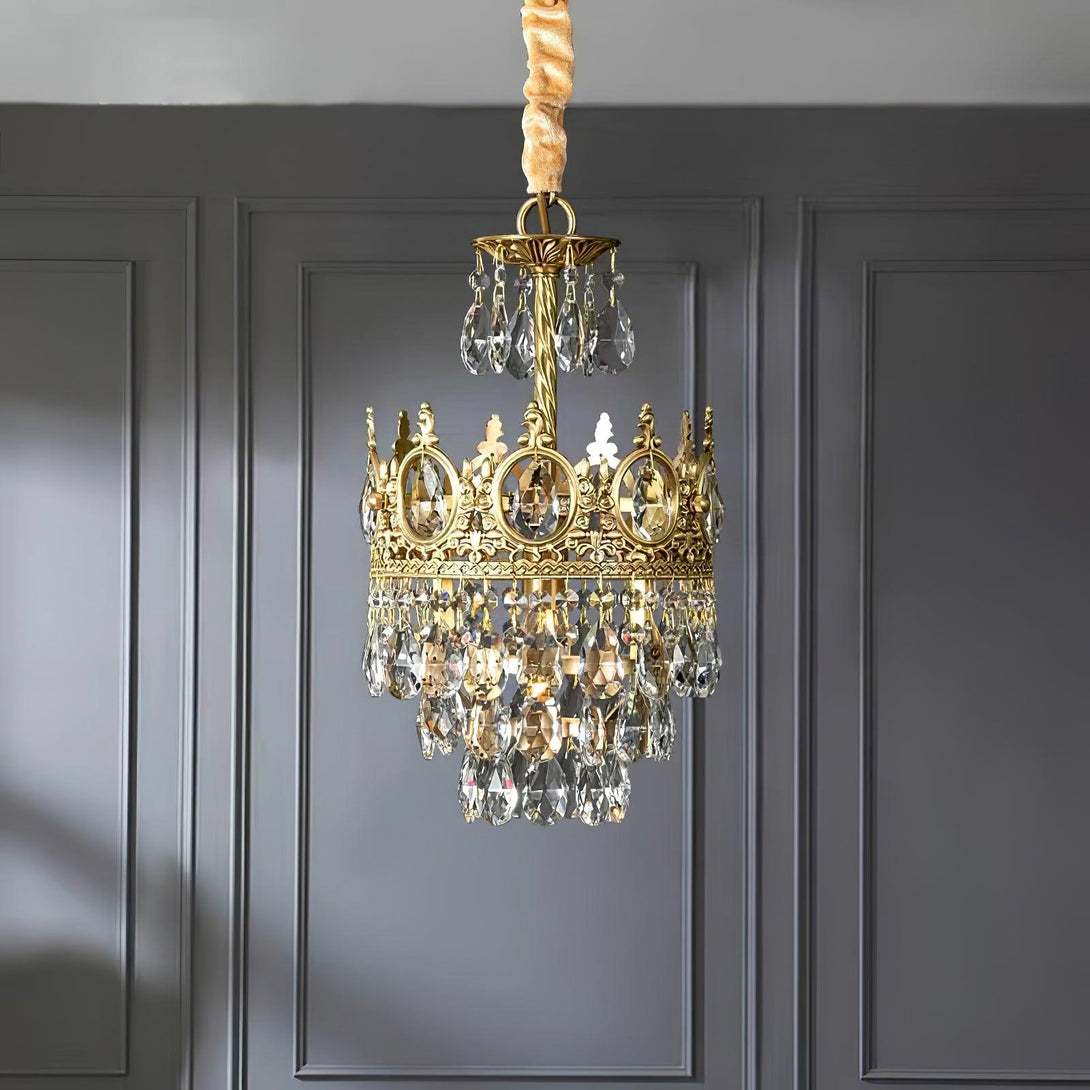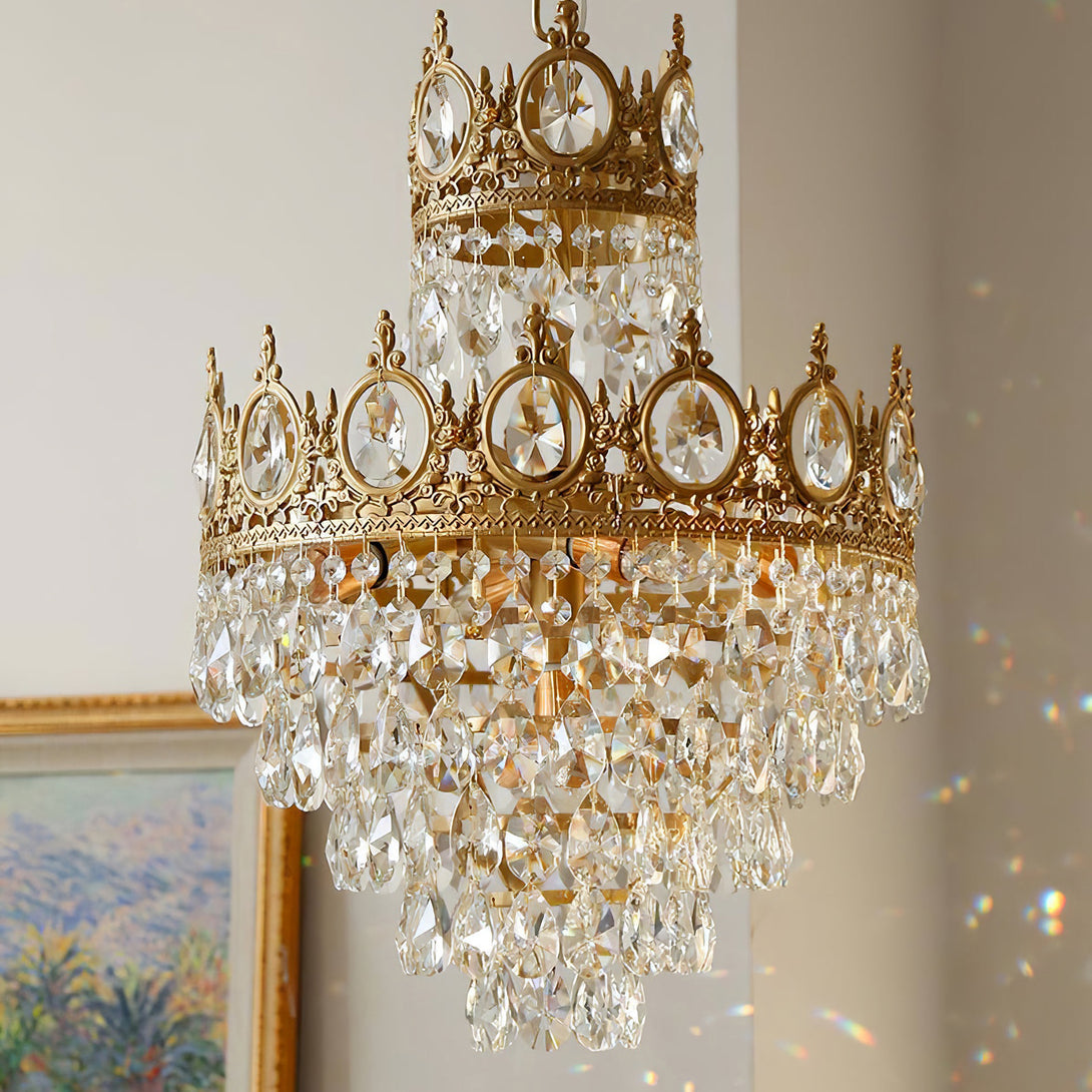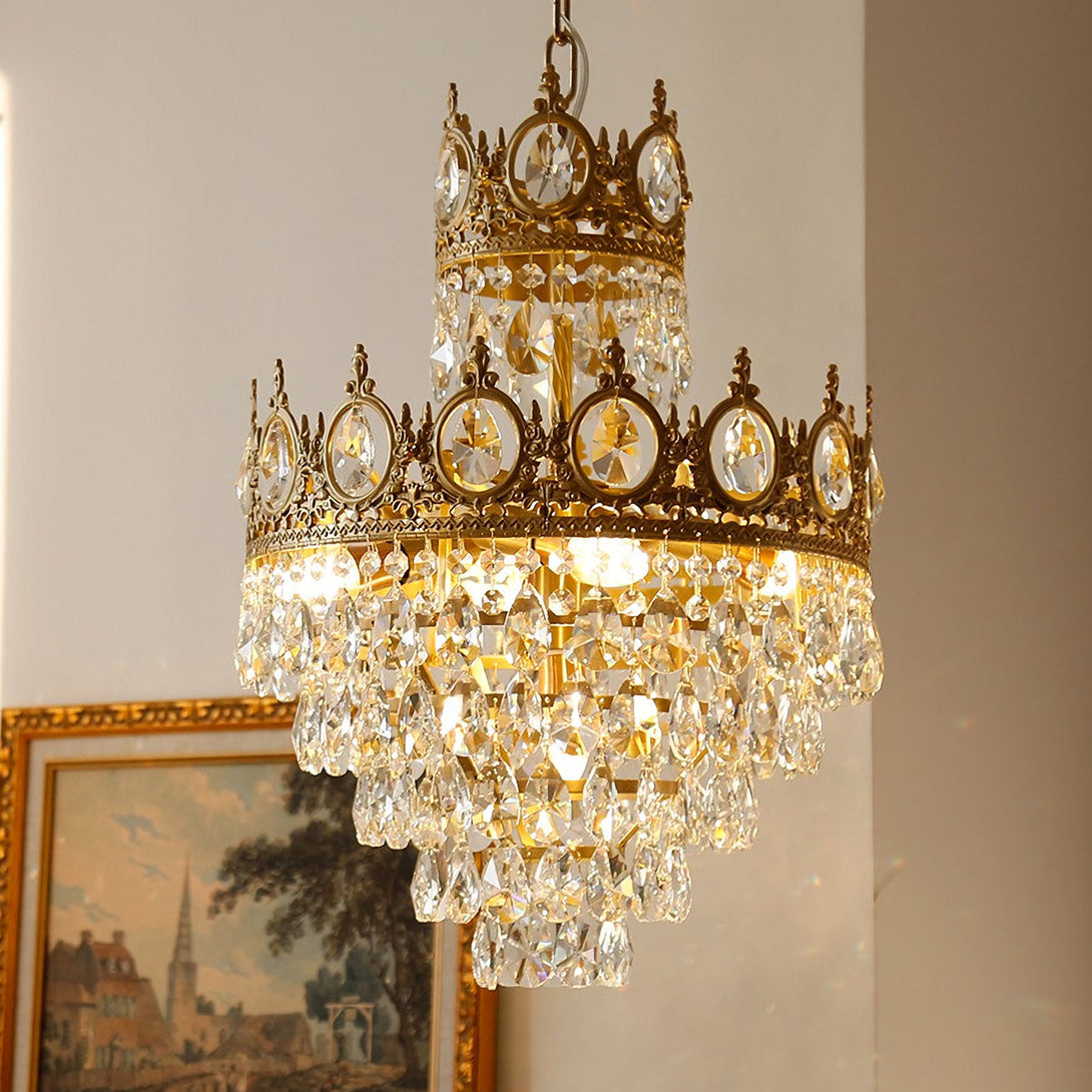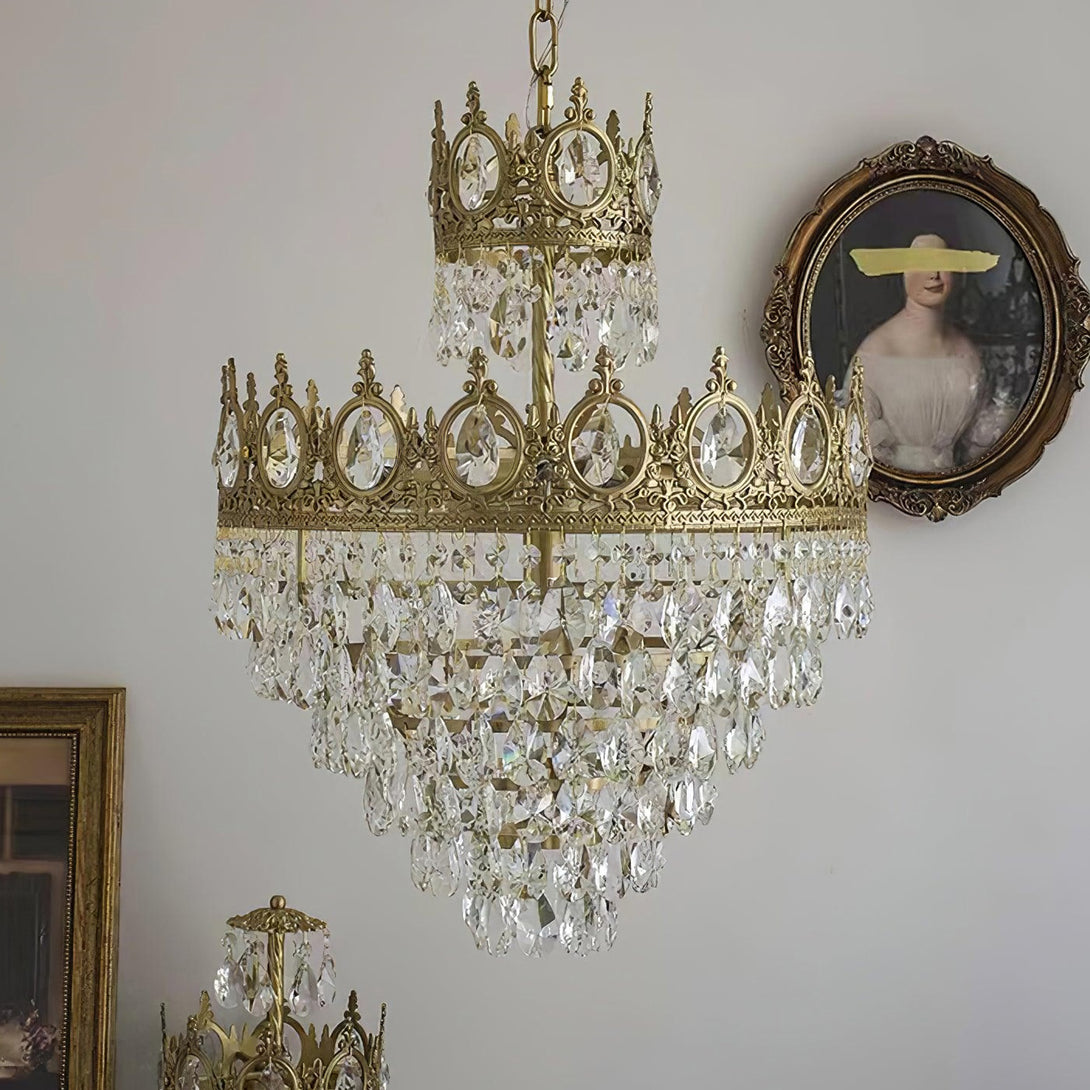 This magnificent Vintage Crystal Chandelier from korewolamp is a truly opulent and dramatic lighting piece. Its design is inspired by royal elegance, featuring a  structure that resembles an antique gold crown. Both tiers are elaborately detailed with ornate metalwork and circular glass or crystal medallions. Hundreds of clear, multi-faceted crystal prisms cascade down from the frame, creating a spectacular curtain of sparkle. The warm gold finish and the brilliant, shimmering crystals make this chandelier a breathtaking focal point, perfect for adding a sense of grandeur and luxury to a formal dining room, entryway, or ballroom.