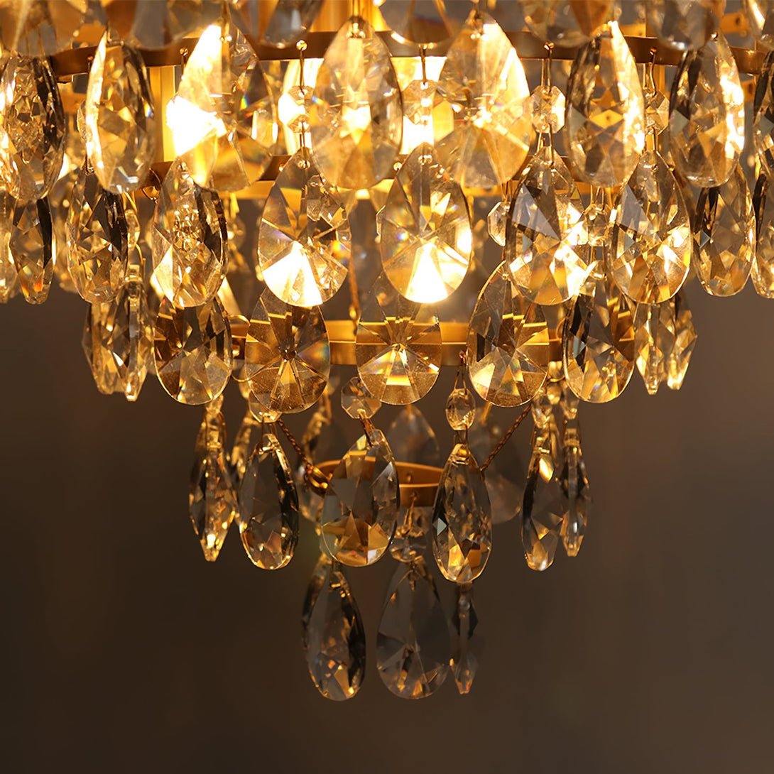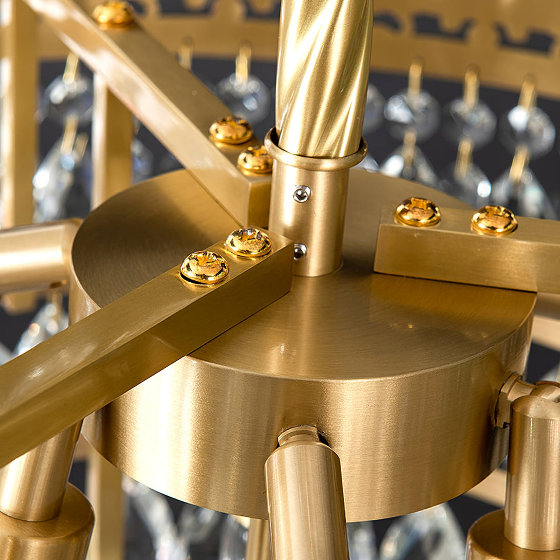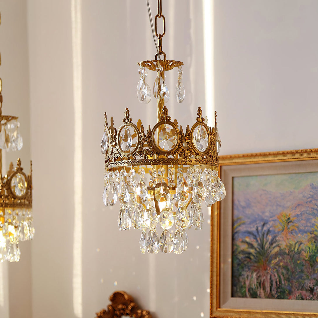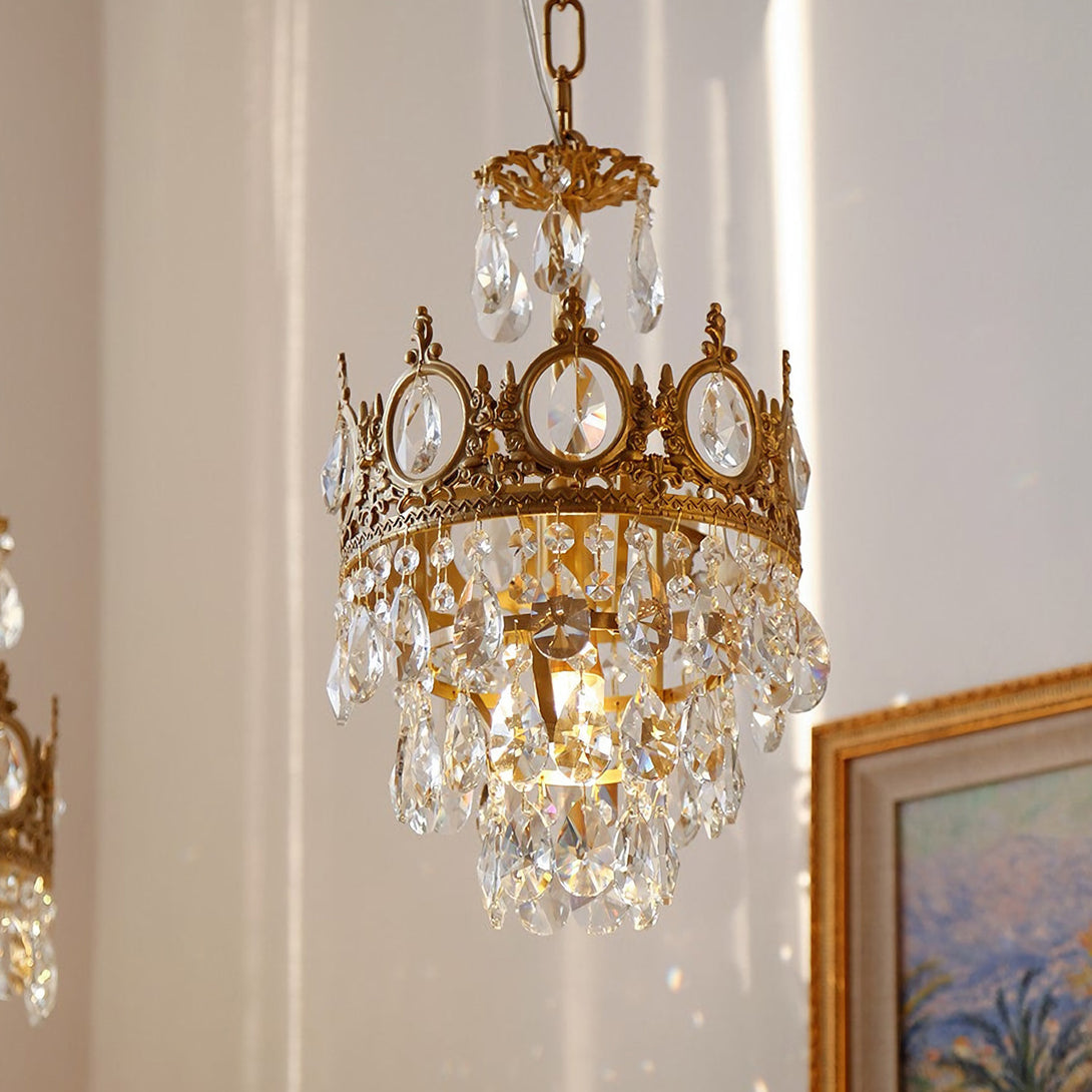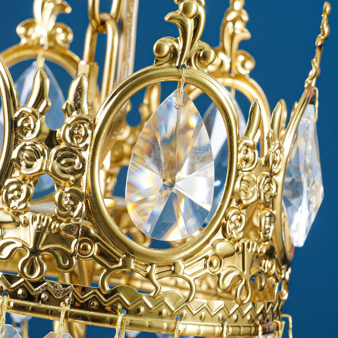 This magnificent Vintage Crystal Chandelier from korewolamp is a truly opulent and dramatic lighting piece. Its design is inspired by royal elegance, featuring a  structure that resembles an antique gold crown. Both tiers are elaborately detailed with ornate metalwork and circular glass or crystal medallions. Hundreds of clear, multi-faceted crystal prisms cascade down from the frame, creating a spectacular curtain of sparkle. The warm gold finish and the brilliant, shimmering crystals make this chandelier a breathtaking focal point, perfect for adding a sense of grandeur and luxury to a formal dining room, entryway, or ballroom.