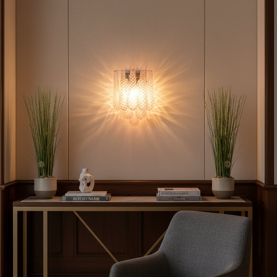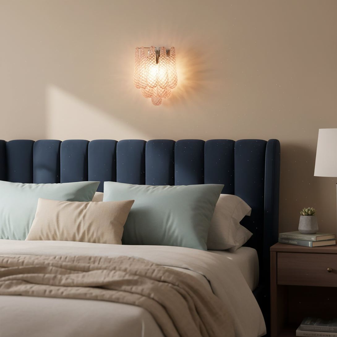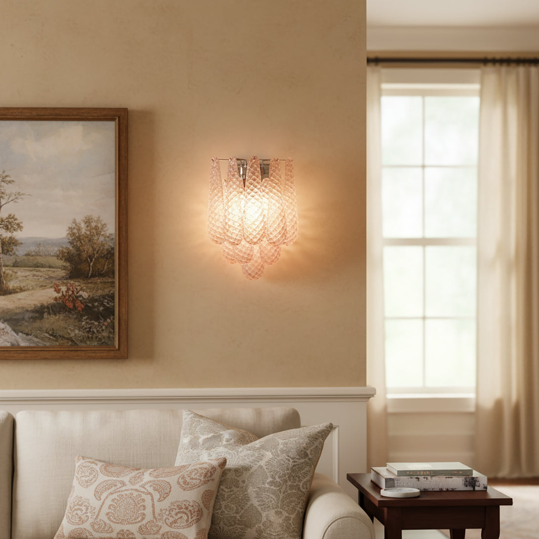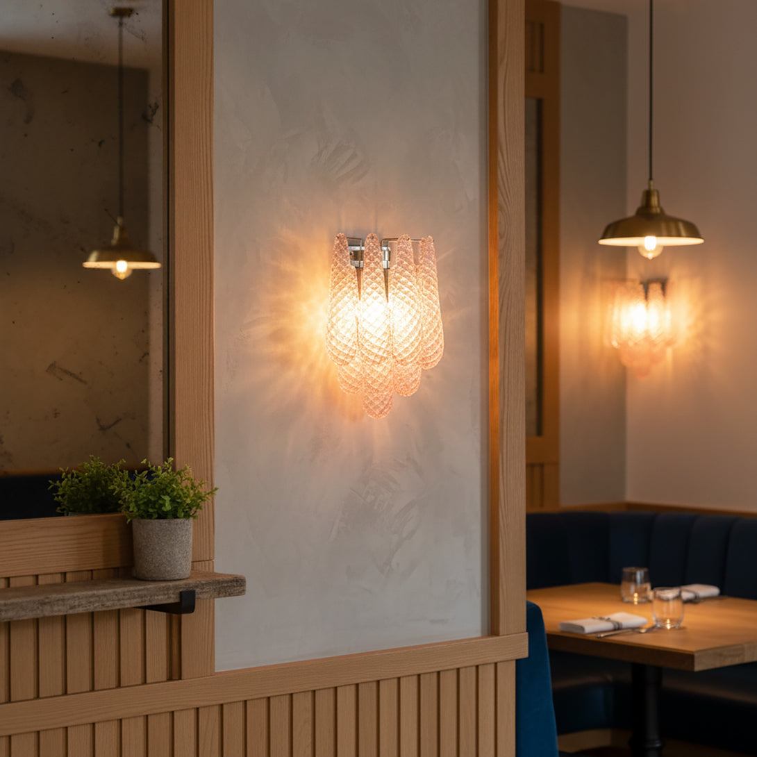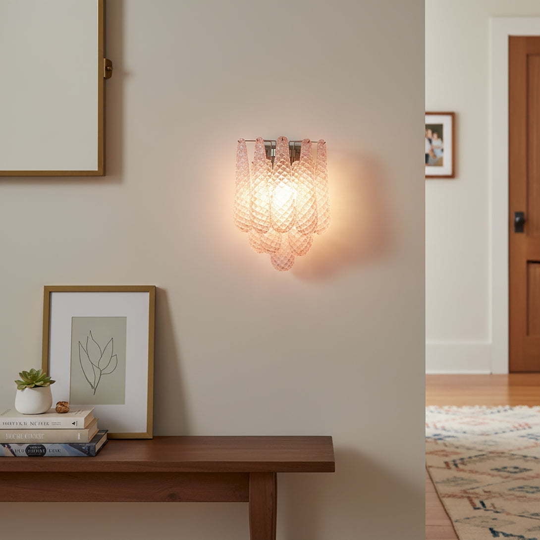 Illuminate your space with this elegant and captivating Murano Petals Glass Blue Wall Light! It perfectly blends glass art with tranquil ocean hues, adding a sophisticated and enchanting glow to your walls. The wall light is composed of multiple intricately crafted blue glass teardrop/petal elements. As light passes through, it creates a dazzling yet soft refraction effect.