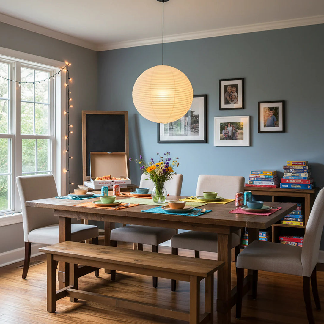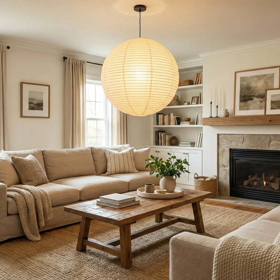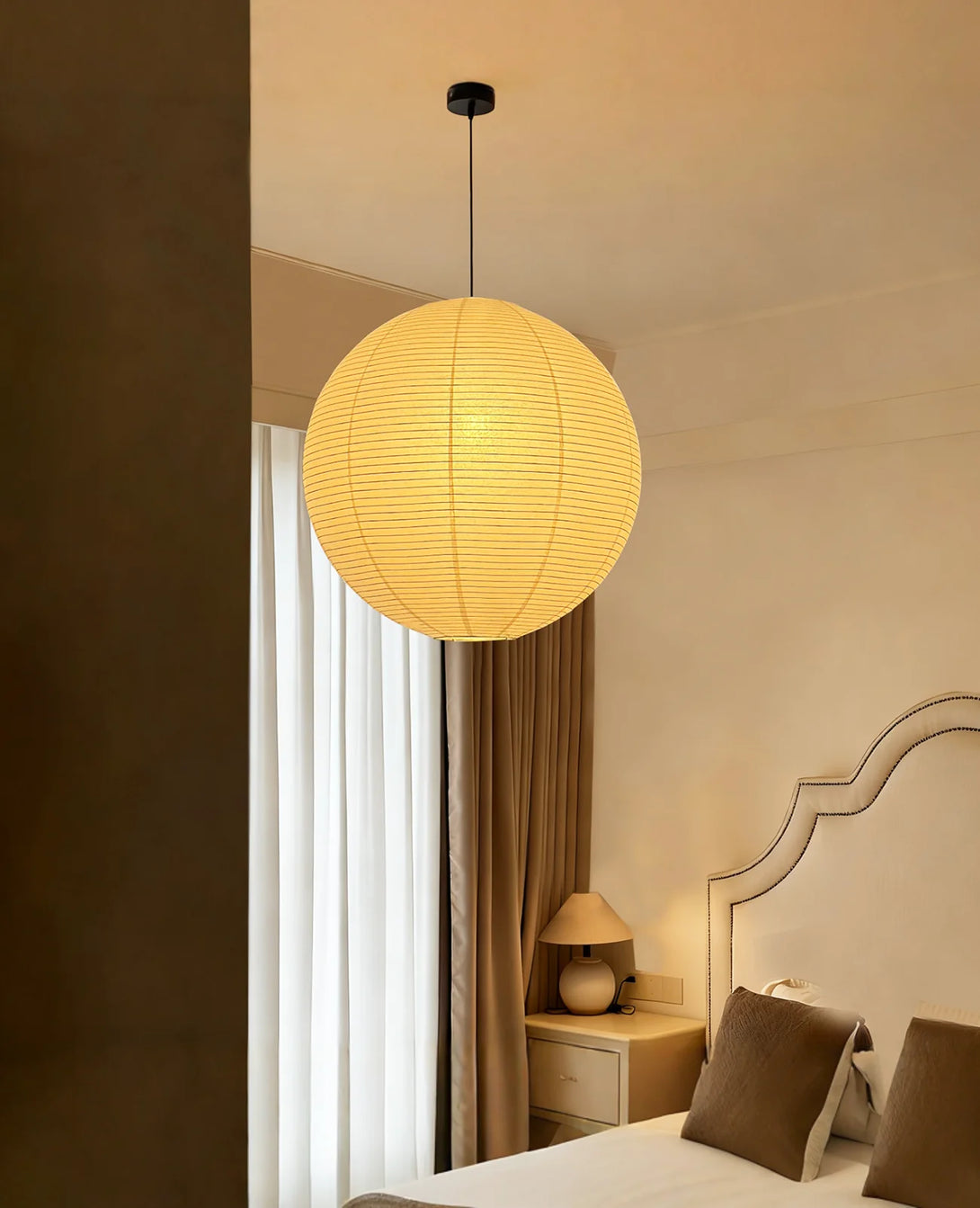 This pendant light, with its minimalist style and multiple sizes, precisely meets the needs of those seeking a natural, Zen-like, and wabi-sabi aesthetic: suitable for living rooms, bedrooms, cafes, studies, dining rooms, and kitchens. It offers a variety of sizes, including (30A, 40A, 50A, 55A, 60A, 70A, 75A, 80A, 90A, 100A, 120A), allowing selection based on different room requirements. The off-white paper lampshade easily complements various wood and linen home dΓ©cor materials, creating a natural and simple beauty. It perfectly blends artistic visuals with practical aesthetics, serving as both main lighting and ambient lighting to provide soft surrounding light.
