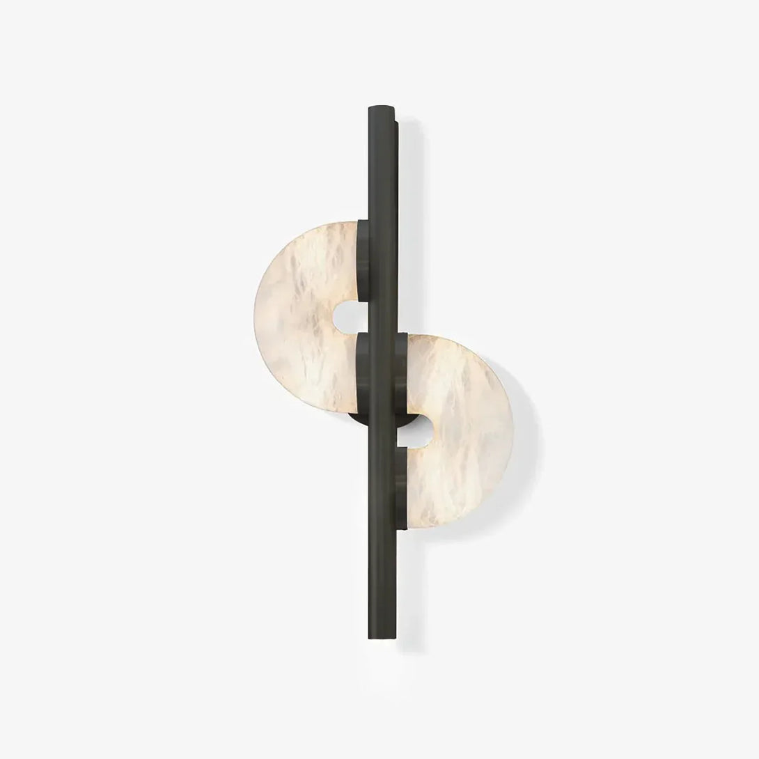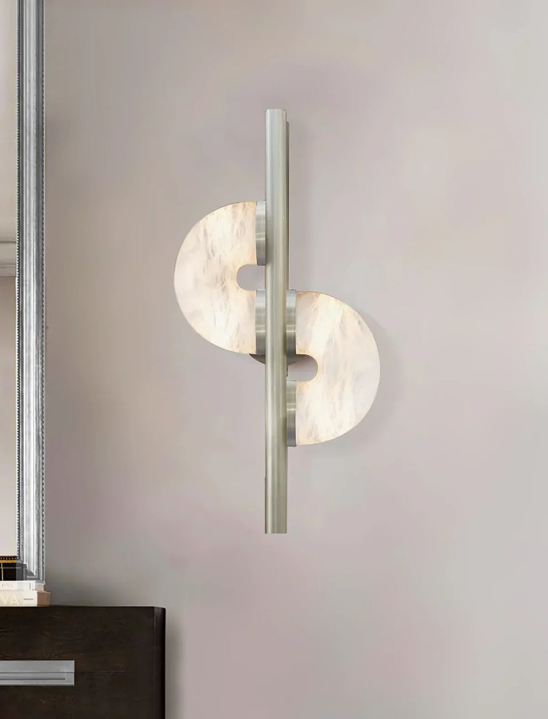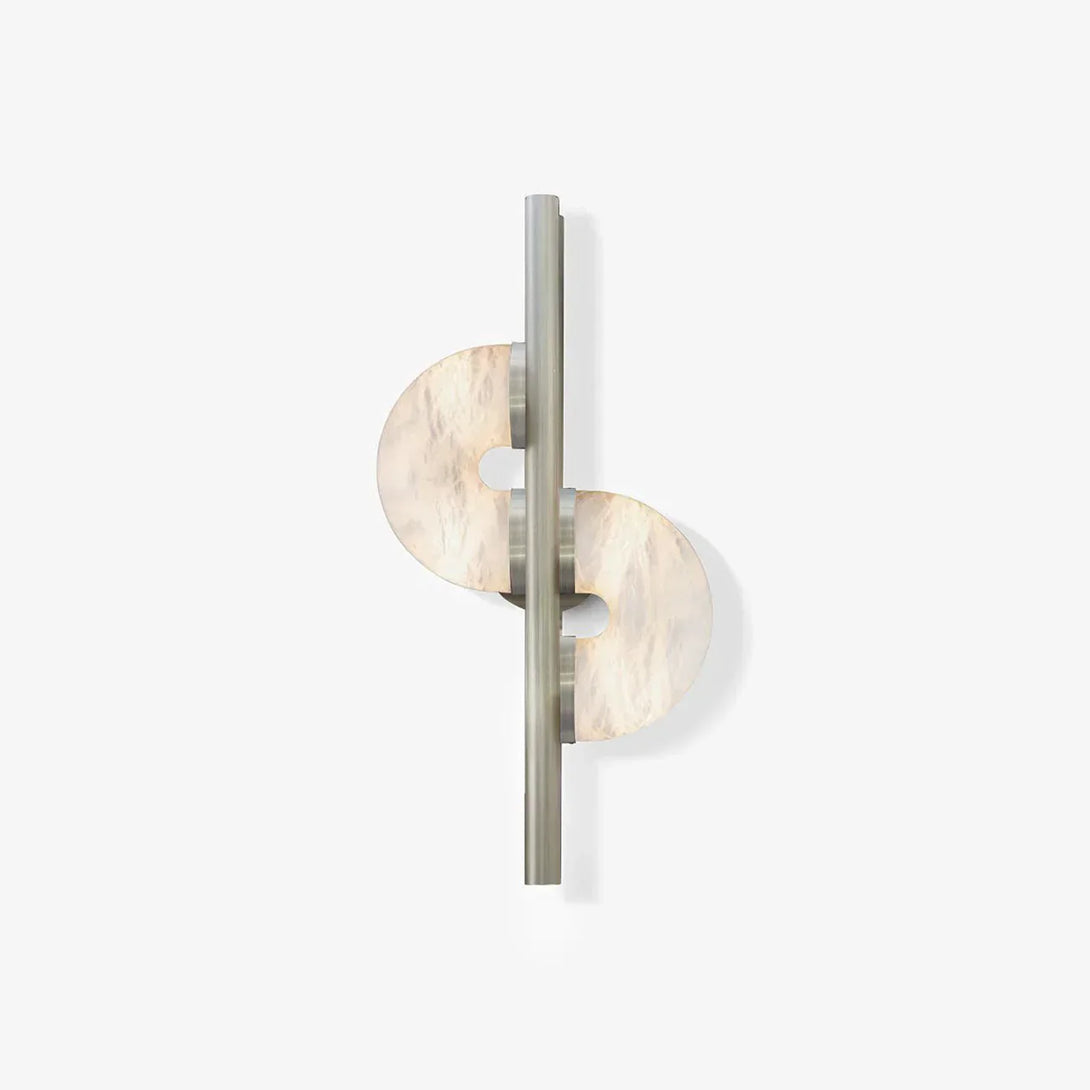 The Alabaster Dolly Wall Lamp merges the enduring beauty of alabaster with the durability and elegance of metal, casting a warm, gentle glow that fosters a peaceful atmosphere in any space. Its distinctive double-disk design features two alabaster stones that appear to float effortlessly, held securely by a streamlined vertical metal bar. The alabasterβs natural veining and translucency allow light to filter through, showcasing the stoneβs organic charm and creating a cozy, inviting ambiance.