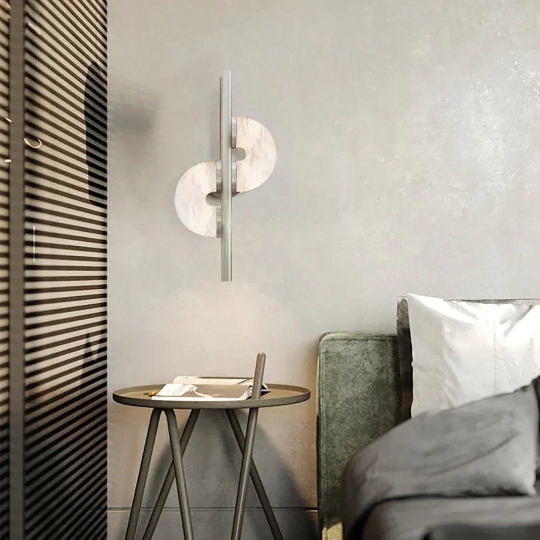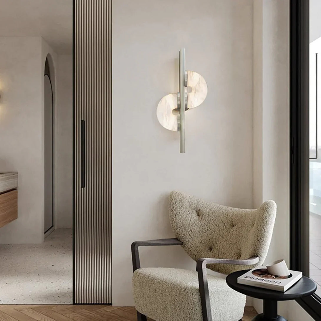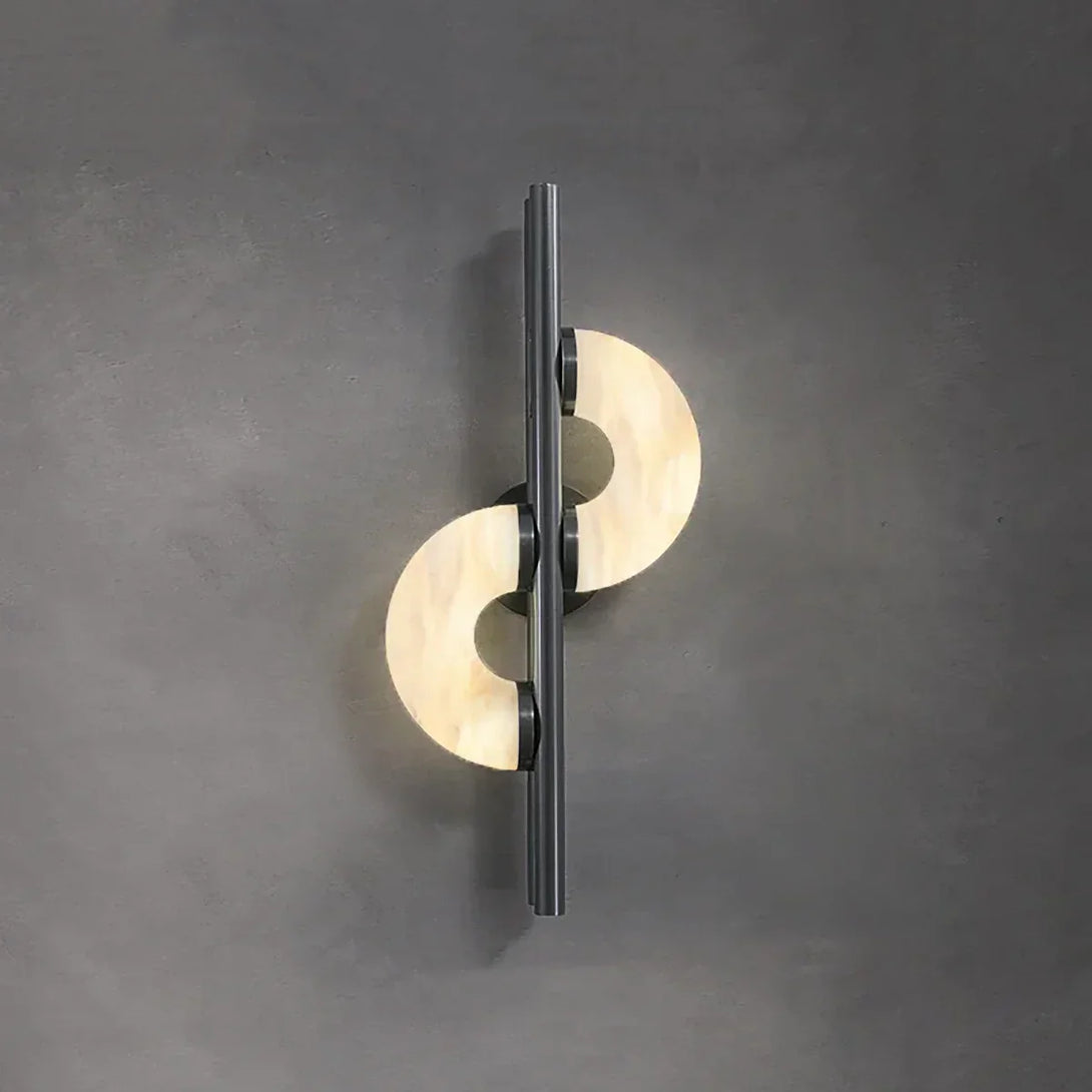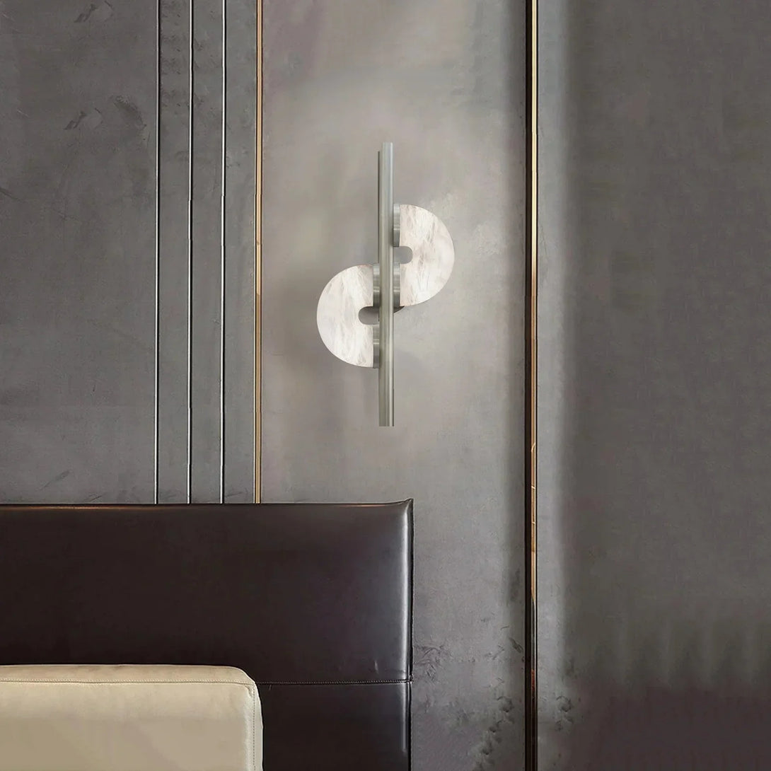 The Alabaster Dolly Wall Lamp merges the enduring beauty of alabaster with the durability and elegance of metal, casting a warm, gentle glow that fosters a peaceful atmosphere in any space. Its distinctive double-disk design features two alabaster stones that appear to float effortlessly, held securely by a streamlined vertical metal bar. The alabasterβs natural veining and translucency allow light to filter through, showcasing the stoneβs organic charm and creating a cozy, inviting ambiance.