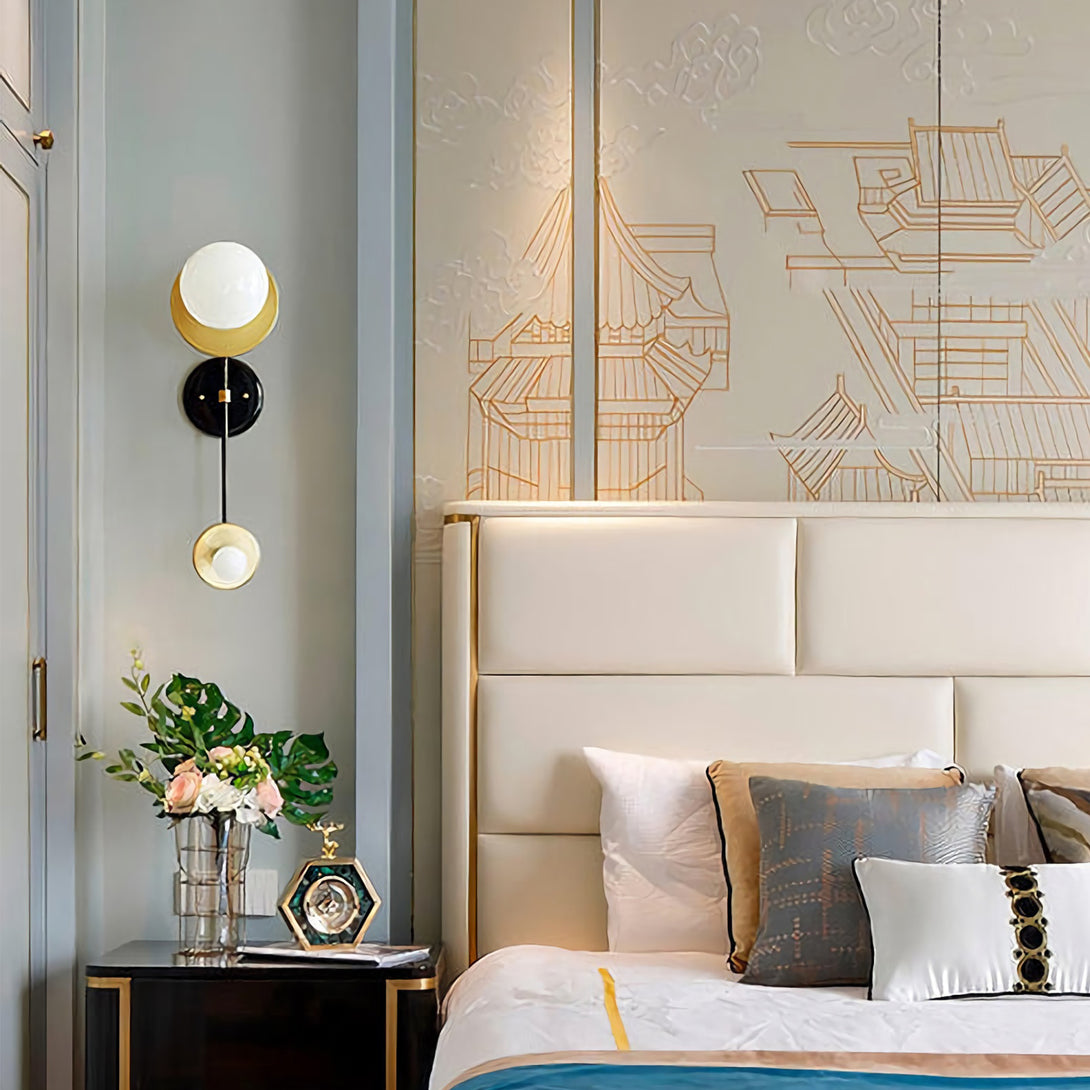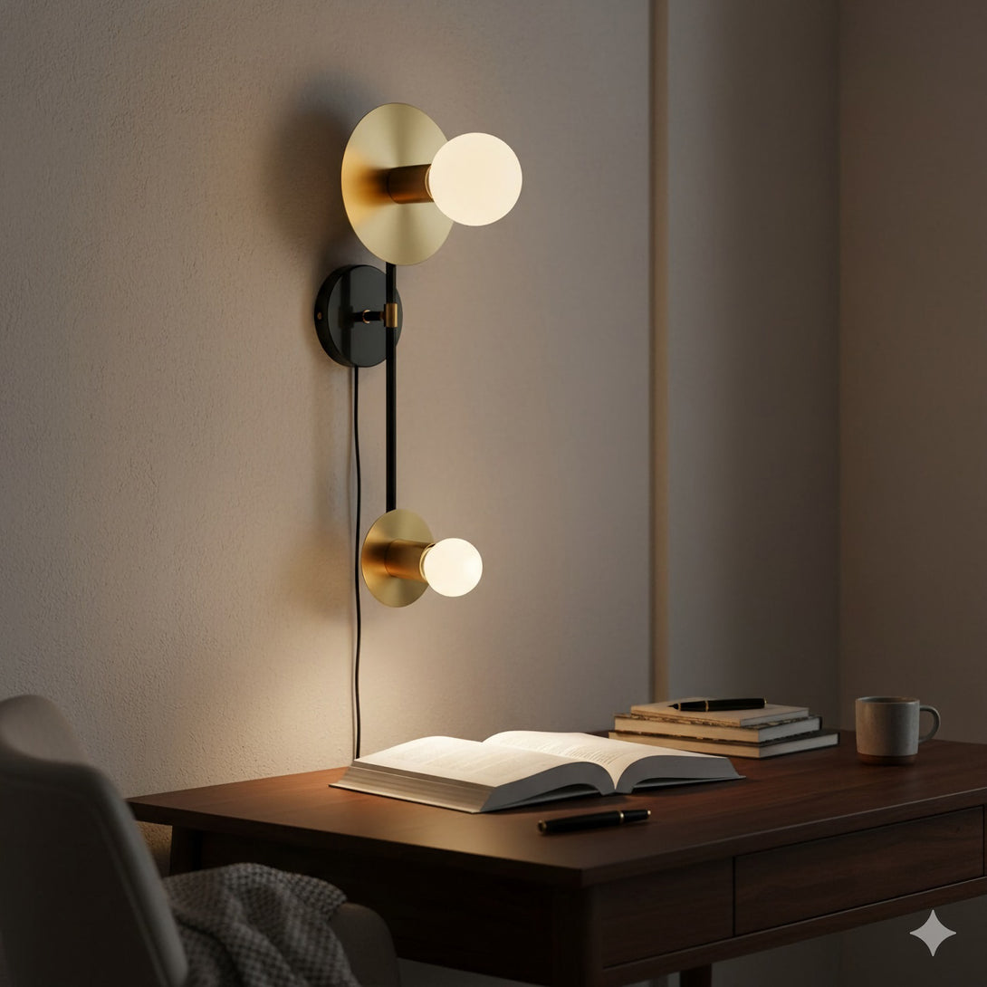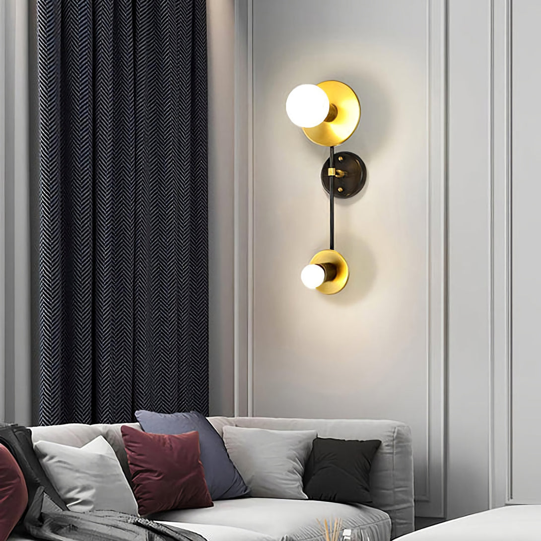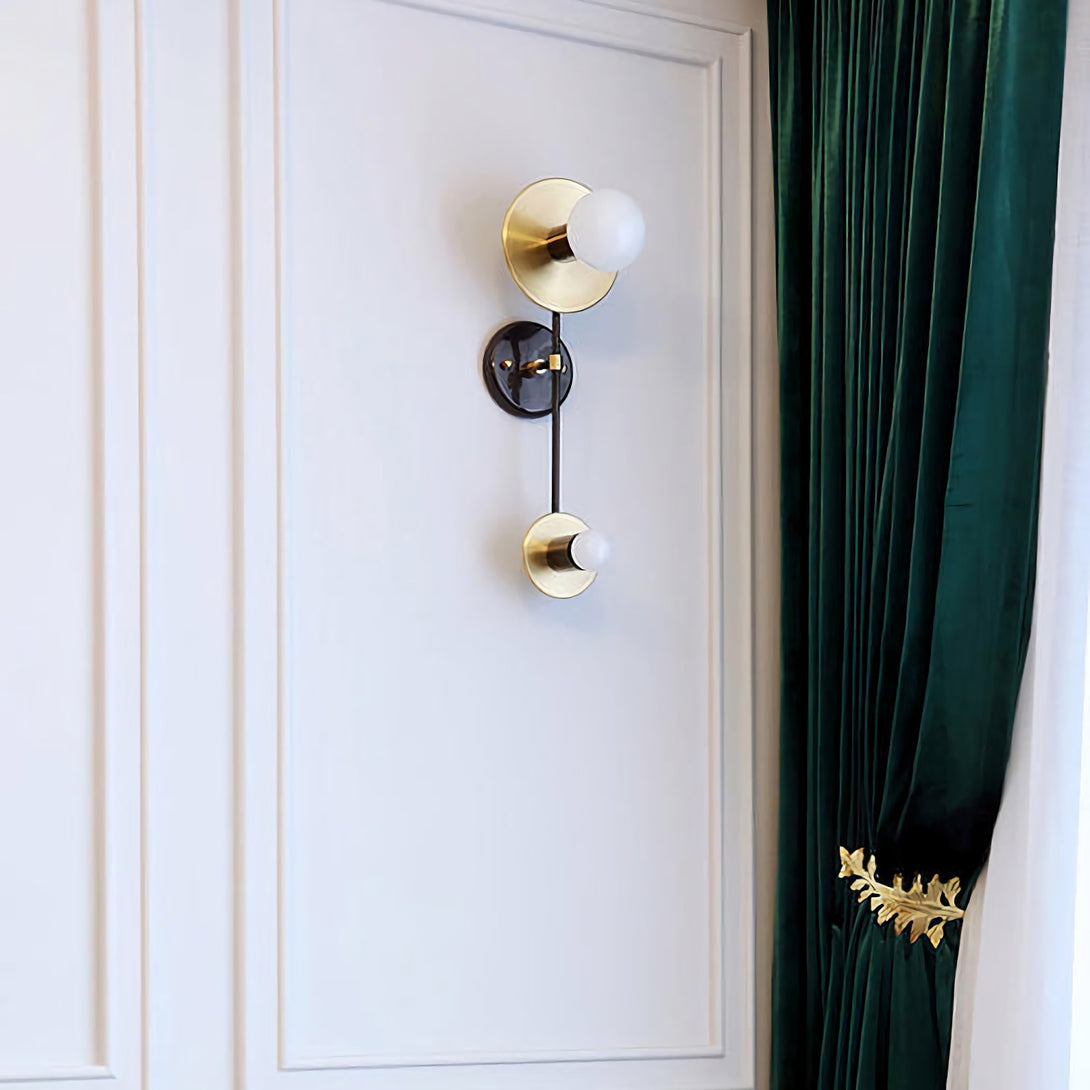 The Contemporary Geometric Composition Wall Lamp by korewolamp embodies modern artistry with functional elegance. Featuring a sleek vertical frame accented by golden discs and opal glass globes, it creates a striking interplay of geometry and light. The dual-light design offers soft, ambient illumination perfect for bedrooms, studies, or living areas, while the minimalist structure adds a sophisticated architectural touch. More than just a source of light, this wall lamp serves as a sculptural statement piece that elevates contemporary interiors.