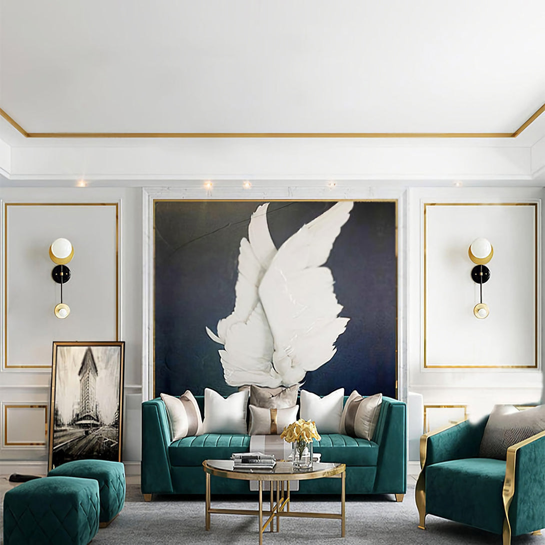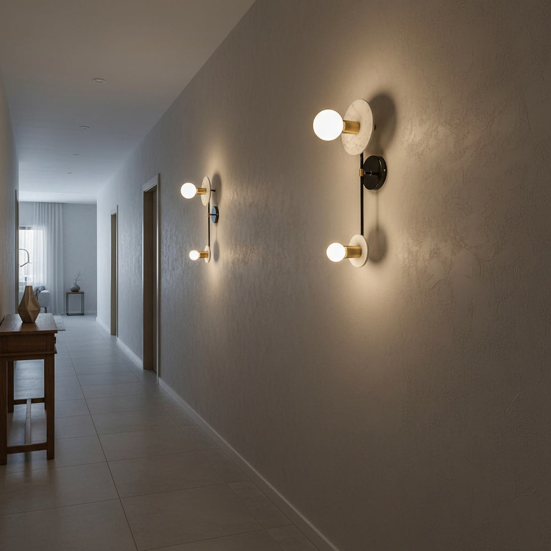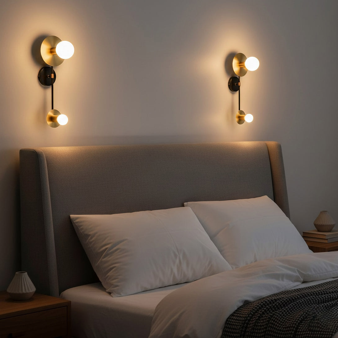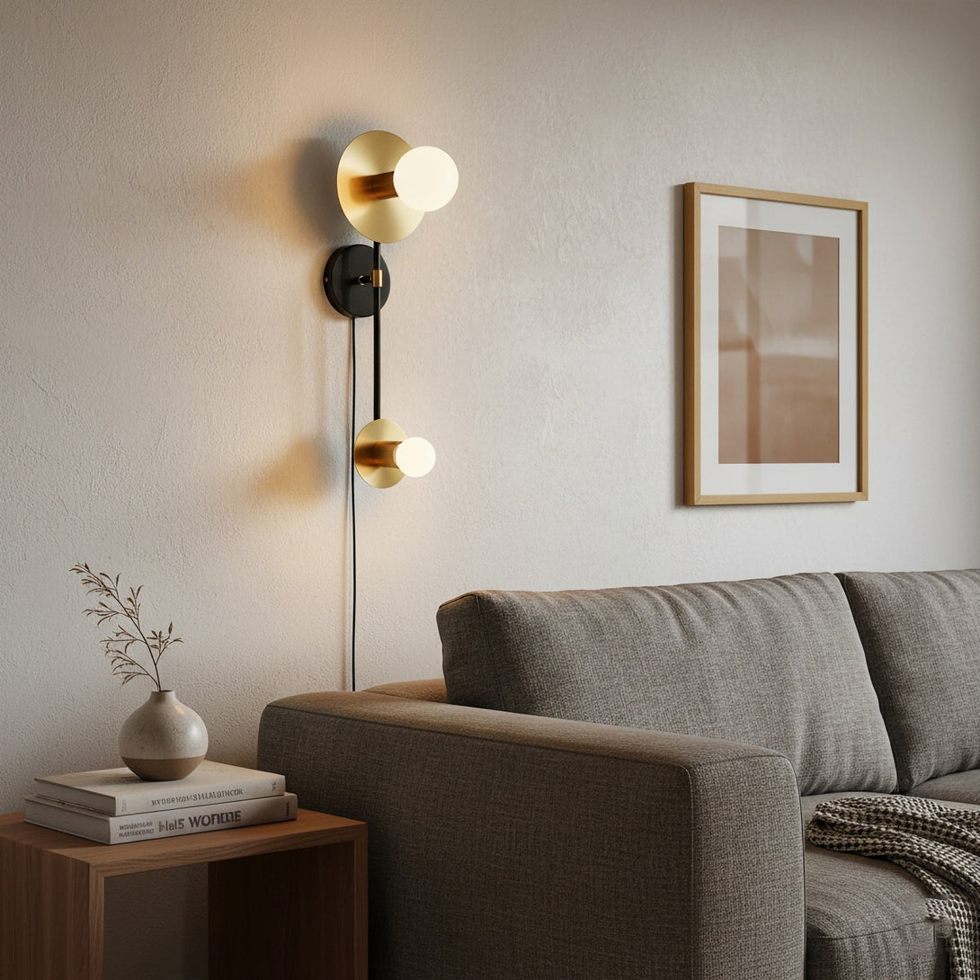 The Contemporary Geometric Composition Wall Lamp by korewolamp embodies modern artistry with functional elegance. Featuring a sleek vertical frame accented by golden discs and opal glass globes, it creates a striking interplay of geometry and light. The dual-light design offers soft, ambient illumination perfect for bedrooms, studies, or living areas, while the minimalist structure adds a sophisticated architectural touch. More than just a source of light, this wall lamp serves as a sculptural statement piece that elevates contemporary interiors.