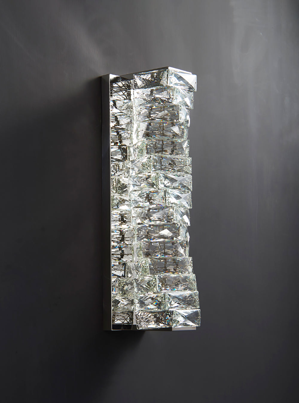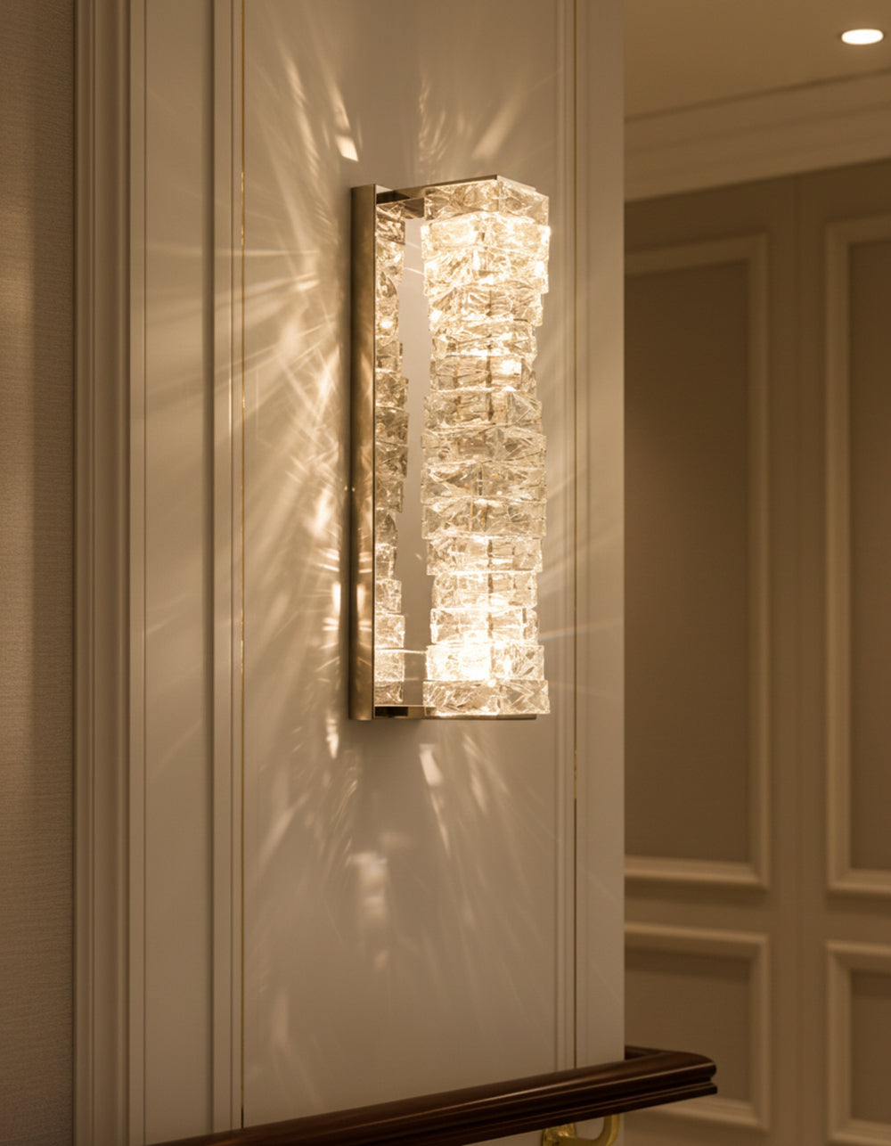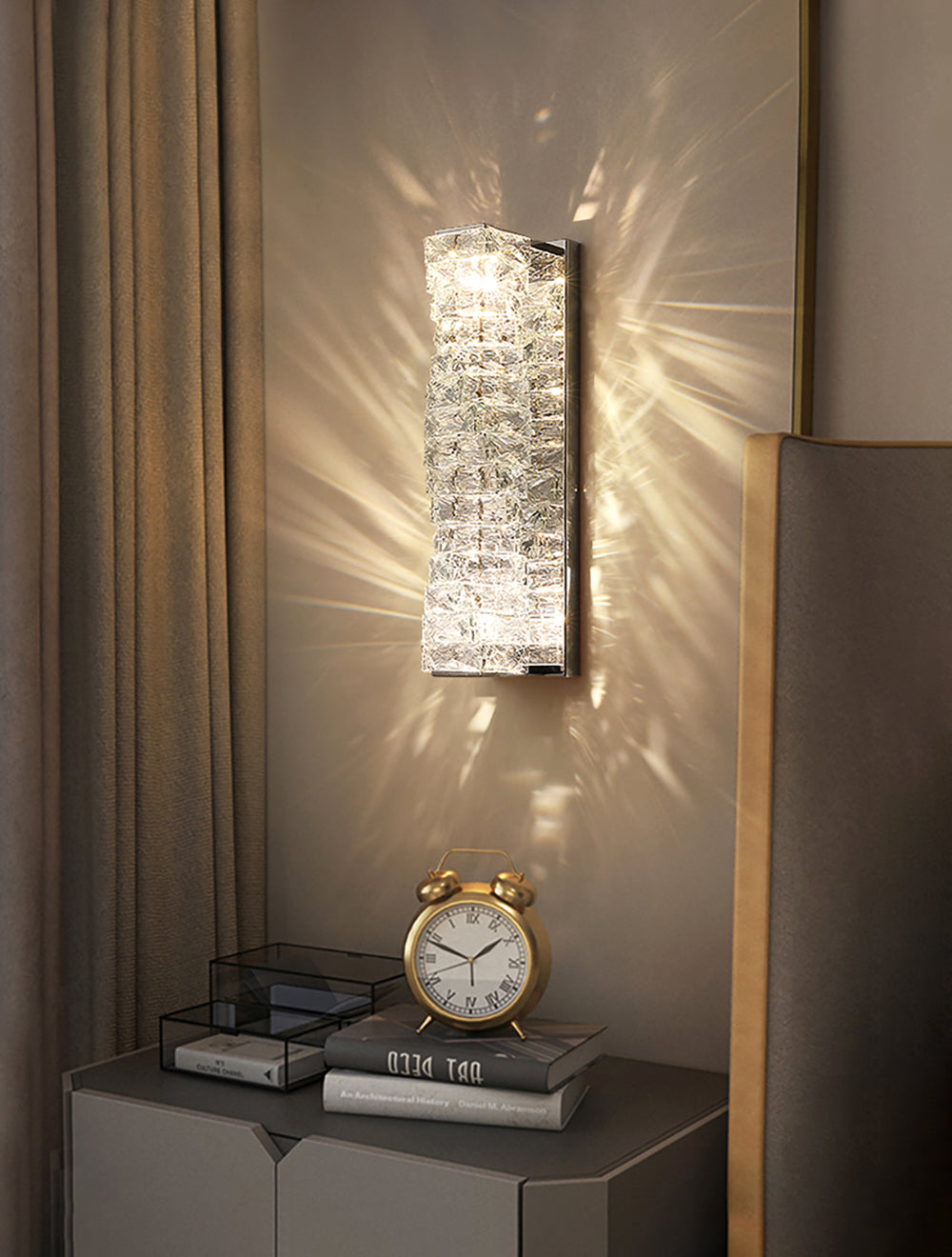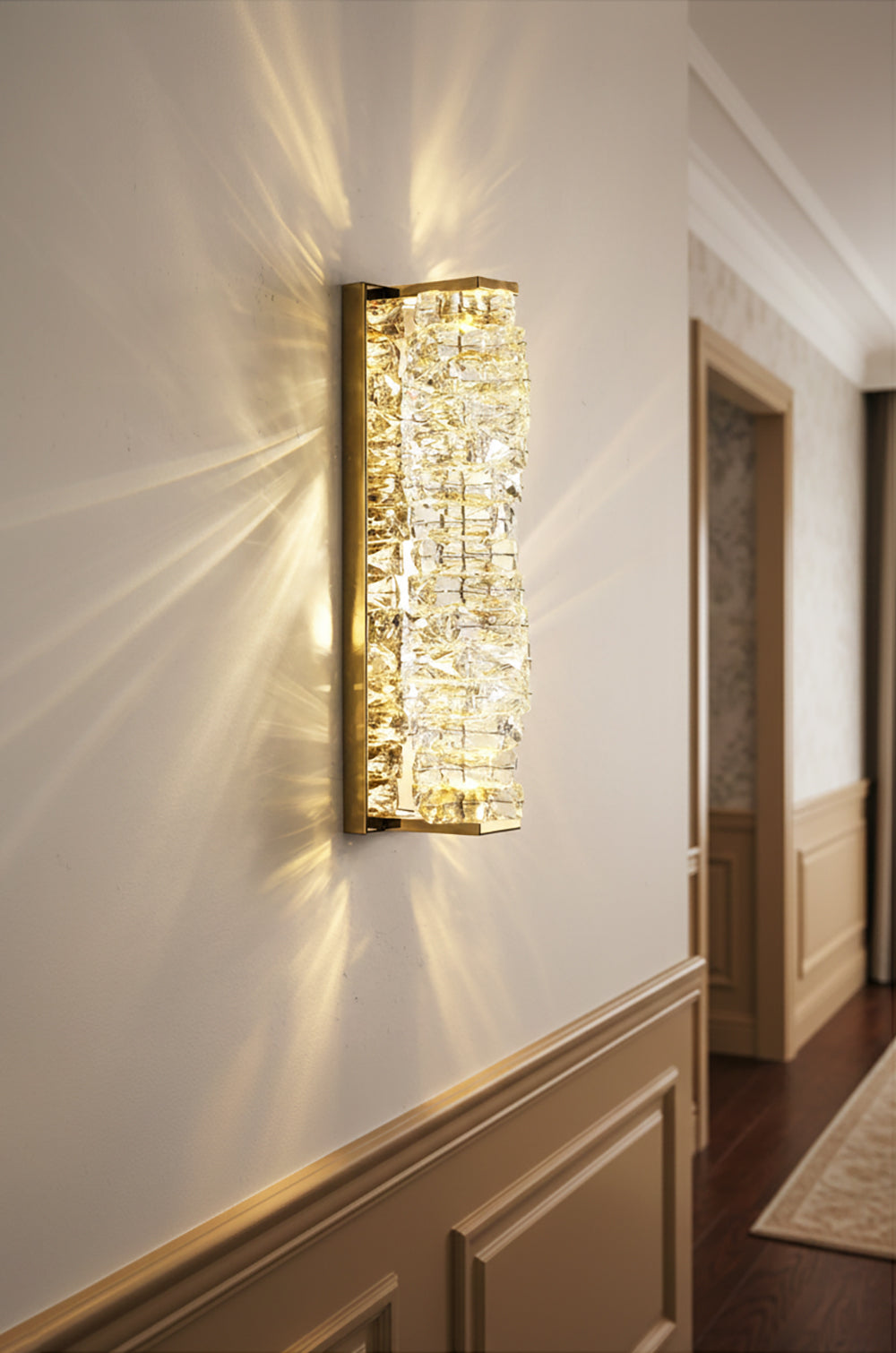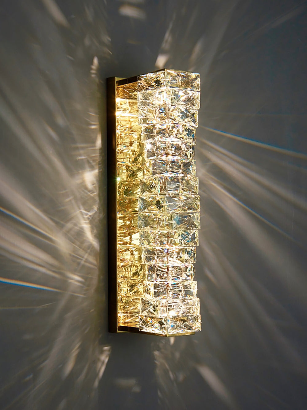 It perfectly complements modern minimalist, light luxury, or neoclassical interior design styles. Its vertical rectangular design makes it an ideal decorative wall lamp for either side of a feature wall, above a bedroom headboard, or in a hallway/foyer. Two finish options (gold and chrome) are available to suit different interior color schemes and themes. The unique crystal structure scatters light into captivating beams and shadows, adding soft yet dazzling background light to the room and creating a romantic atmosphere.