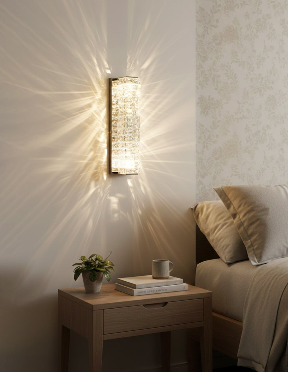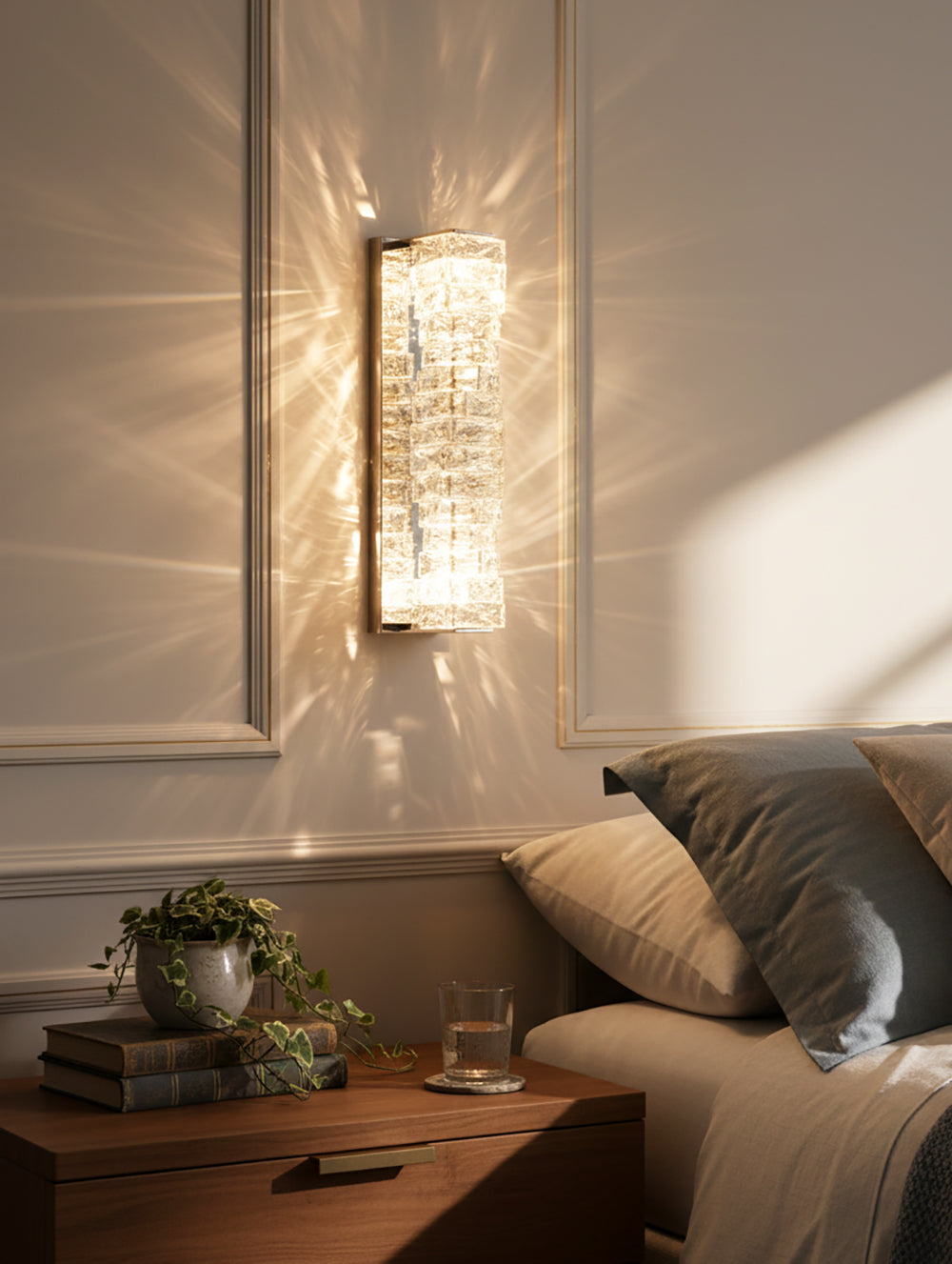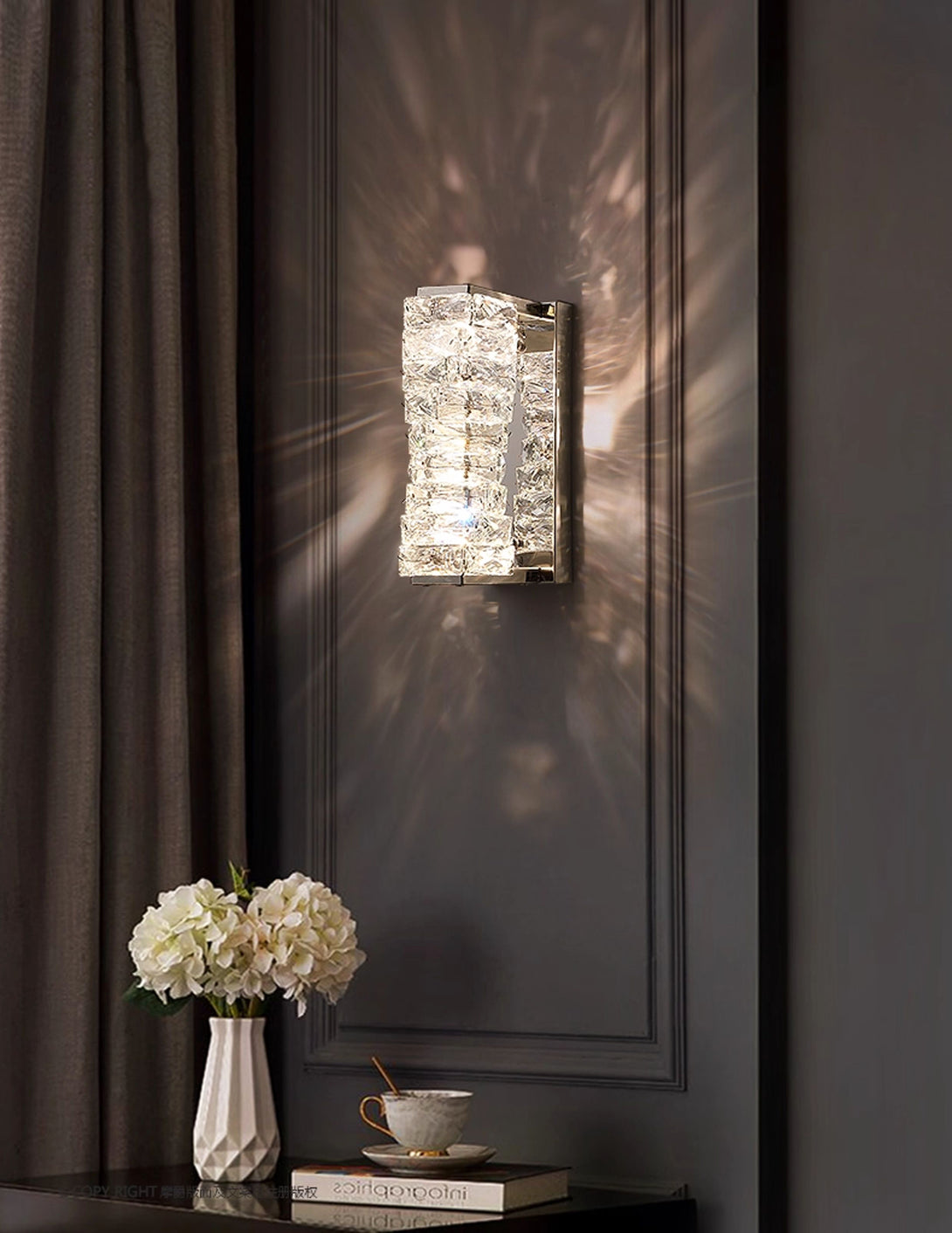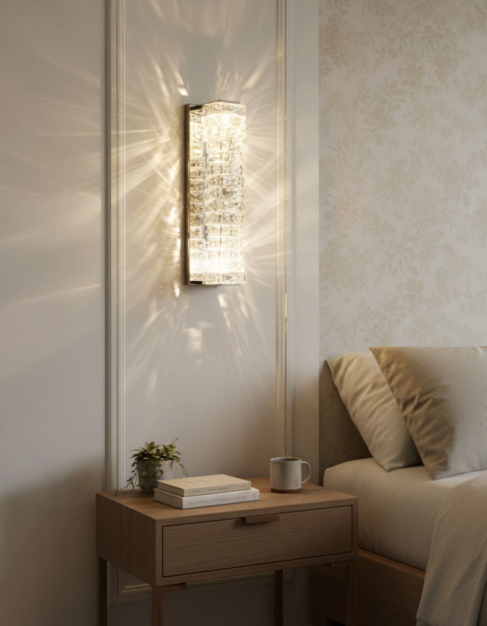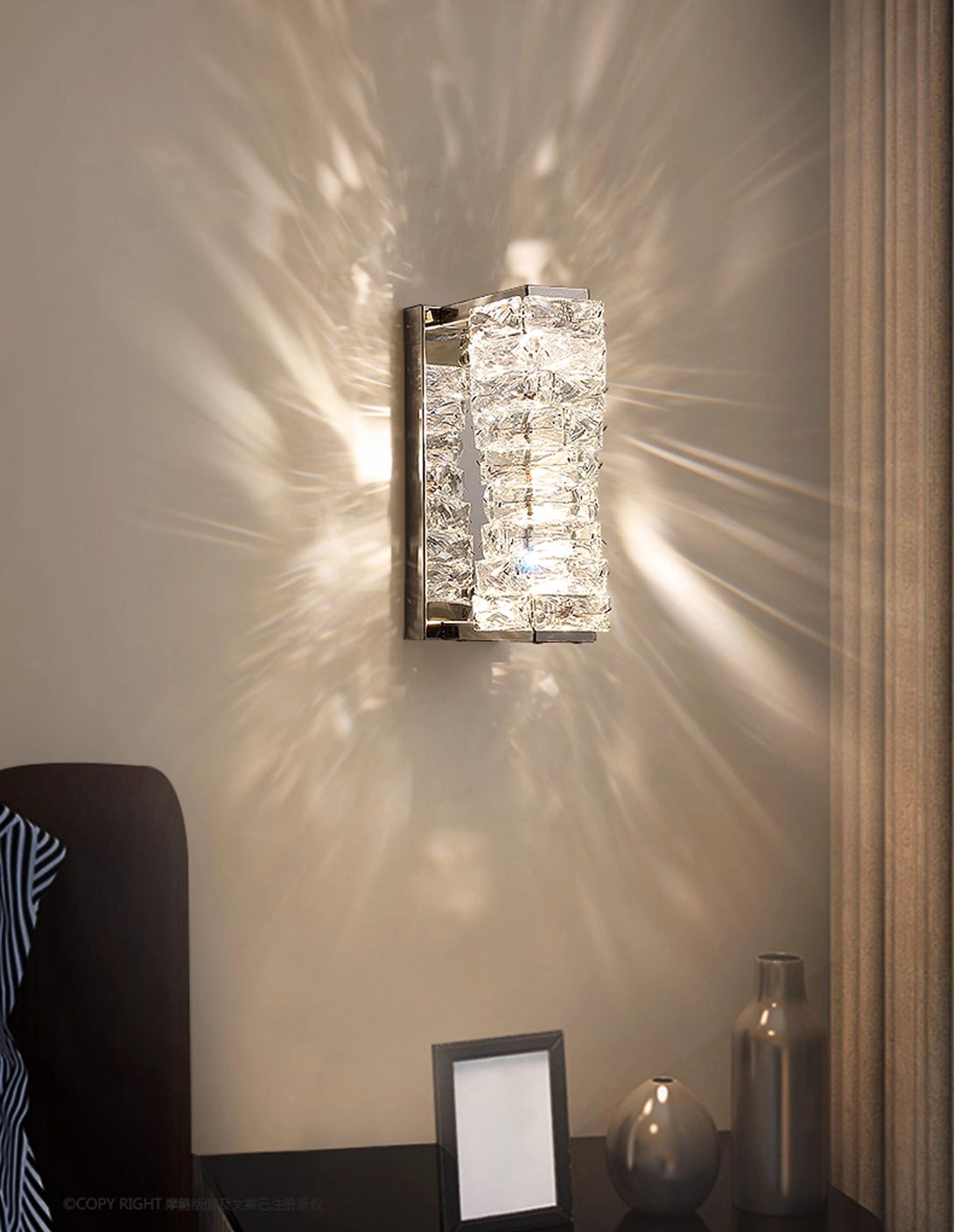 It perfectly complements modern minimalist, light luxury, or neoclassical interior design styles. Its vertical rectangular design makes it an ideal decorative wall lamp for either side of a feature wall, above a bedroom headboard, or in a hallway/foyer. Two finish options (gold and chrome) are available to suit different interior color schemes and themes. The unique crystal structure scatters light into captivating beams and shadows, adding soft yet dazzling background light to the room and creating a romantic atmosphere.