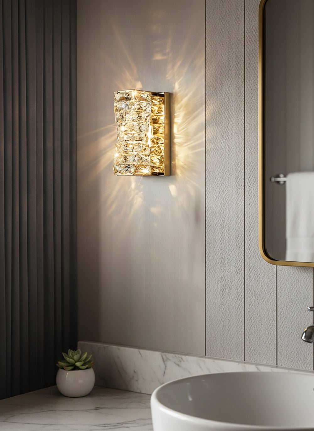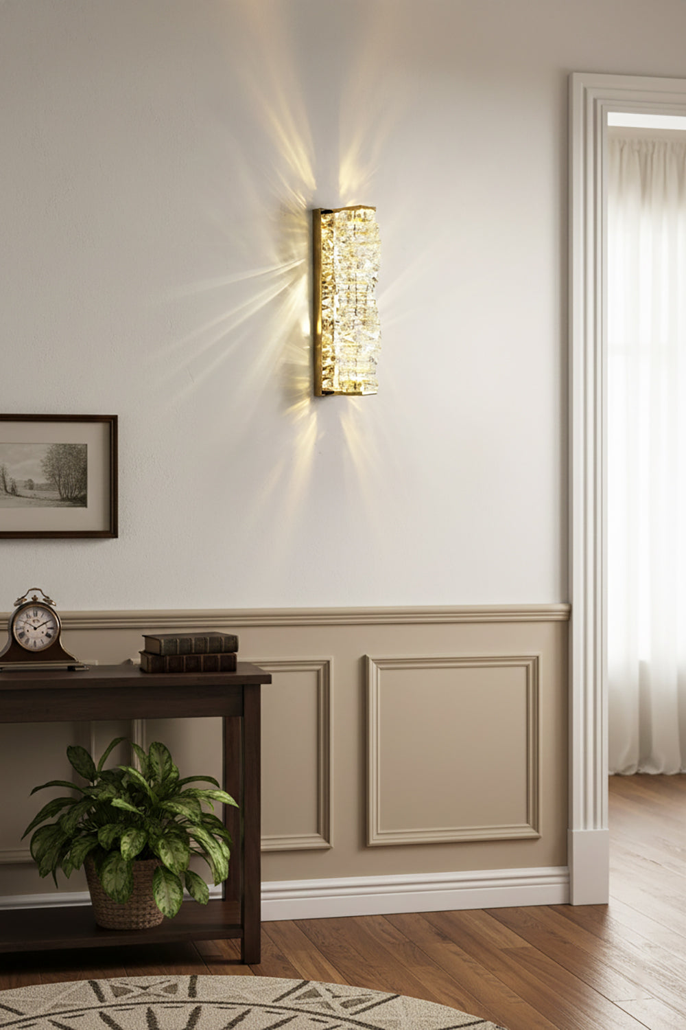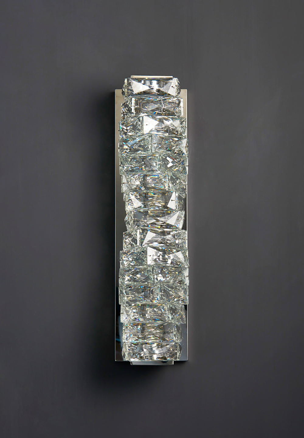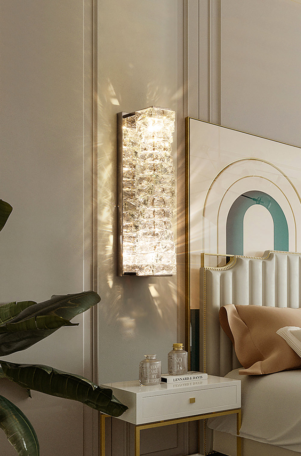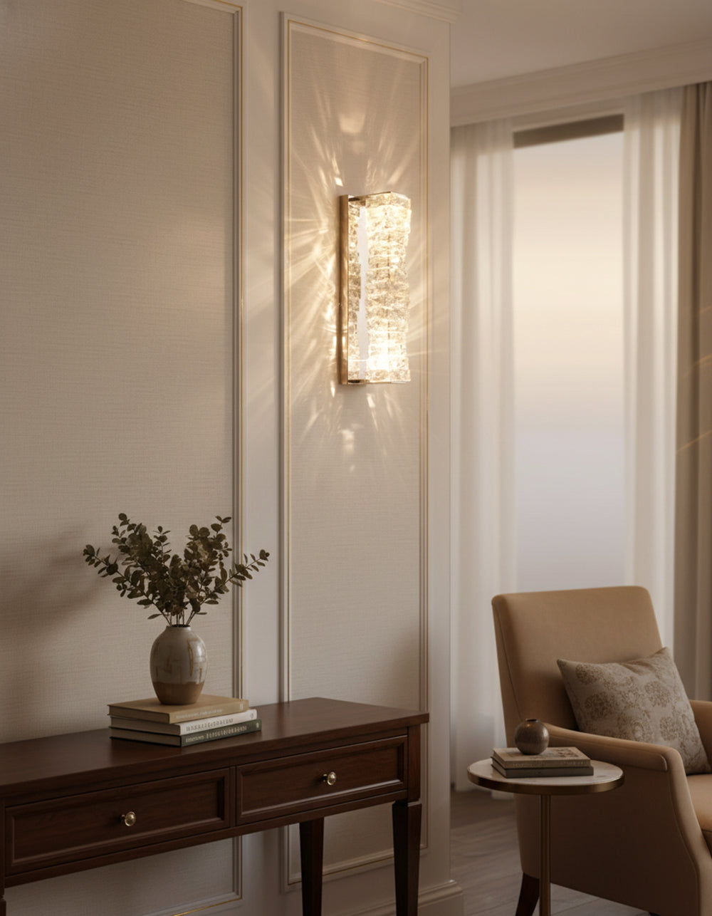 It perfectly complements modern minimalist, light luxury, or neoclassical interior design styles. Its vertical rectangular design makes it an ideal decorative wall lamp for either side of a feature wall, above a bedroom headboard, or in a hallway/foyer. Two finish options (gold and chrome) are available to suit different interior color schemes and themes. The unique crystal structure scatters light into captivating beams and shadows, adding soft yet dazzling background light to the room and creating a romantic atmosphere.