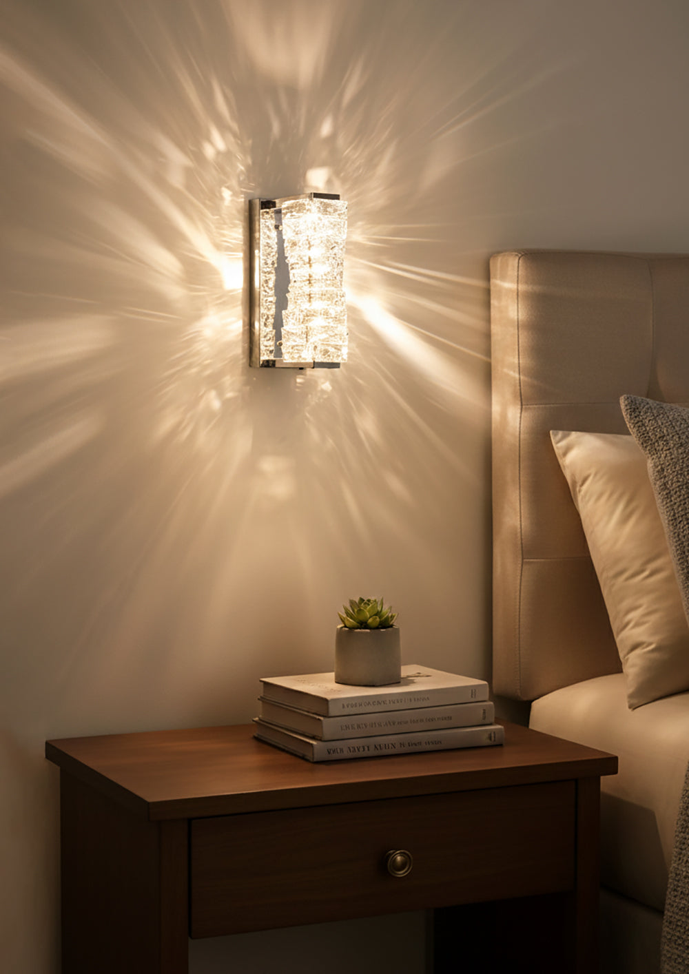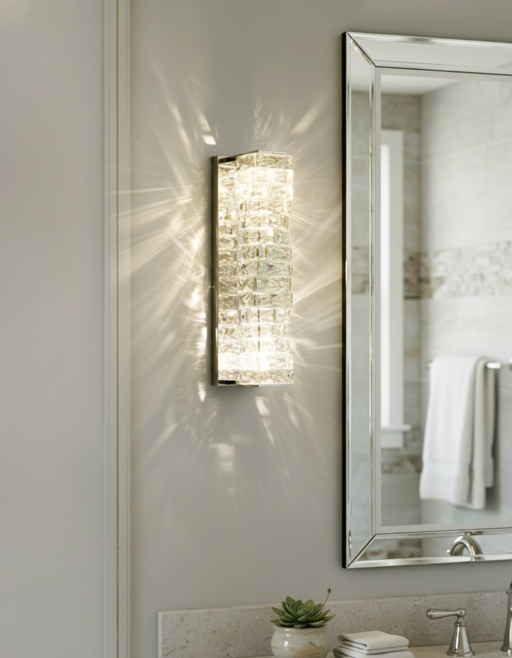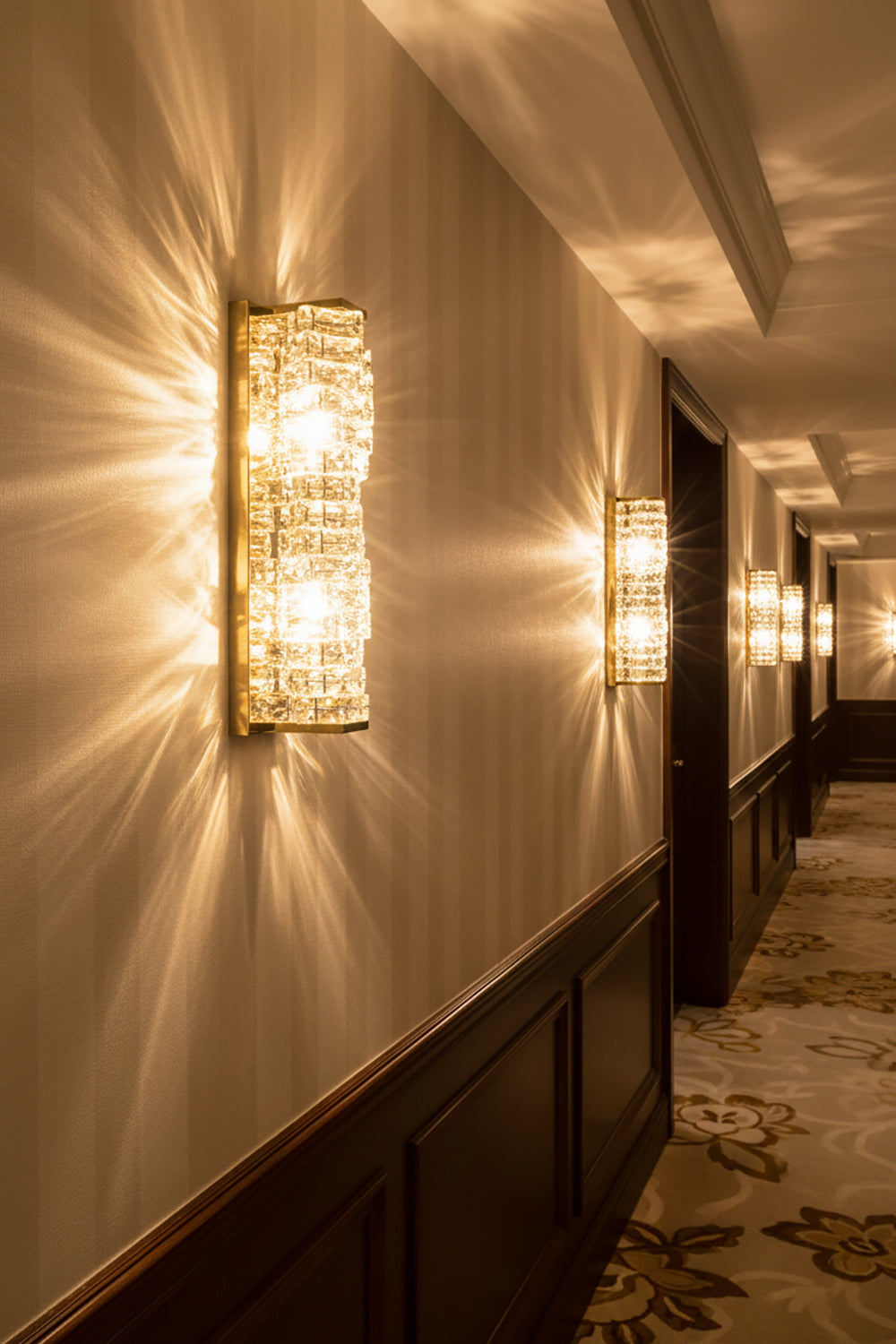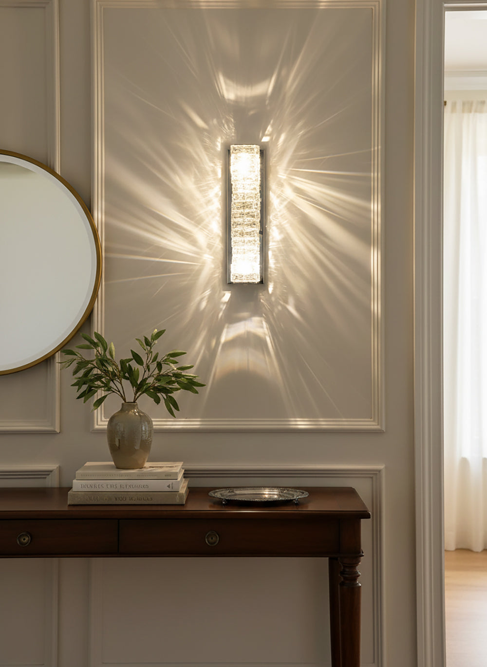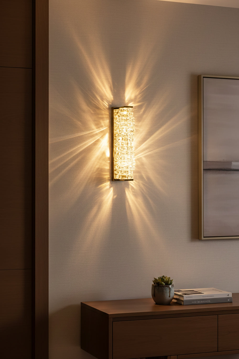 It perfectly complements modern minimalist, light luxury, or neoclassical interior design styles. Its vertical rectangular design makes it an ideal decorative wall lamp for either side of a feature wall, above a bedroom headboard, or in a hallway/foyer. Two finish options (gold and chrome) are available to suit different interior color schemes and themes. The unique crystal structure scatters light into captivating beams and shadows, adding soft yet dazzling background light to the room and creating a romantic atmosphere.
