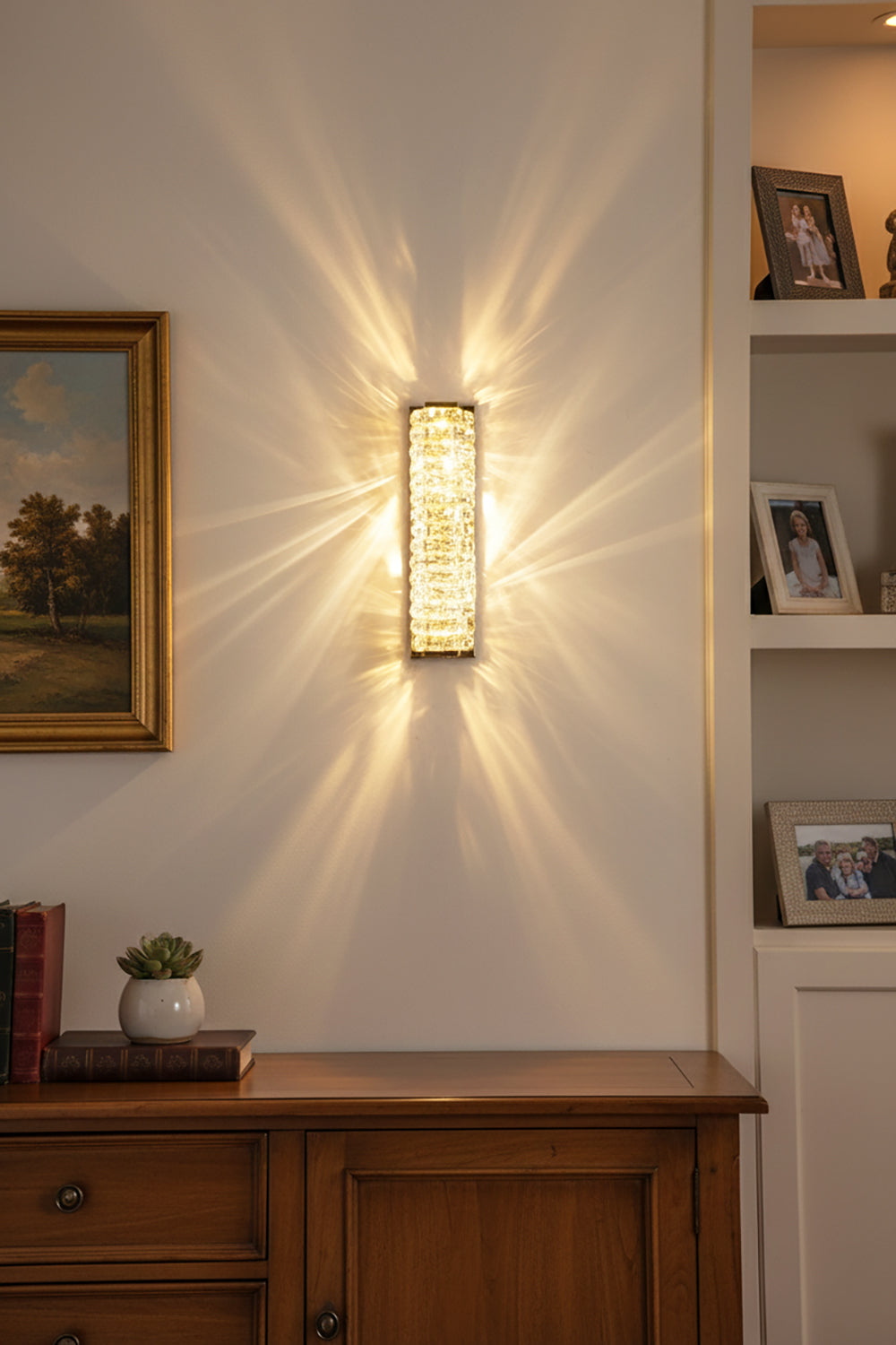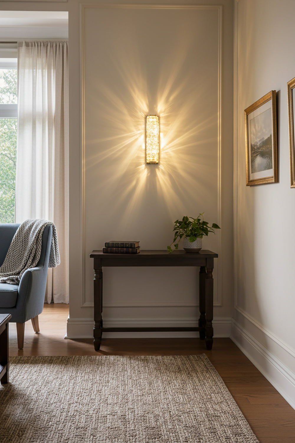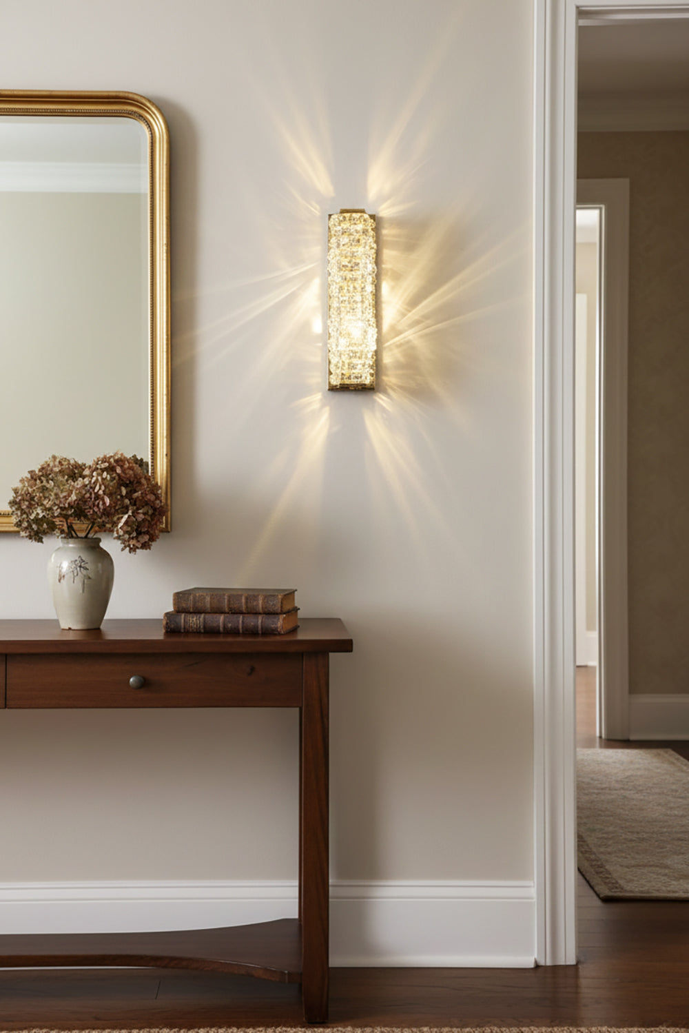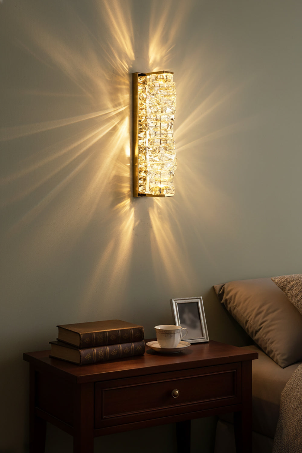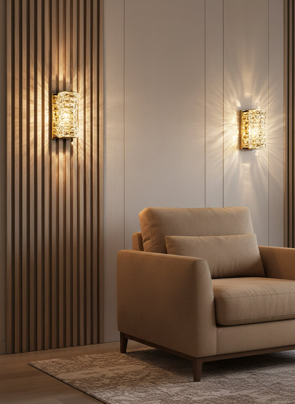 It perfectly complements modern minimalist, light luxury, or neoclassical interior design styles. Its vertical rectangular design makes it an ideal decorative wall lamp for either side of a feature wall, above a bedroom headboard, or in a hallway/foyer. Two finish options (gold and chrome) are available to suit different interior color schemes and themes. The unique crystal structure scatters light into captivating beams and shadows, adding soft yet dazzling background light to the room and creating a romantic atmosphere.