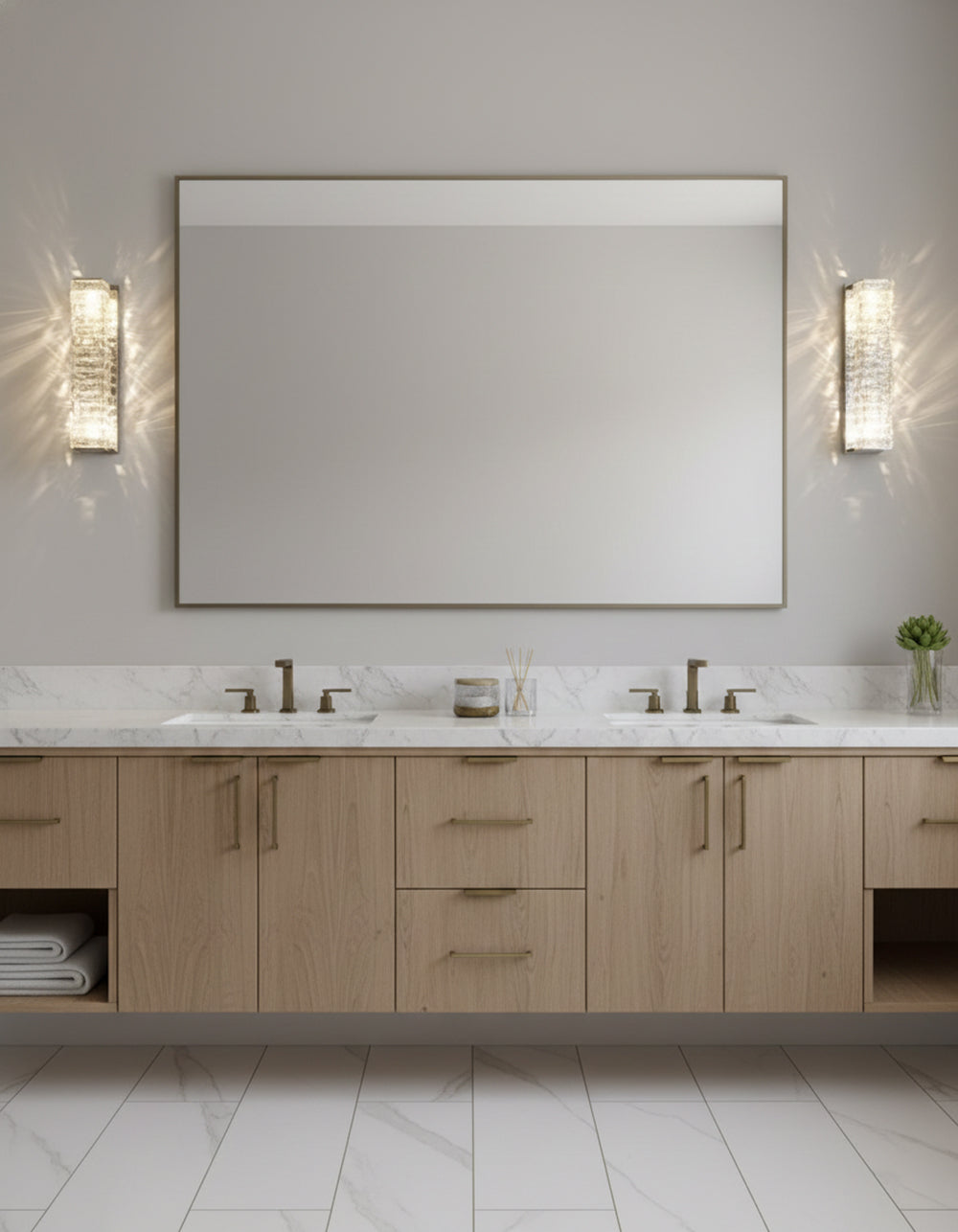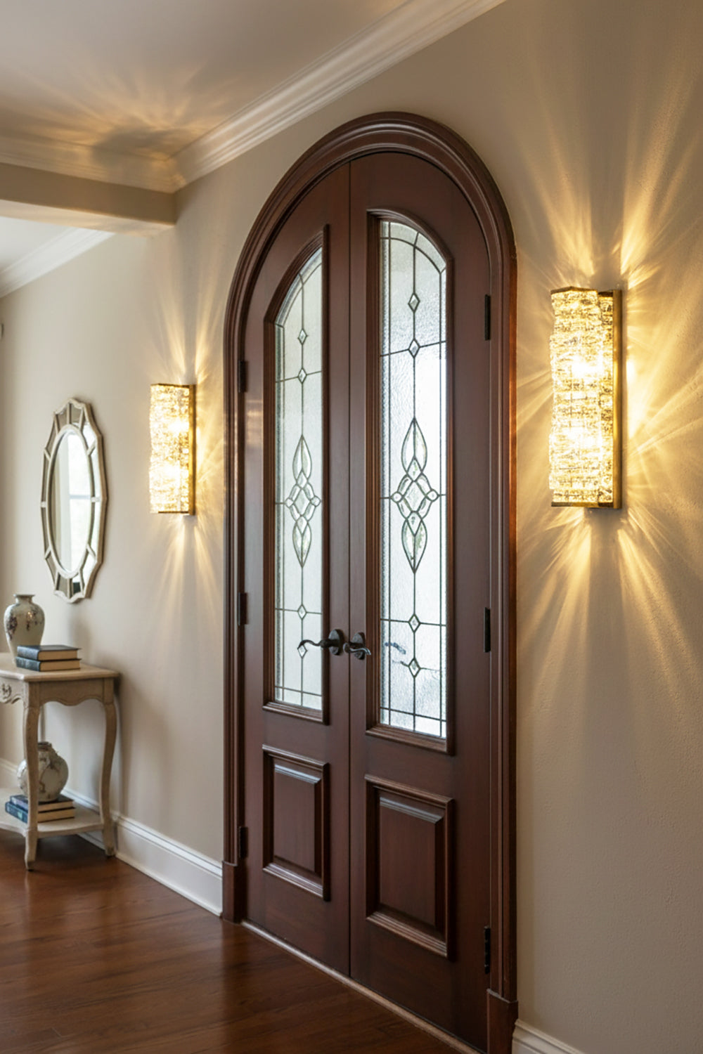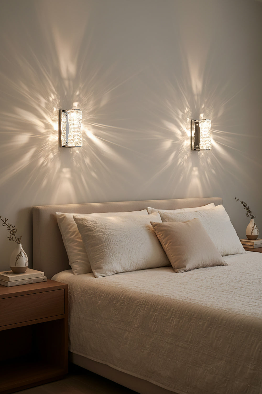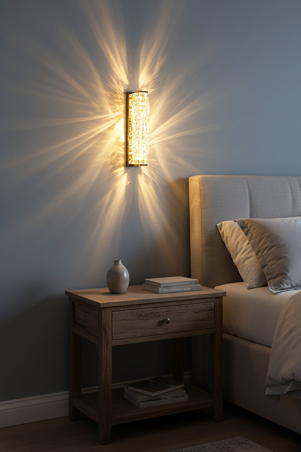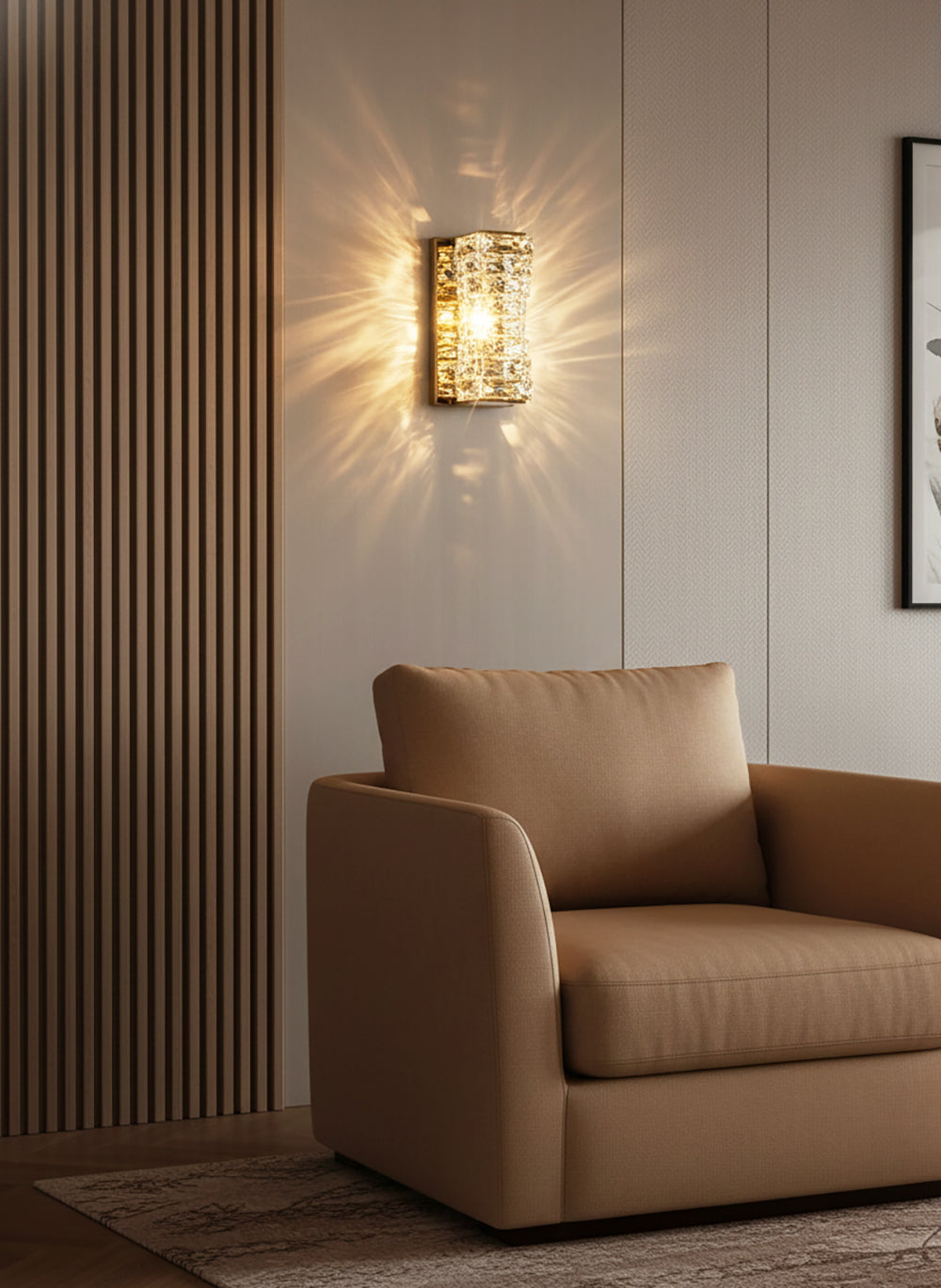 It perfectly complements modern minimalist, light luxury, or neoclassical interior design styles. Its vertical rectangular design makes it an ideal decorative wall lamp for either side of a feature wall, above a bedroom headboard, or in a hallway/foyer. Two finish options (gold and chrome) are available to suit different interior color schemes and themes. The unique crystal structure scatters light into captivating beams and shadows, adding soft yet dazzling background light to the room and creating a romantic atmosphere.