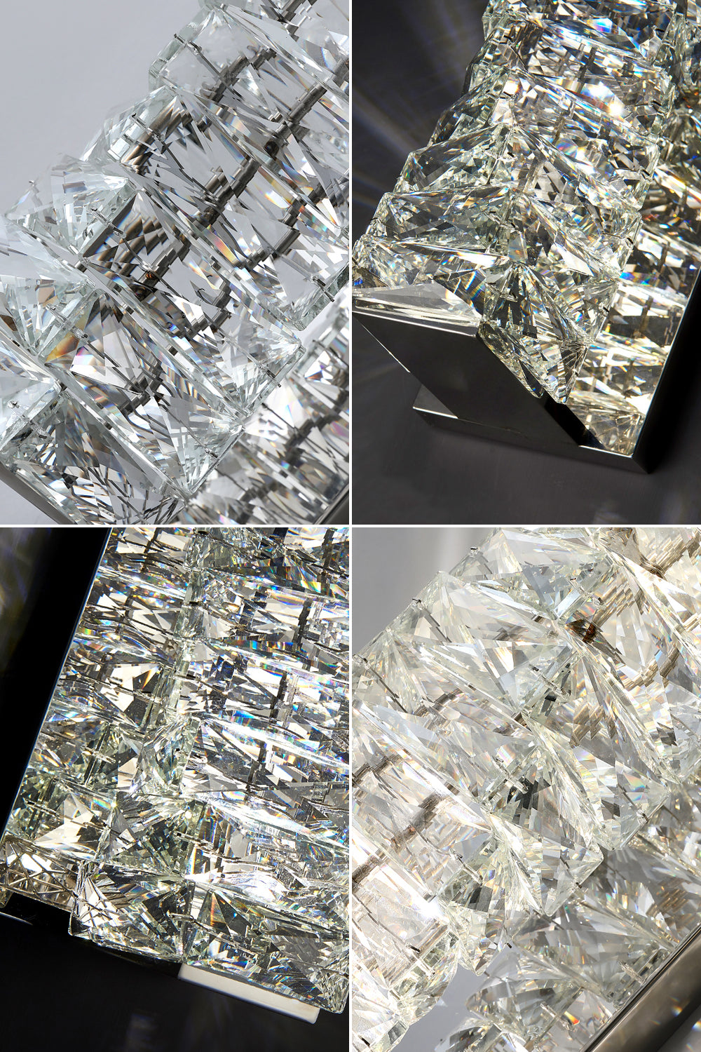 The lamp body is composed of multiple meticulously cut crystal prisms, forming a unique vertical layered or stacked structure. This layered design allows light to produce magnificent refraction and diamond-like brilliance as it passes through the crystals. The crystal body is supported by a sleek stainless steel frame, and the mirror-polished finish at the base further enhances light reflection, adding a captivating charm to the fixture.