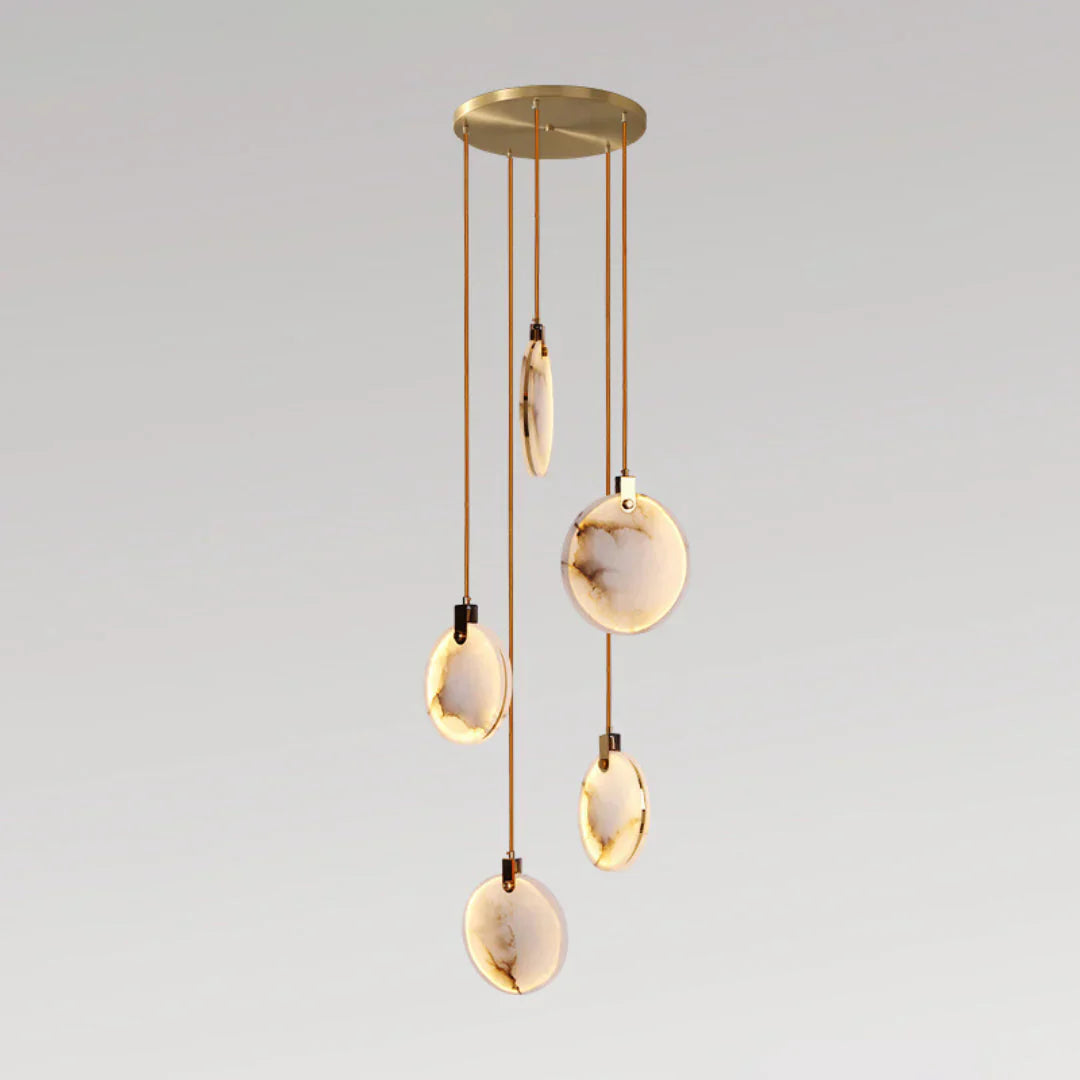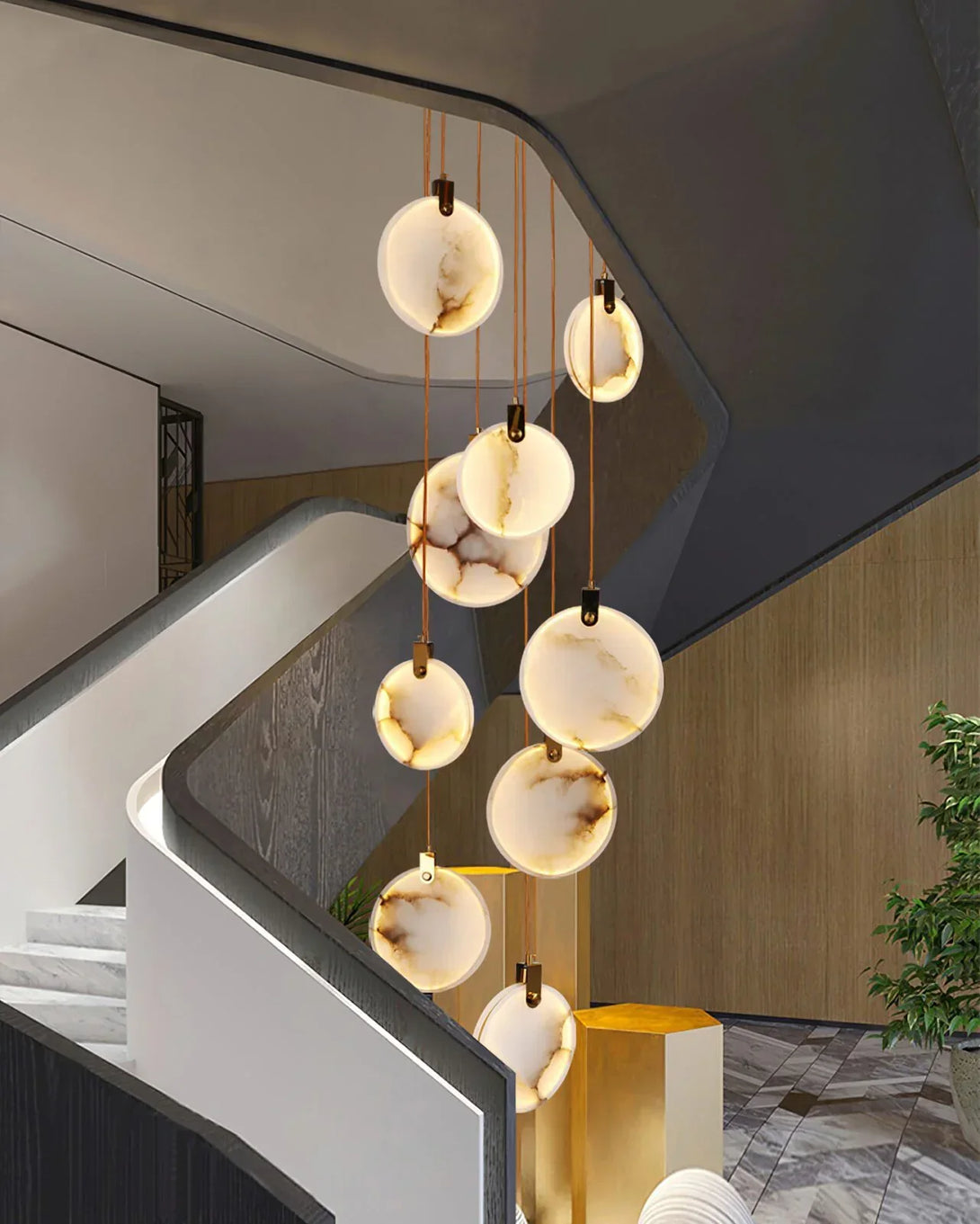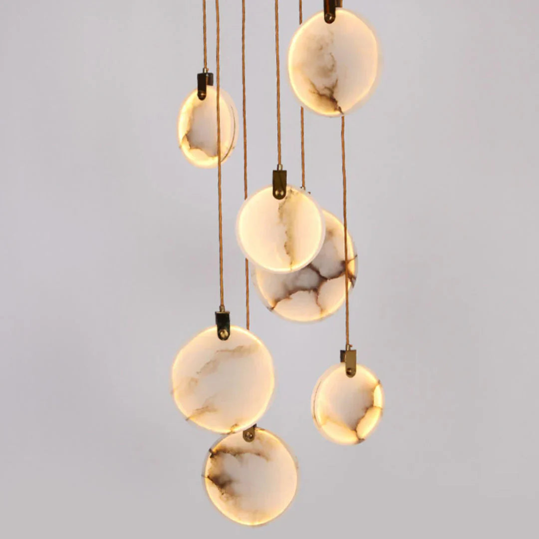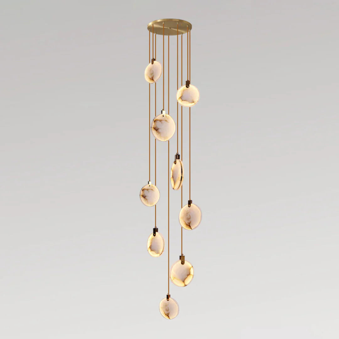 Elevate your space with the contemporary elegance of our Disc Harvest Alabaster Chandelier. Featuring sleek antique brass steel tubing and two luxurious alabaster discs, this chandelier adds a touch of luxury to any room. Create a truly dazzling effect by adding multiple to your space.