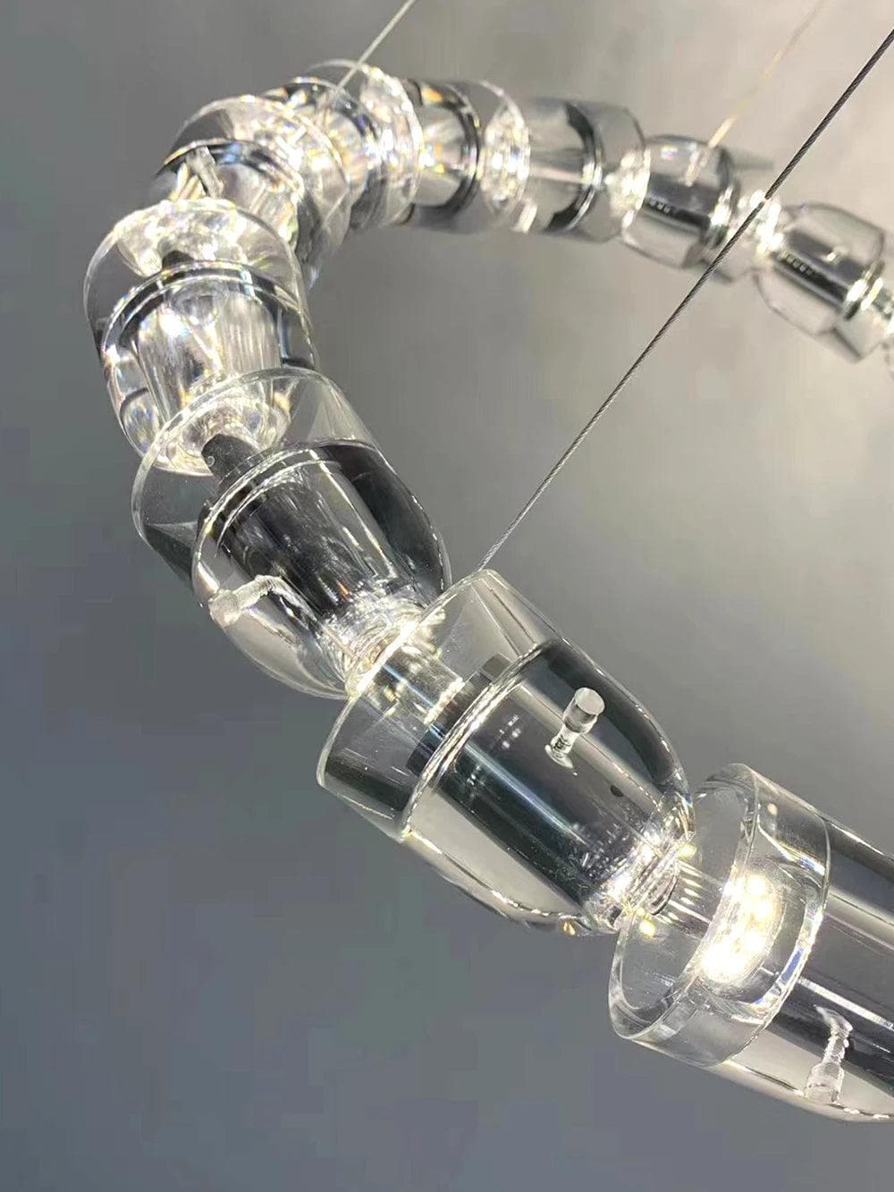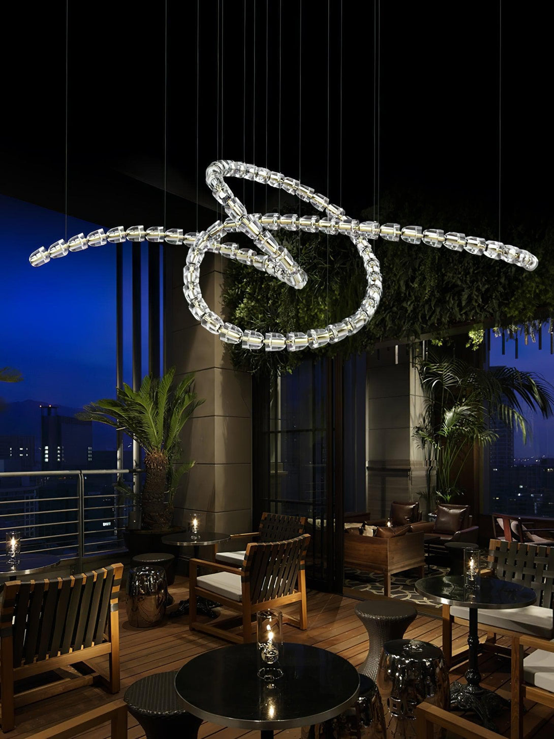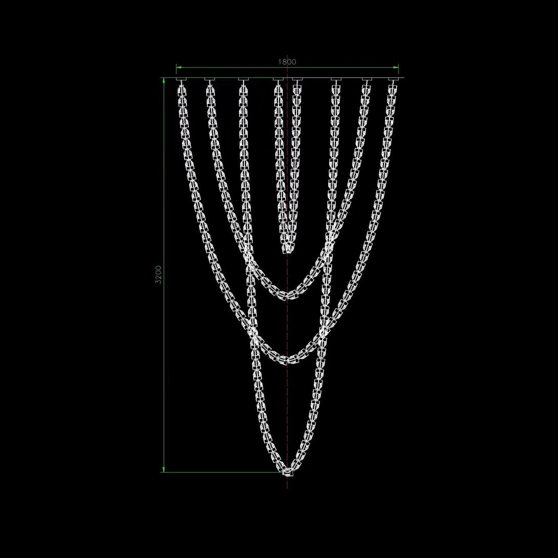 Introducing the Gabriel Chandelier G. Inspired by the graceful movements of a snake, this fixture features a V-shaped pendant of interconnected threads, creating a captivating cascade of light and depth. Blending organic influence with modern design, it adds a touch of drama to any room through its hypnotic elegance and tranquil ambiance.