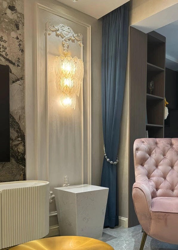This feather crystal wall light Luxury Bedroom Wall Lamp, a symbol of contemporary style and sophistication that enhances the ambiance of your bedroom, corridor, living room, dining hall, aisle, or children's room. This elegant wall sconce features an elegant feather design.