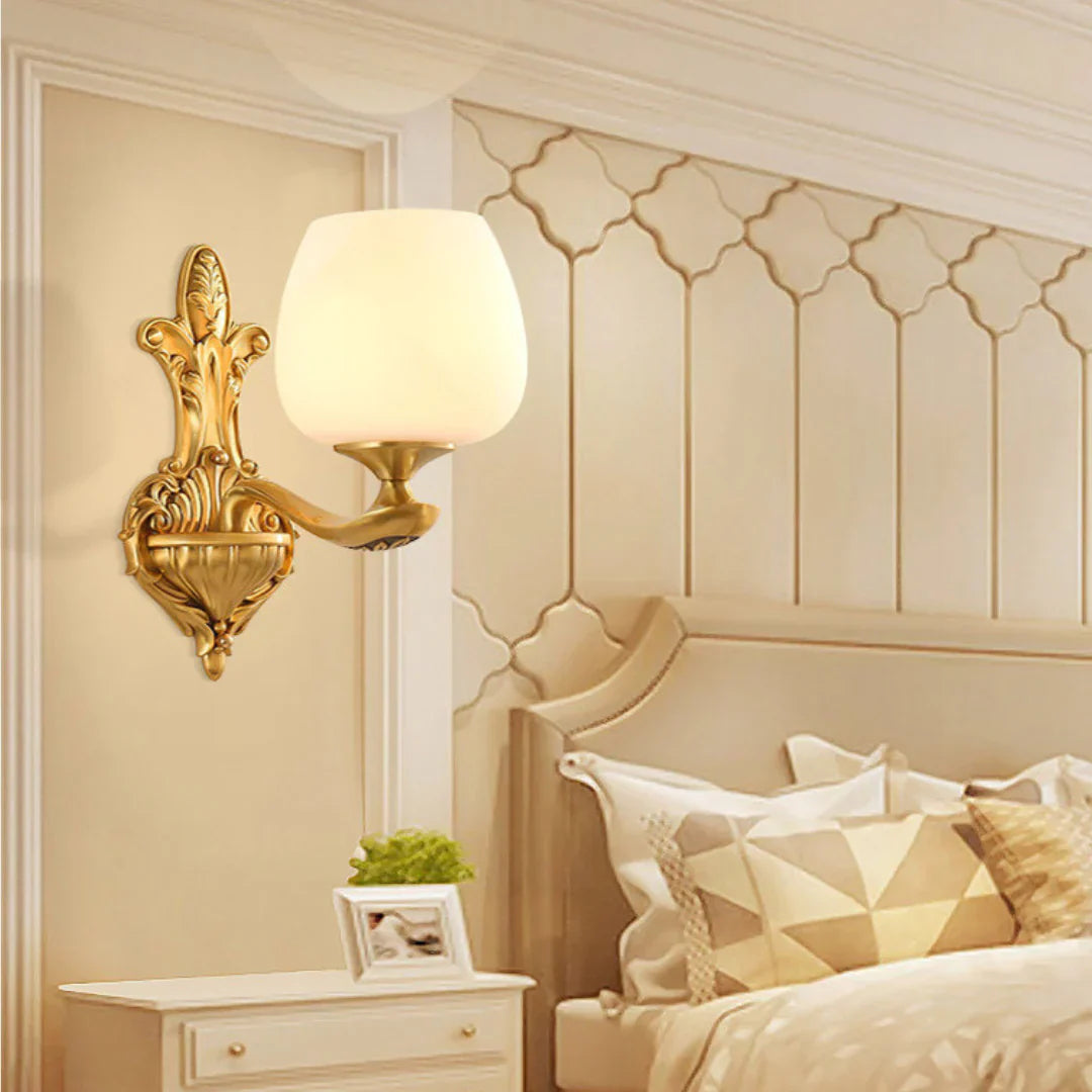 This Fyzdlaor American Brass Glass Wall Lamp features a beautiful, country-style cream-colored glass cup design. This wall lamp is perfect for adding a touch of elegance to any bedroom and comes with all the necessary installation accessories. The brass finish and minimalist design make this wall lamp a perfect complement to any dΓ©cor style.