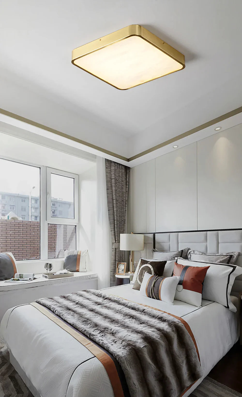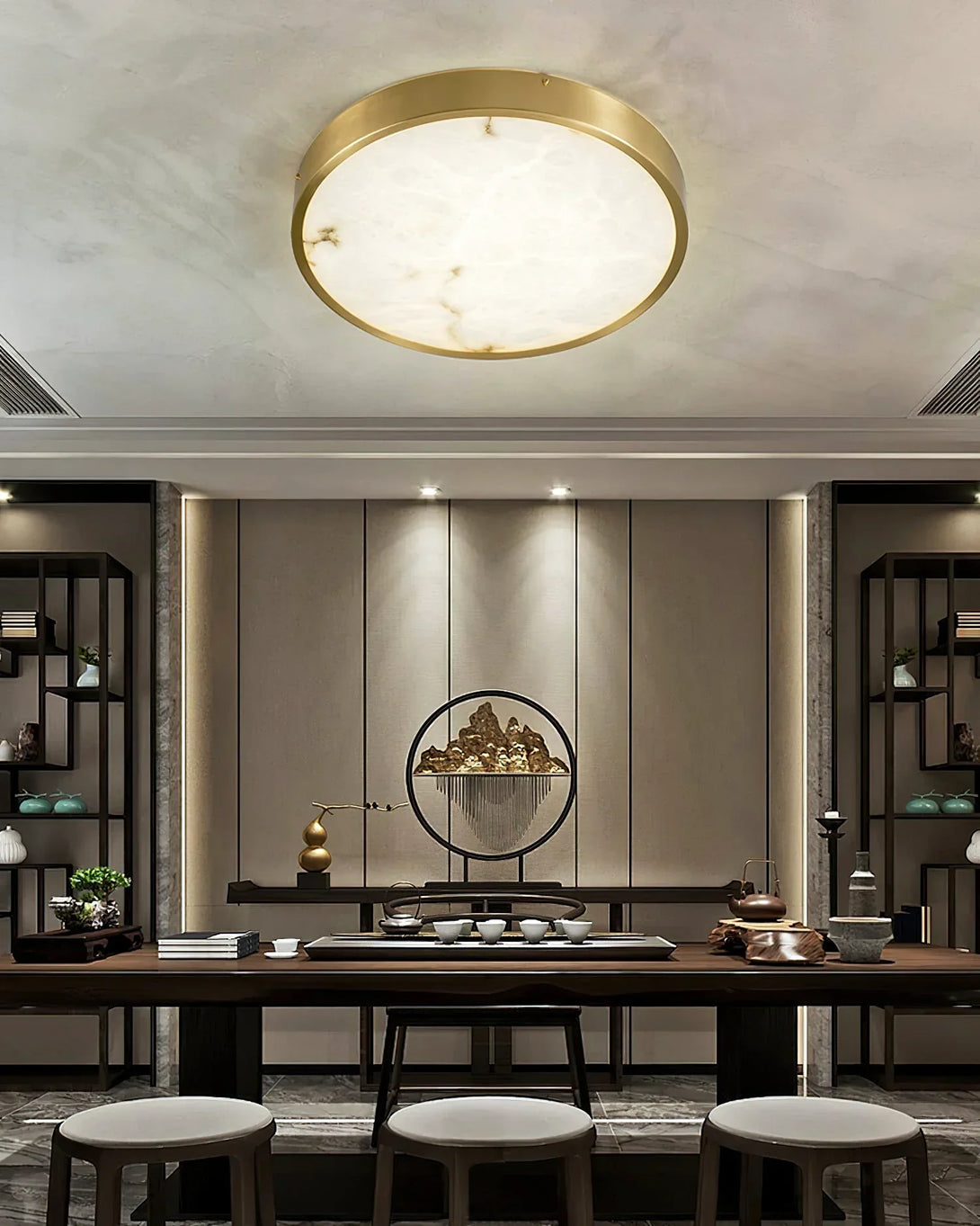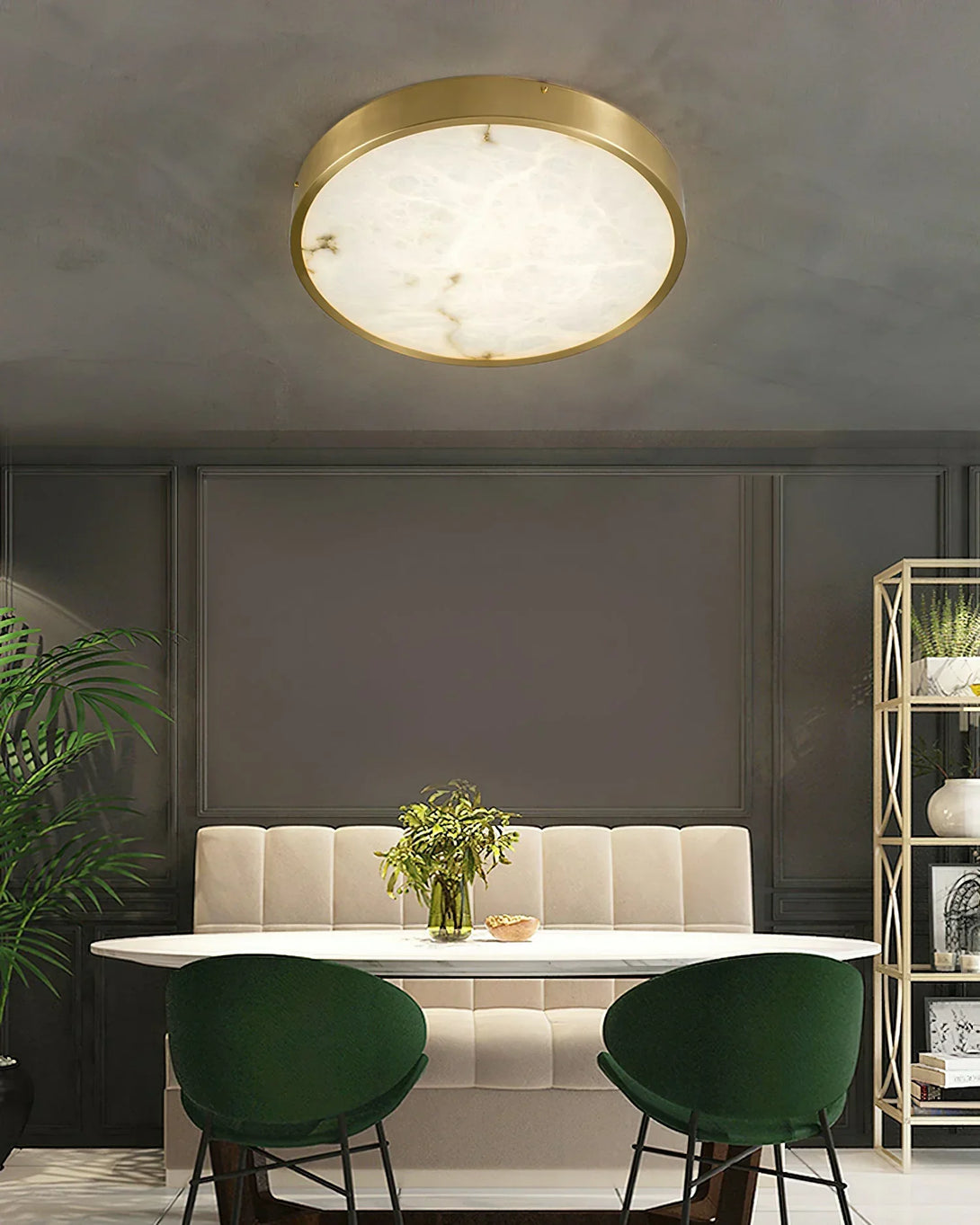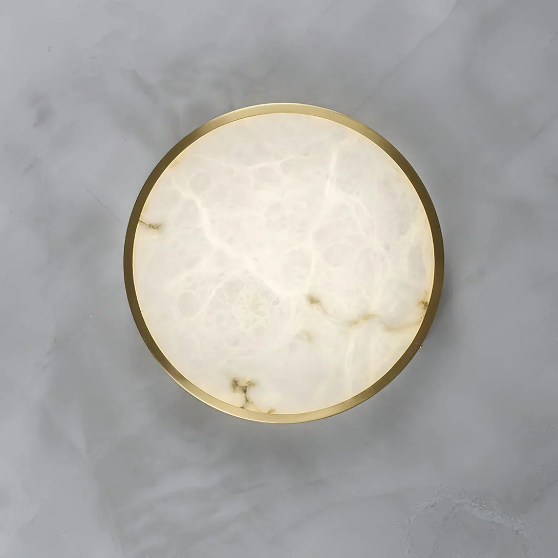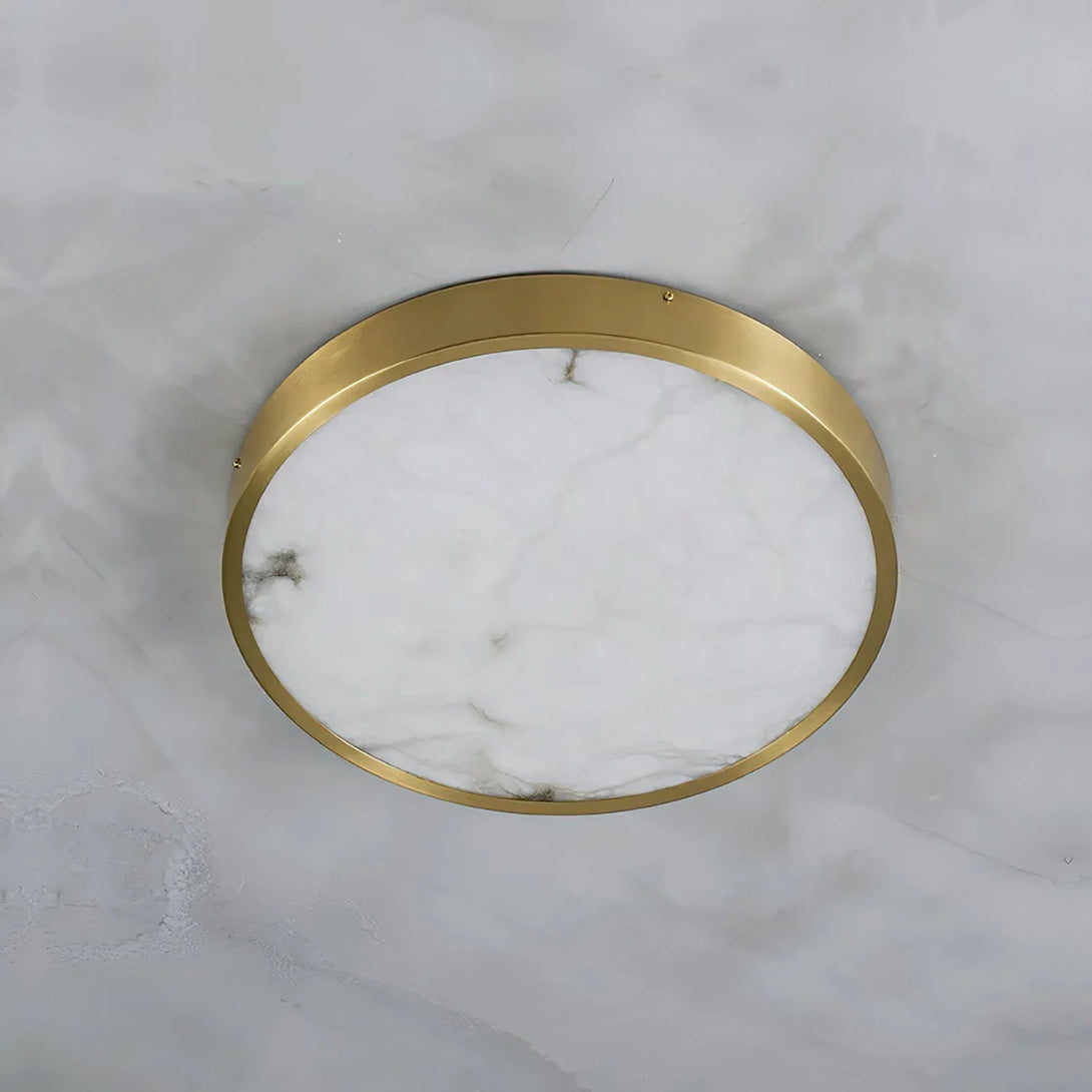 Transform your living space with the timeless elegance of the Geometric Alabaster Recessed Ceiling Light. Made from brass, this light showcases a round alabaster white glass shade that emits a warm and inviting glow. Enhance your home with this sophisticated and stylish lighting fixture.