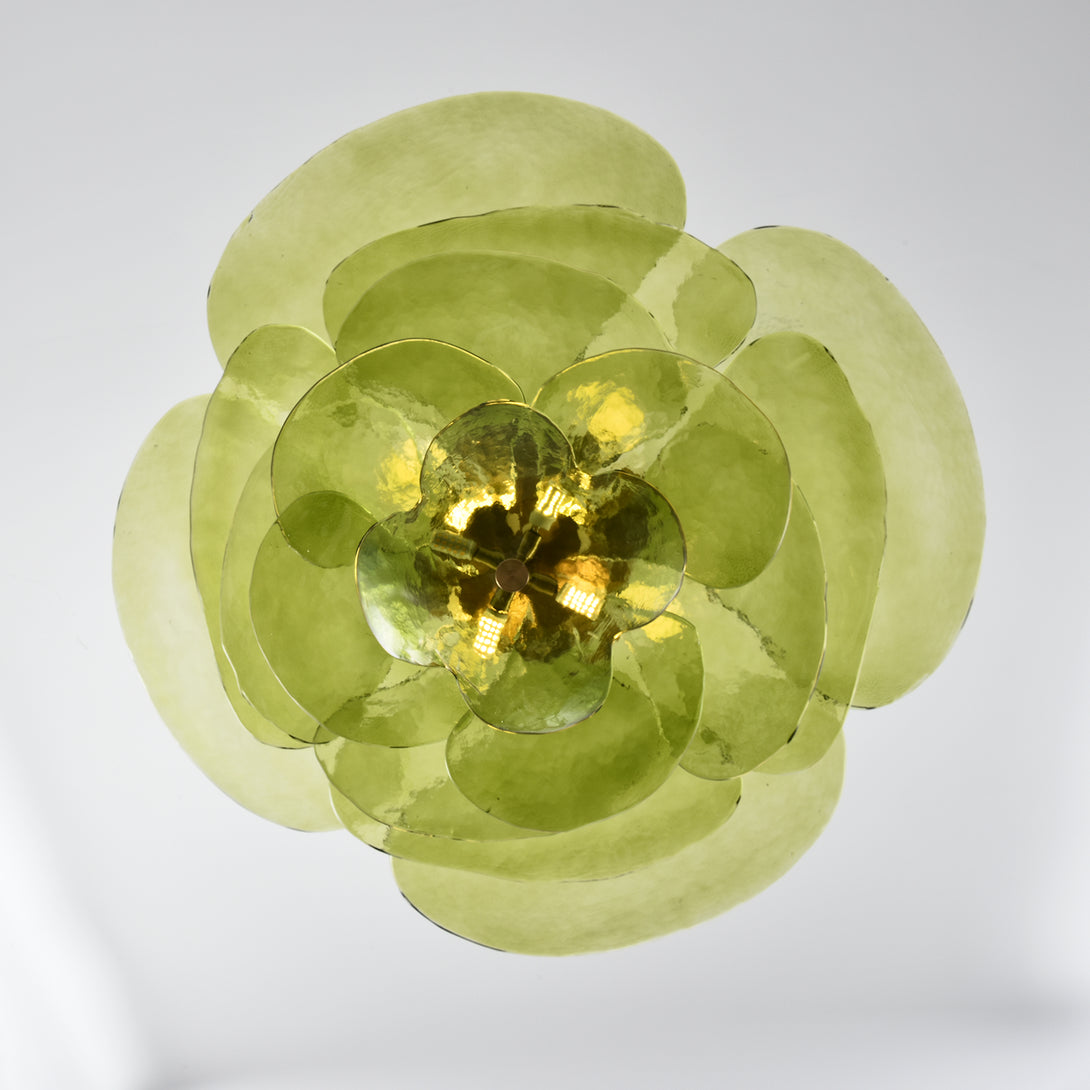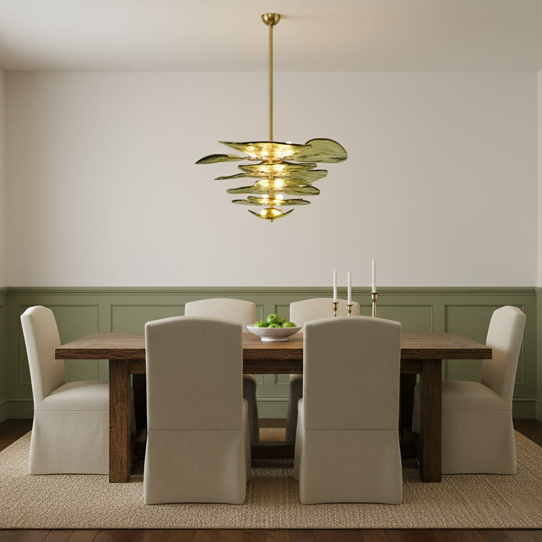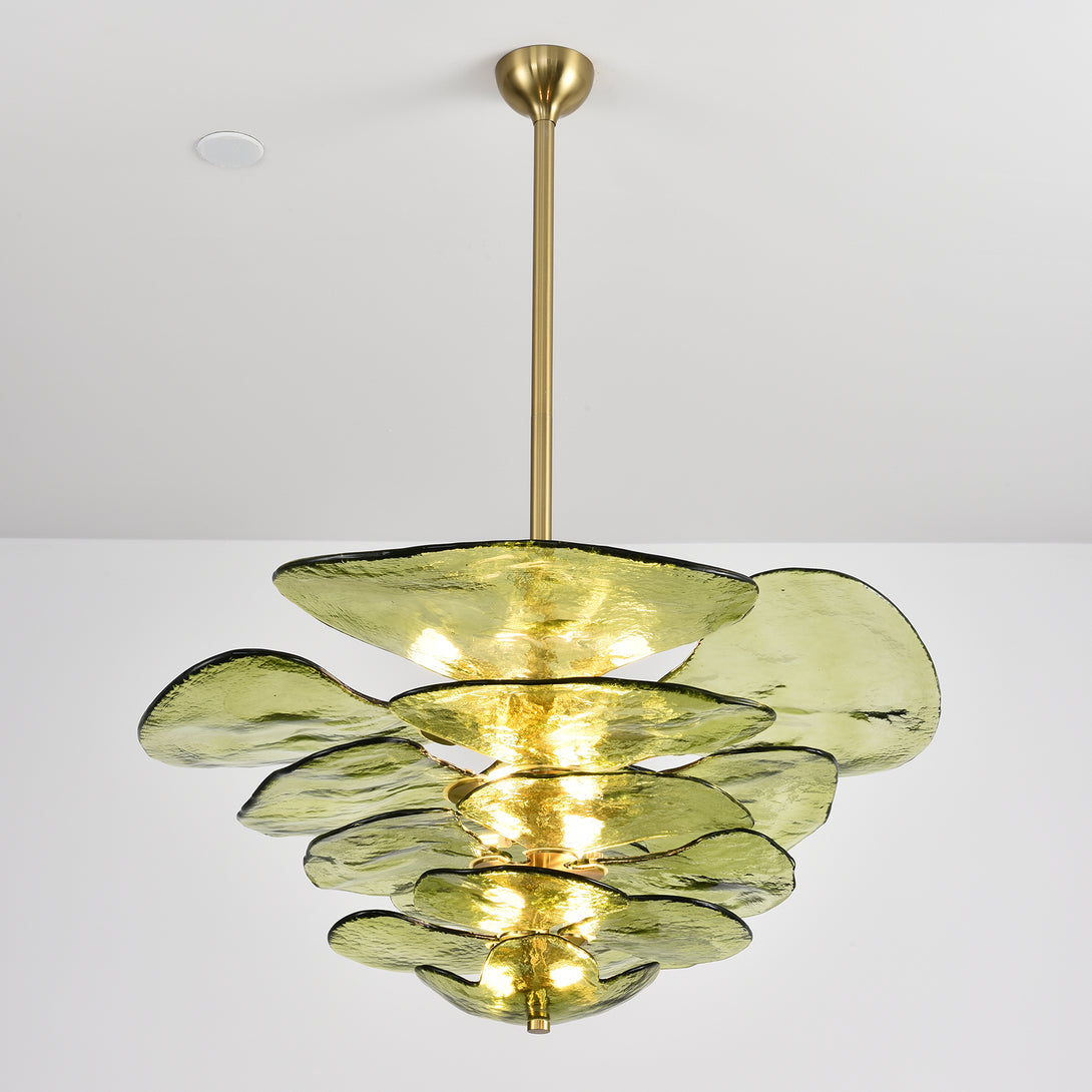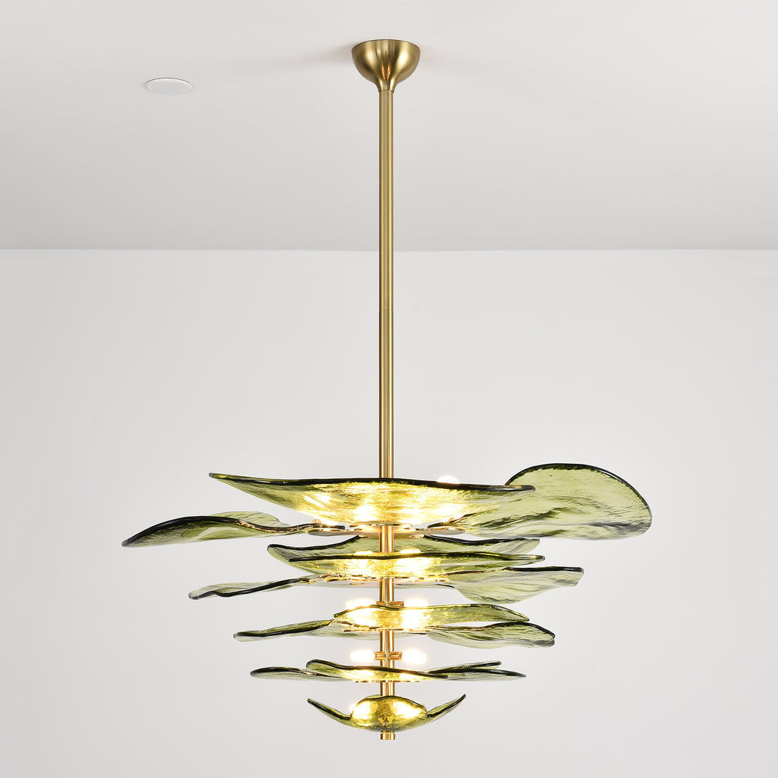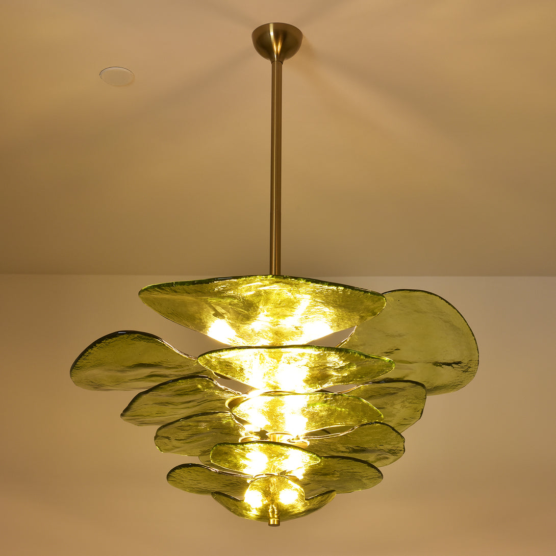 The Lilypad Green Chandelier is expertly crafted with textured glass blades, each featuring a unique Green Chandelier petal design. These petals are mounted on a sturdy brass structure and arranged in the shape of a lily pad flower, creating a stunning addition to any space. This chandelier is sure to bring a touch of elegance and comfort to your room.