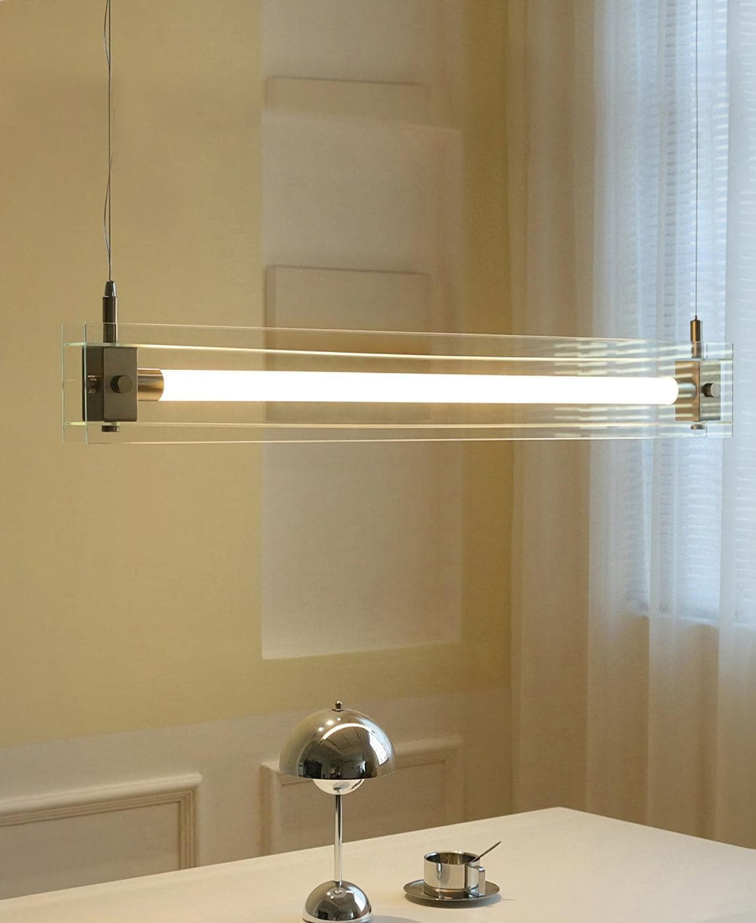 Mazha Pendant Lamp which is not only strong but also light and airy. Use round glass as the main structural body, transparent but with a sense of volume, the seemingly floating interior of the lighting is presented in a more straightforward and poetic way.