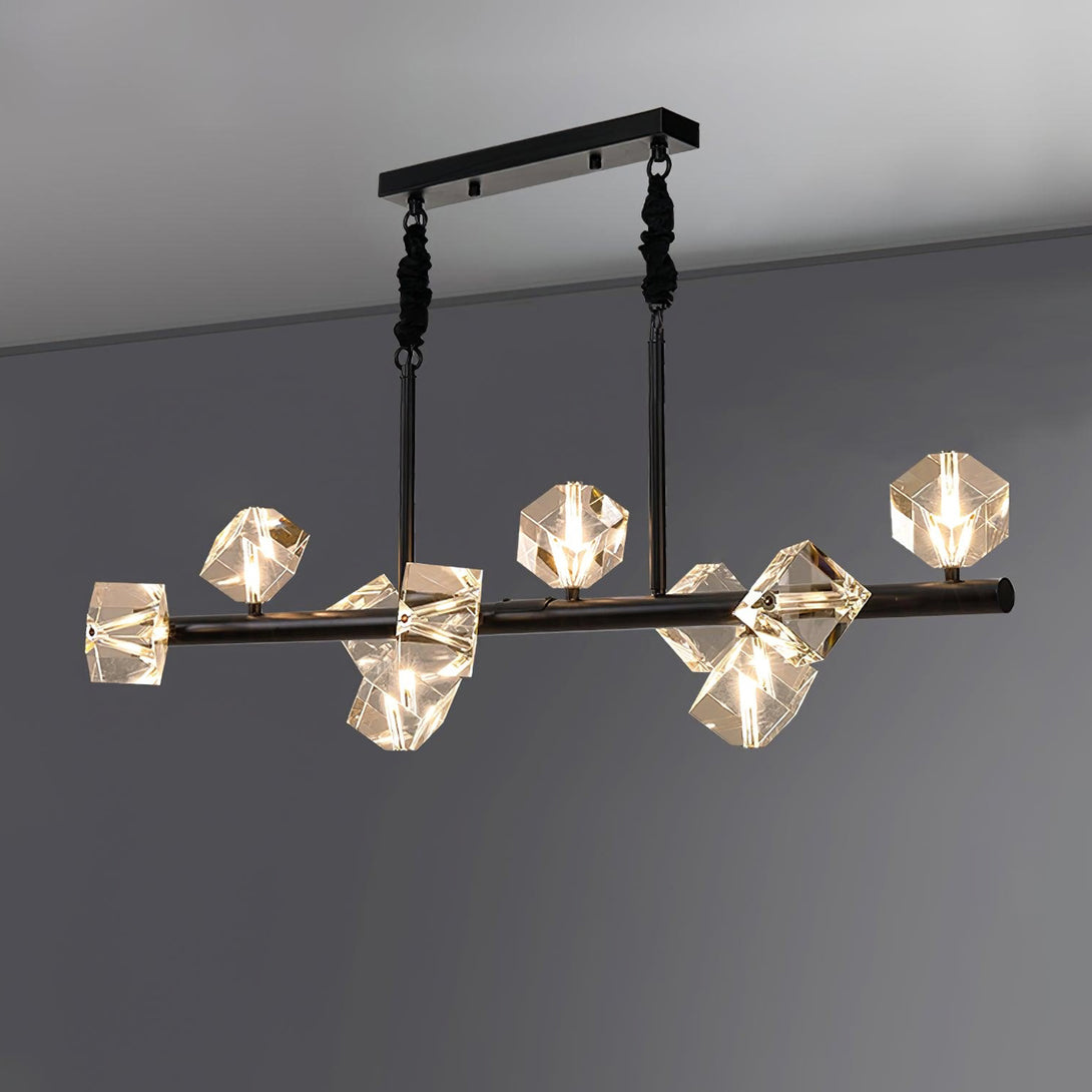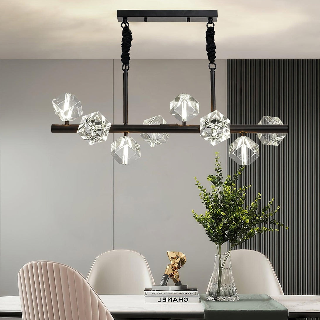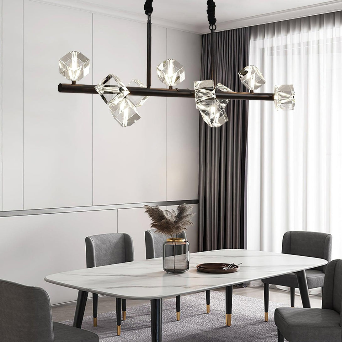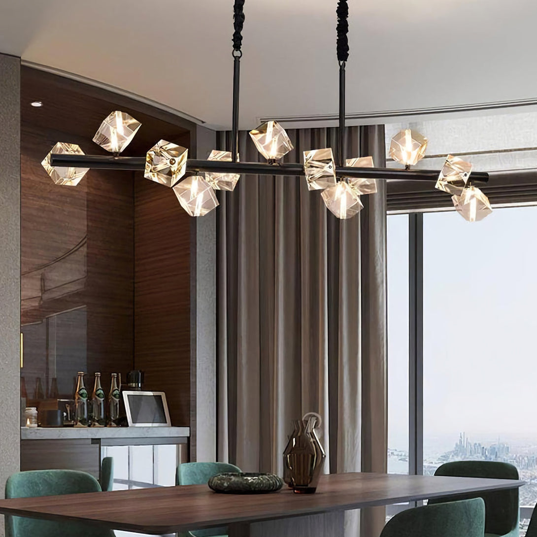 This stunning Modern Geometric Crystal Chandelier from korewolamp is a contemporary light fixture that creates a dazzling display of light. The design features a linear matte black frame from which multiple faceted crystal prisms are suspended. These geometric crystals are arranged dynamically along the bar, each one catching and refracting the light to produce a brilliant, scattered sparkle. The clean, horizontal structure and sharp, modern angles of the crystal make this chandelier a perfect statement piece over a dining table, kitchen island, or long entryway, bringing a touch of architectural elegance and luxury to the space.