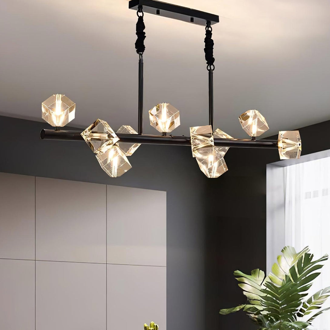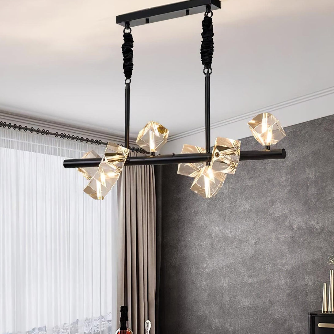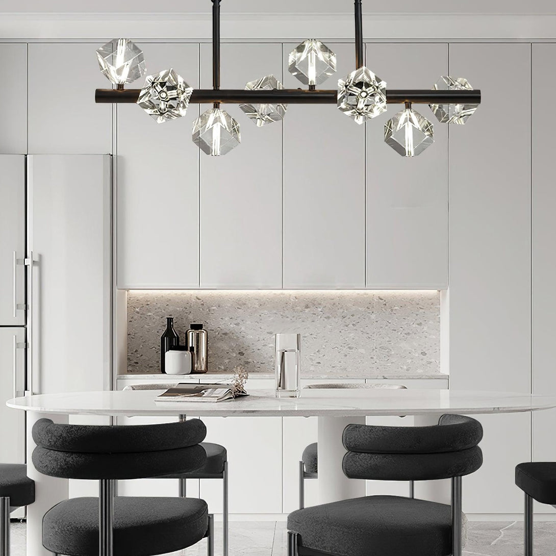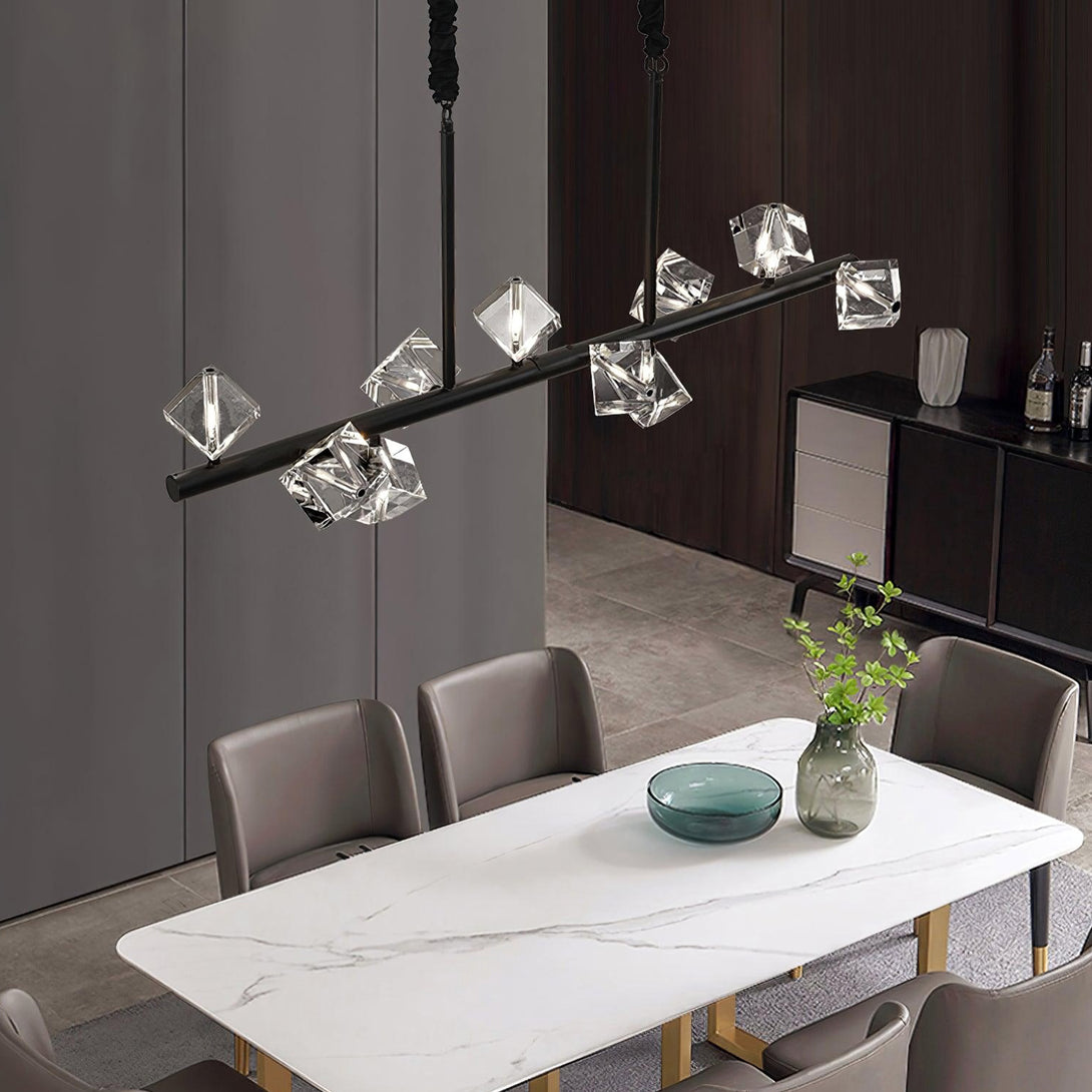 This stunning Modern Geometric Crystal Chandelier from korewolamp is a contemporary light fixture that creates a dazzling display of light. The design features a linear matte black frame from which multiple faceted crystal prisms are suspended. These geometric crystals are arranged dynamically along the bar, each one catching and refracting the light to produce a brilliant, scattered sparkle. The clean, horizontal structure and sharp, modern angles of the crystal make this chandelier a perfect statement piece over a dining table, kitchen island, or long entryway, bringing a touch of architectural elegance and luxury to the space.