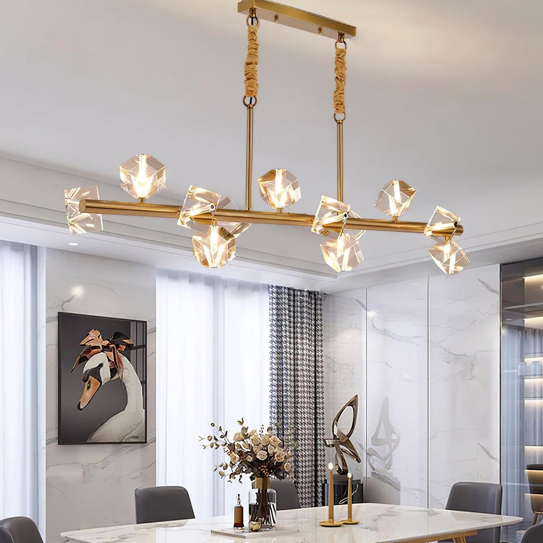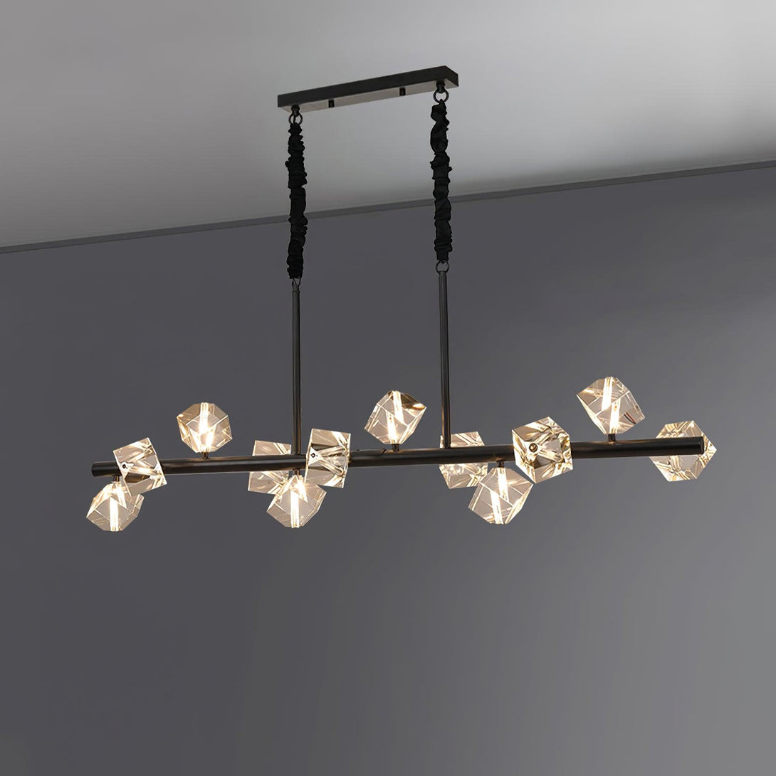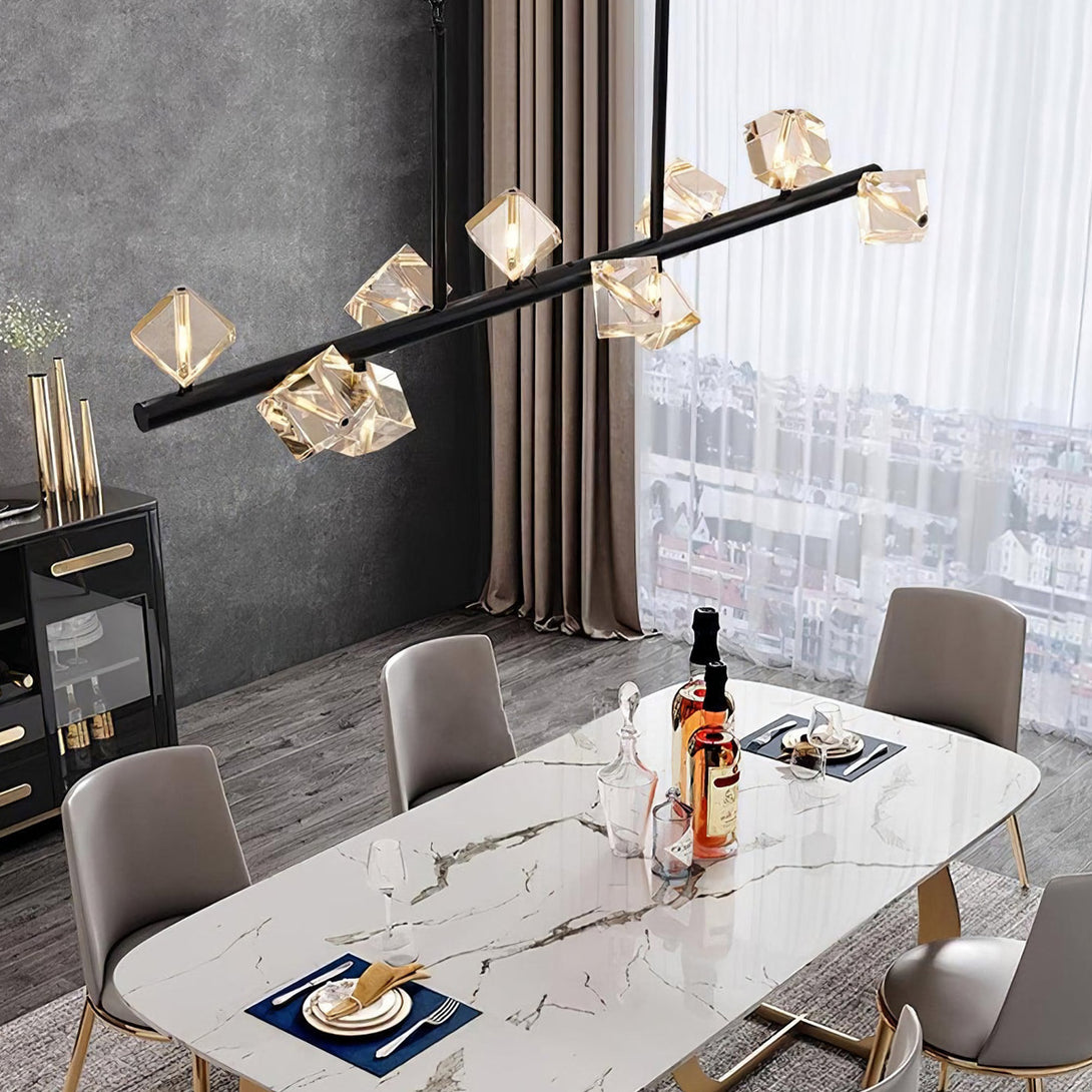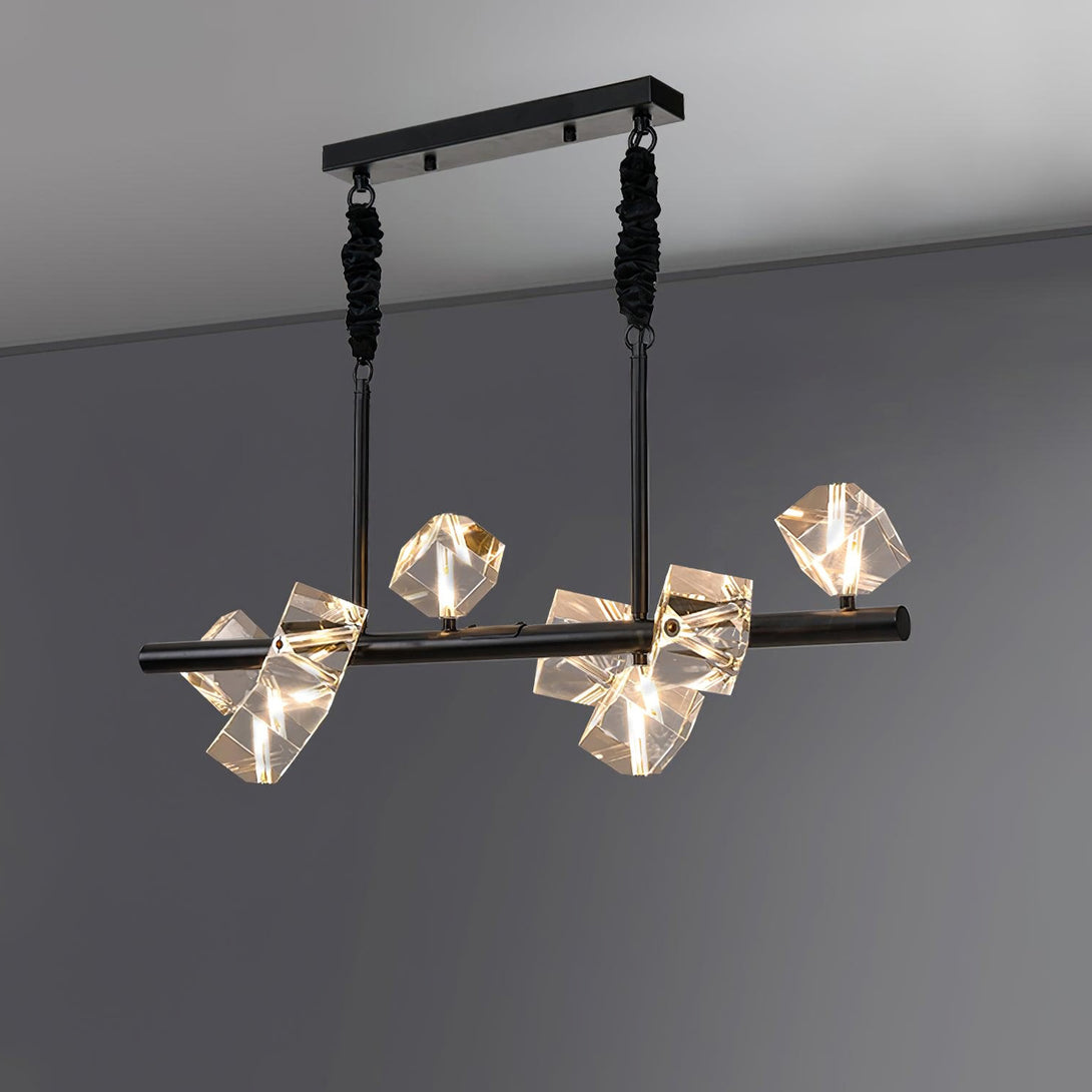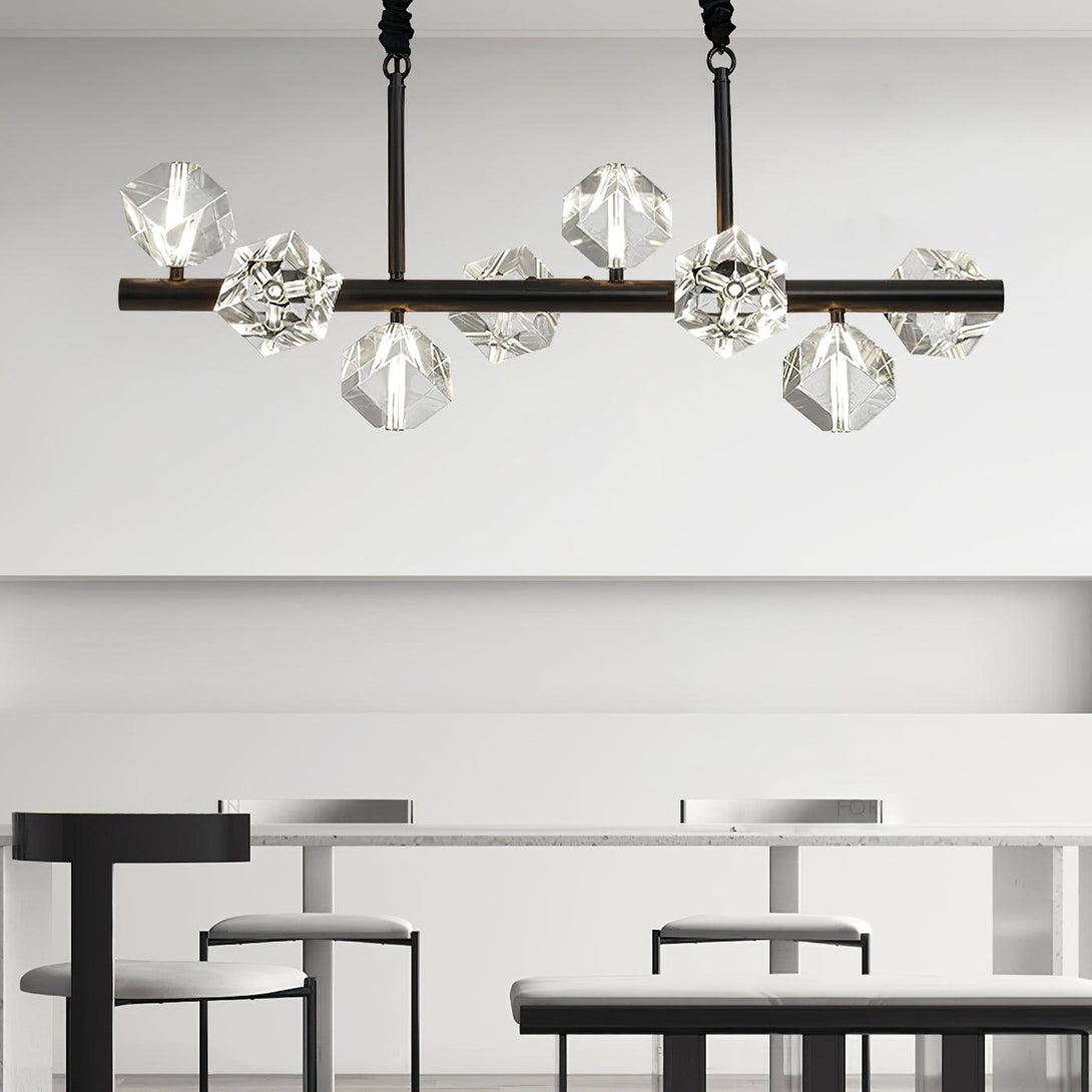 This stunning Modern Geometric Crystal Chandelier from korewolamp is a contemporary light fixture that creates a dazzling display of light. The design features a linear matte black frame from which multiple faceted crystal prisms are suspended. These geometric crystals are arranged dynamically along the bar, each one catching and refracting the light to produce a brilliant, scattered sparkle. The clean, horizontal structure and sharp, modern angles of the crystal make this chandelier a perfect statement piece over a dining table, kitchen island, or long entryway, bringing a touch of architectural elegance and luxury to the space.
