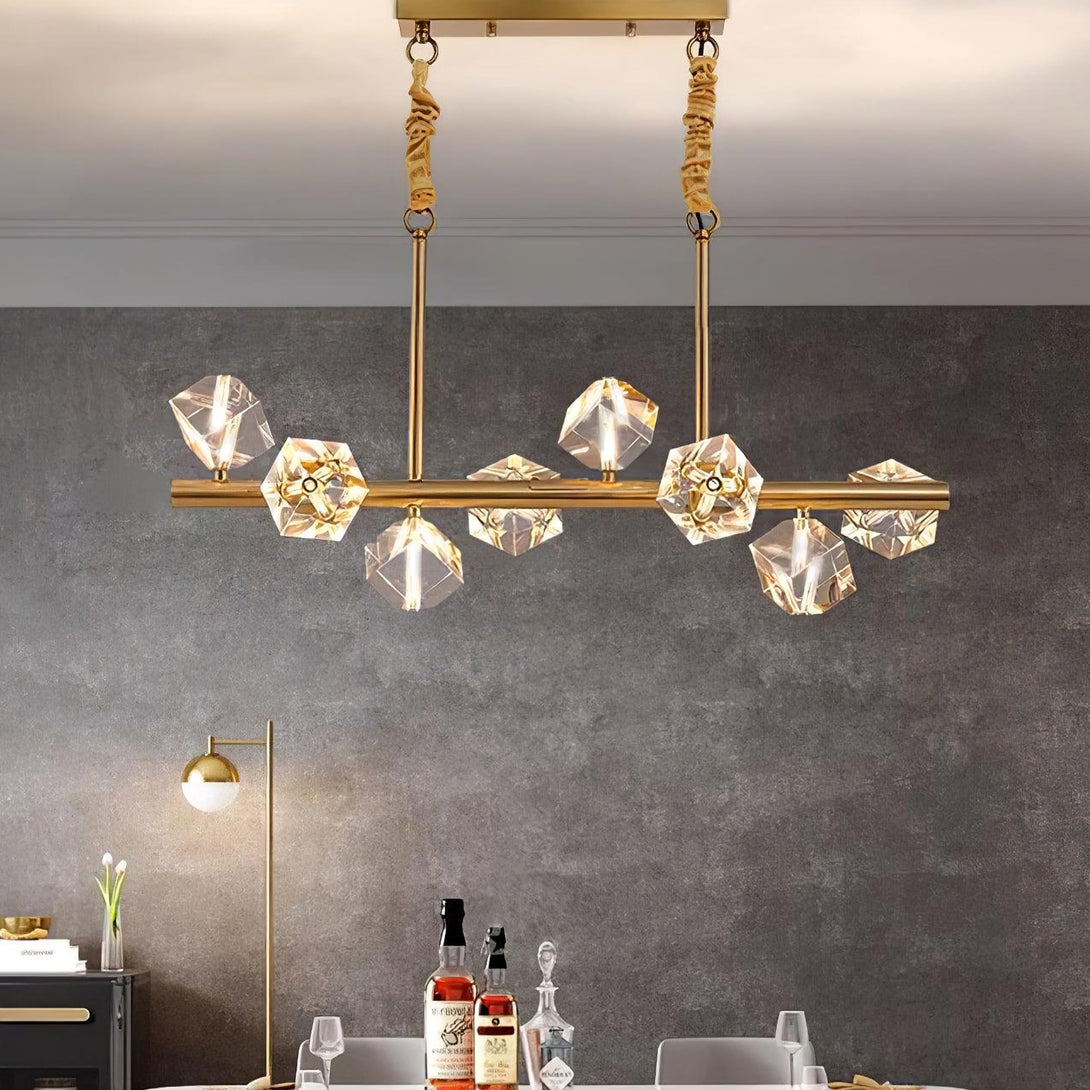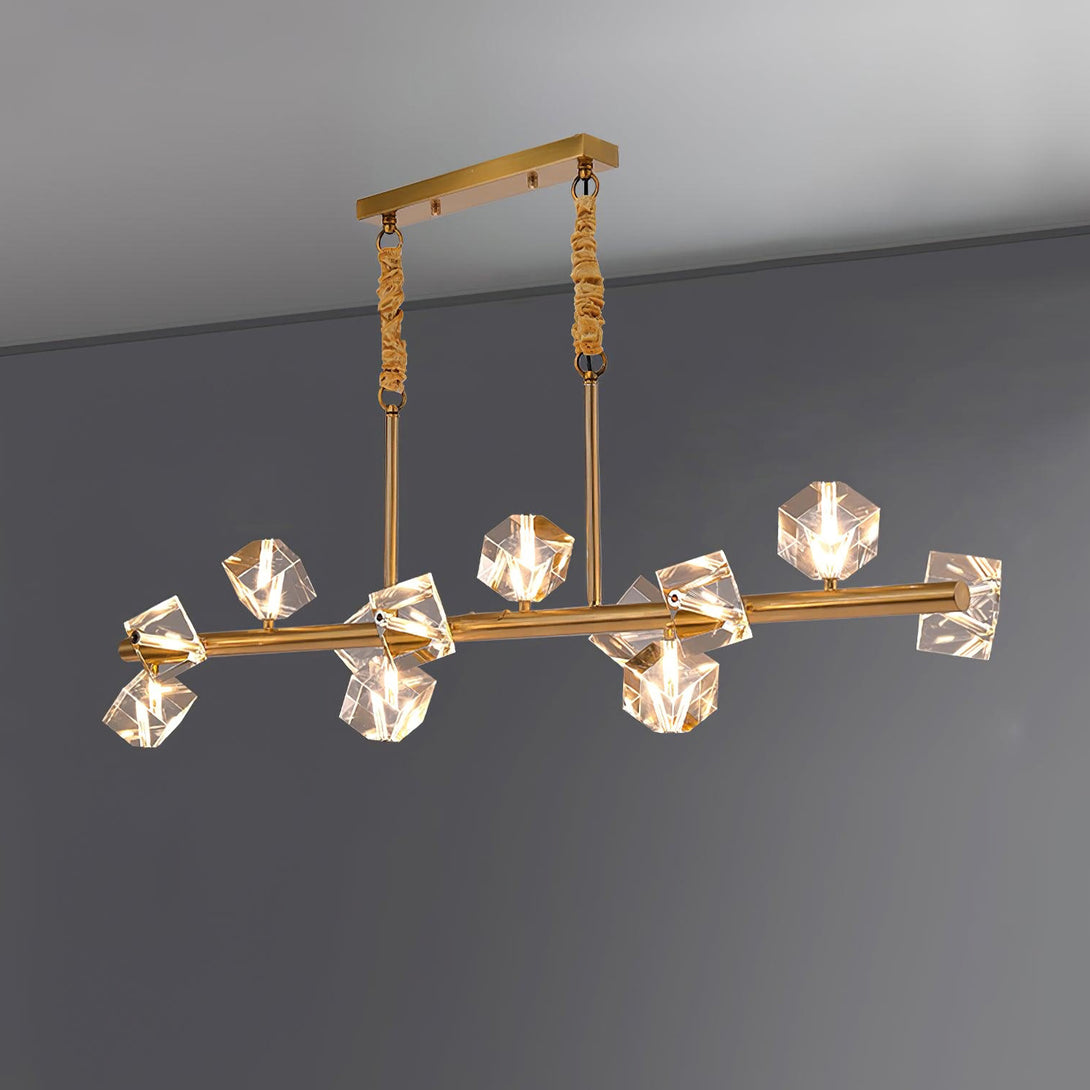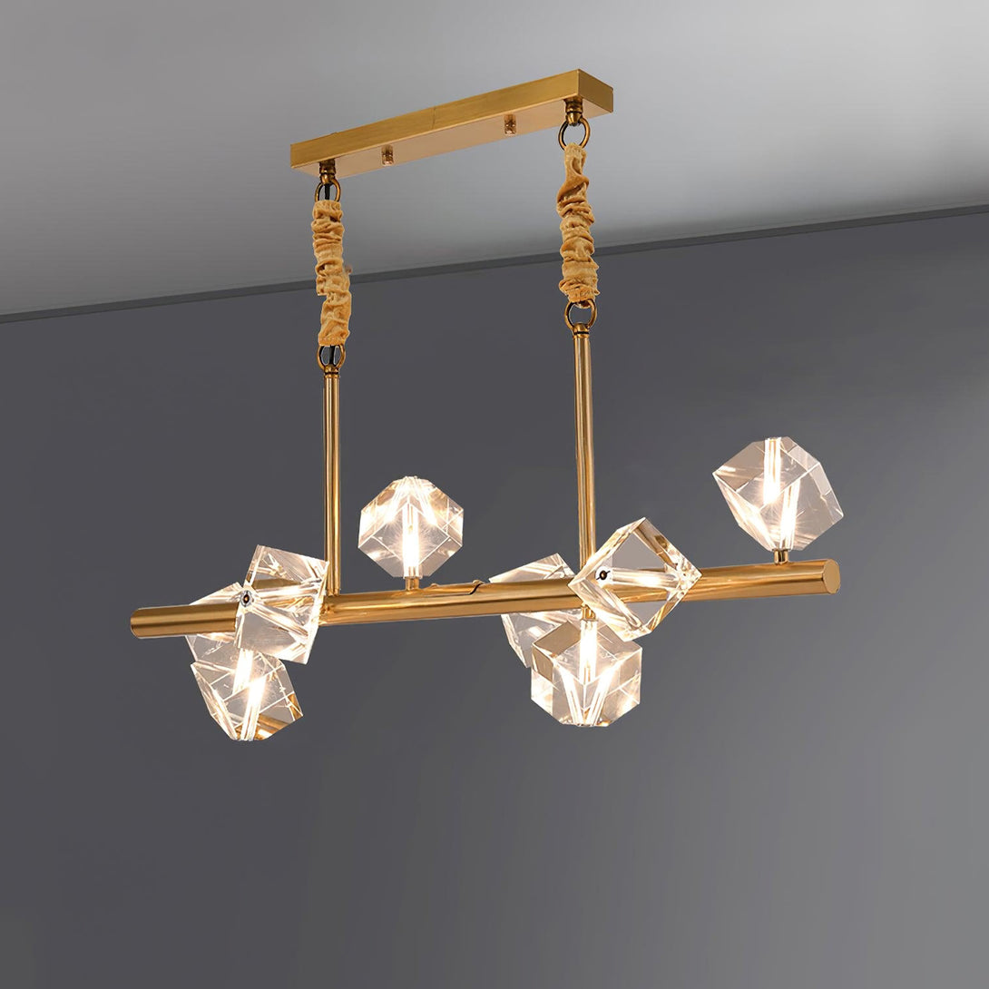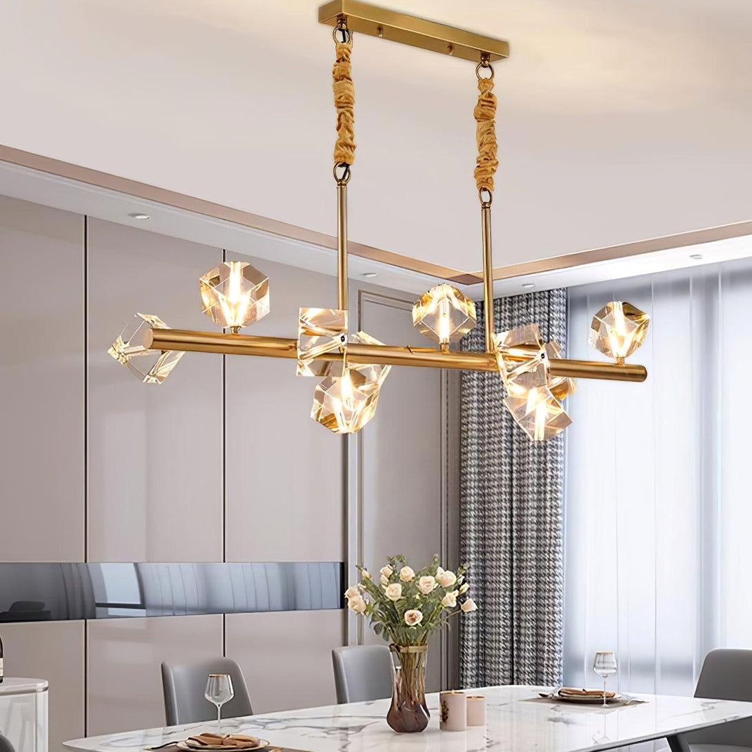 This stunning Modern Geometric Crystal Chandelier from korewolamp is a contemporary light fixture that creates a dazzling display of light. The design features a linear matte black frame from which multiple faceted crystal prisms are suspended. These geometric crystals are arranged dynamically along the bar, each one catching and refracting the light to produce a brilliant, scattered sparkle. The clean, horizontal structure and sharp, modern angles of the crystal make this chandelier a perfect statement piece over a dining table, kitchen island, or long entryway, bringing a touch of architectural elegance and luxury to the space.