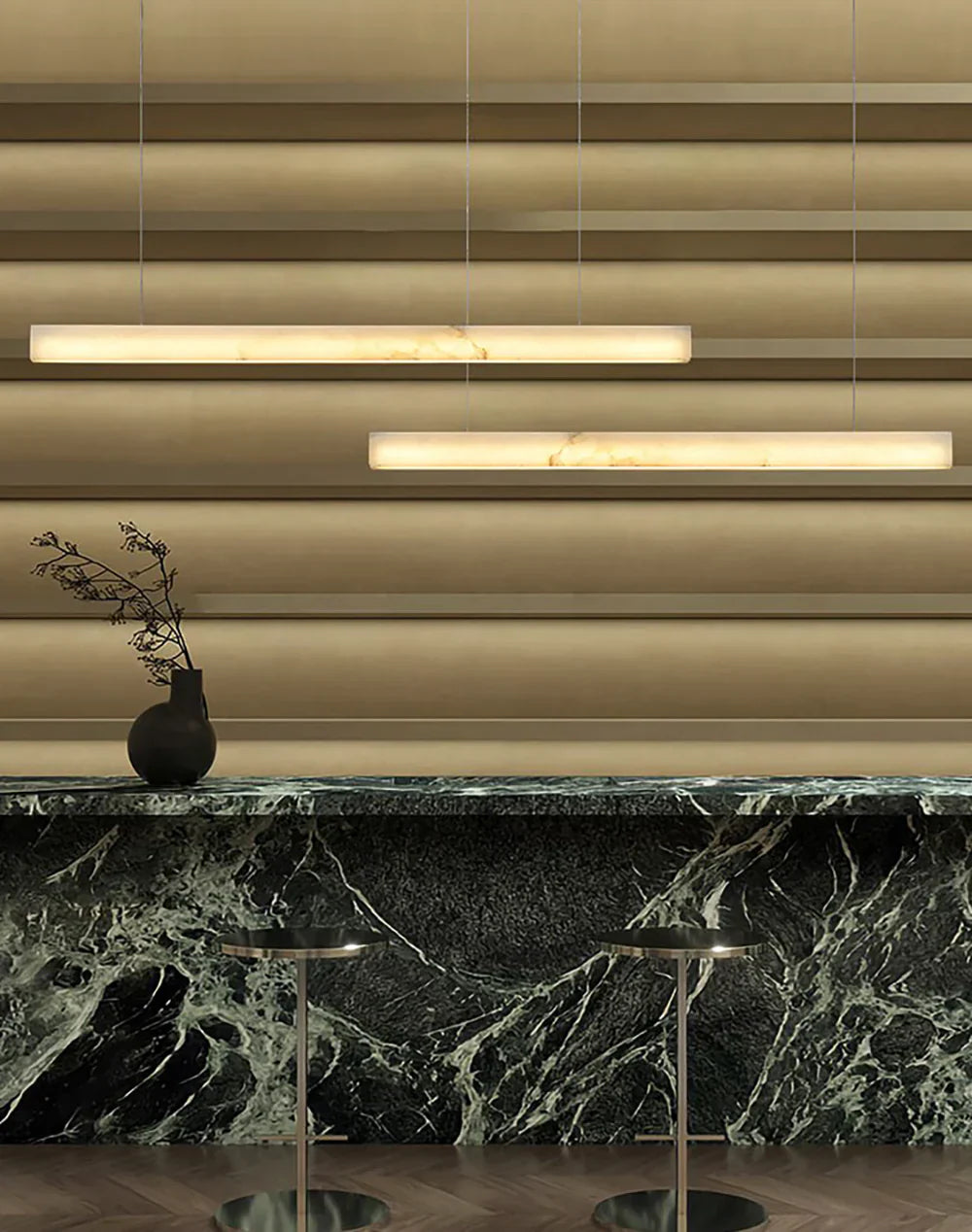 Use our Modern Linear Alabaster Pendant Light, Its refined copper and warm alabaster shade emit an alluring glow, perfect for any room. Add a touch of sophistication to your home with this elegant and versatile piece.