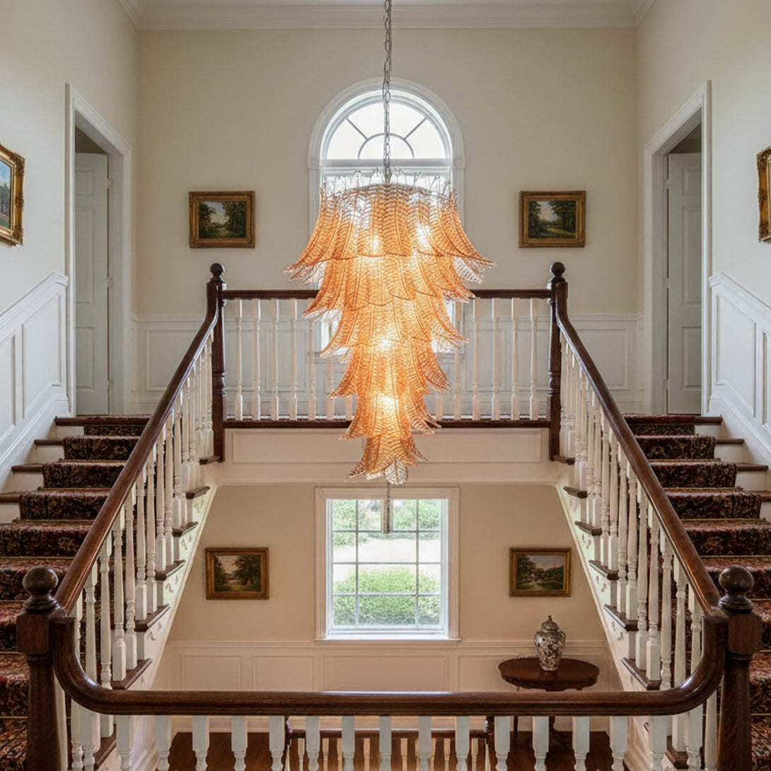 Murano Amber Felch Spiral Chandelier, Enhance your living space. This stunning piece is a perfect blend of modern elegance and artistic craftsmanship, featuring meticulously handcrafted Amber glass pieces arranged in a captivating spiral design. Illuminate your space with a captivating glow, creating a warm and inviting ambiance. Each piece of glass reflects light beautifully, adding depth and dimension to any room.