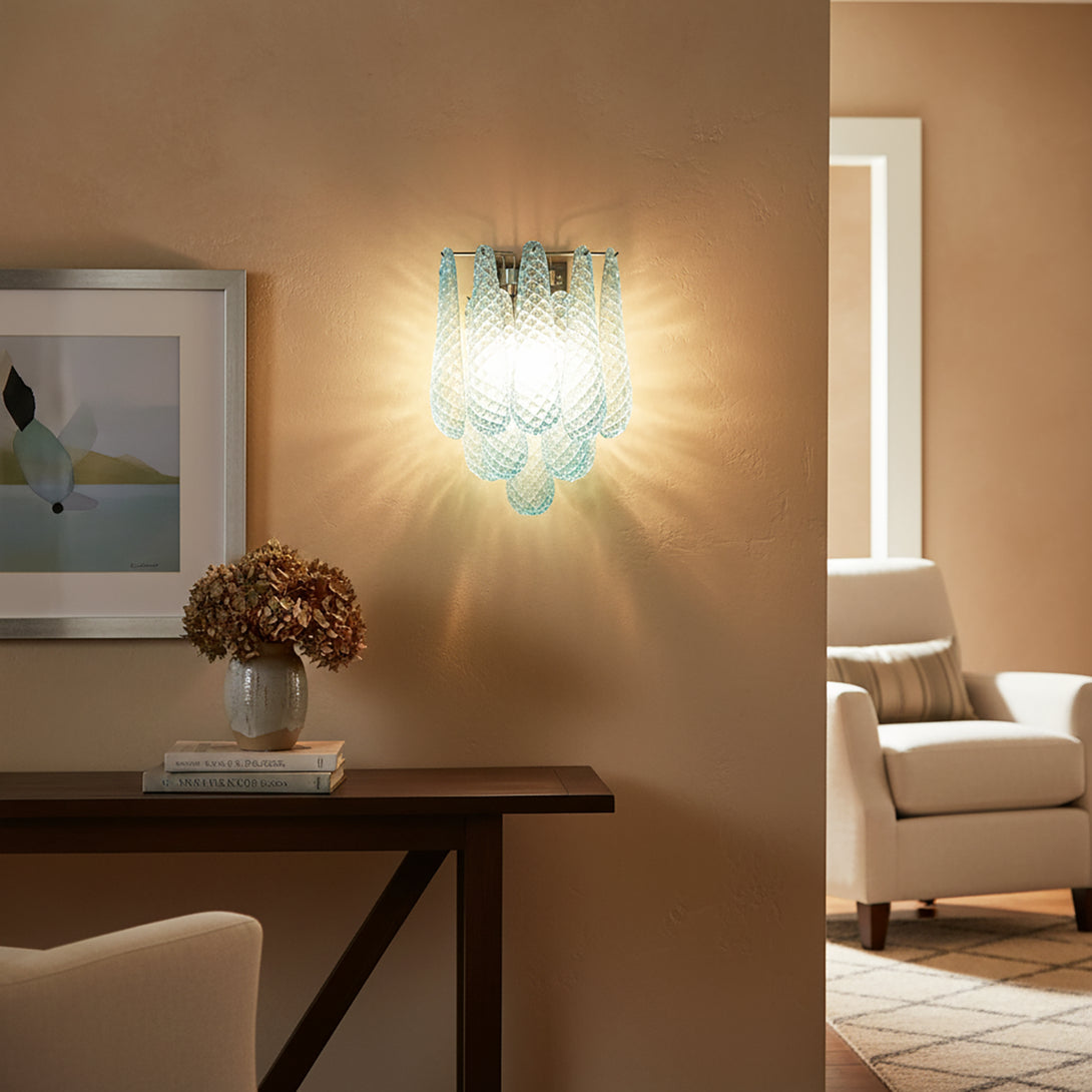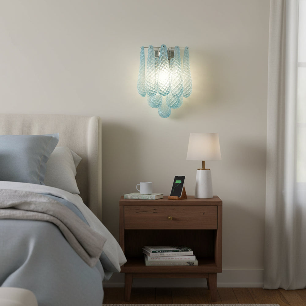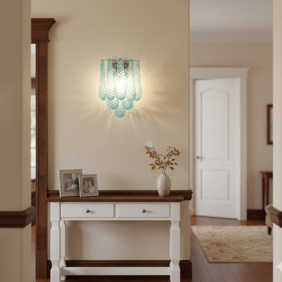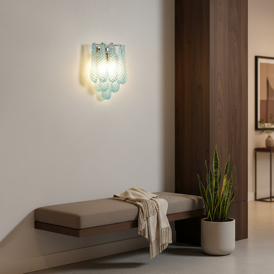 Illuminate your space with this elegant and captivating Murano Petals Glass Blue Wall Light! It perfectly blends glass art with tranquil ocean hues, adding a sophisticated and enchanting glow to your walls. The wall light is composed of multiple intricately crafted blue glass teardrop/petal elements. As light passes through, it creates a dazzling yet soft refraction effect.