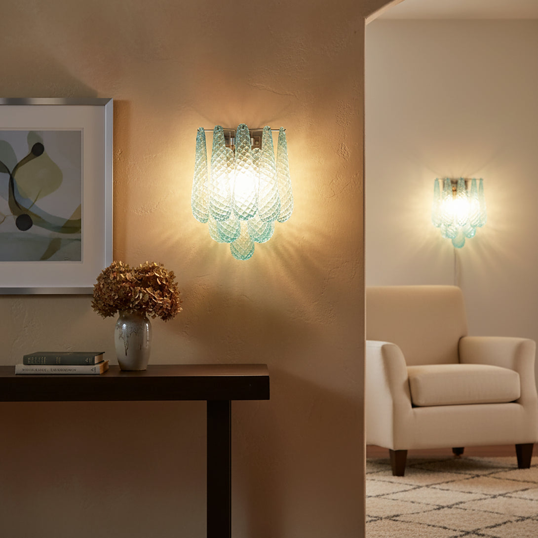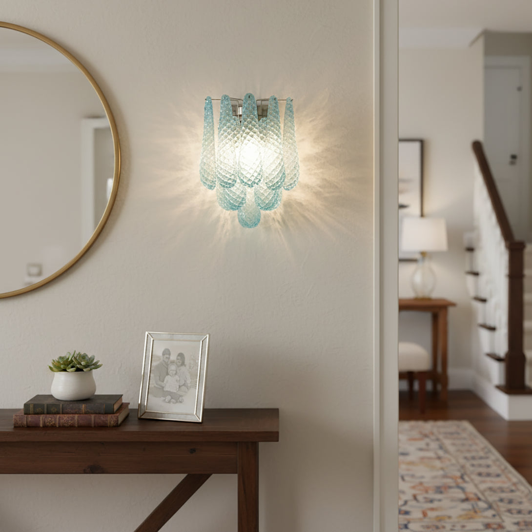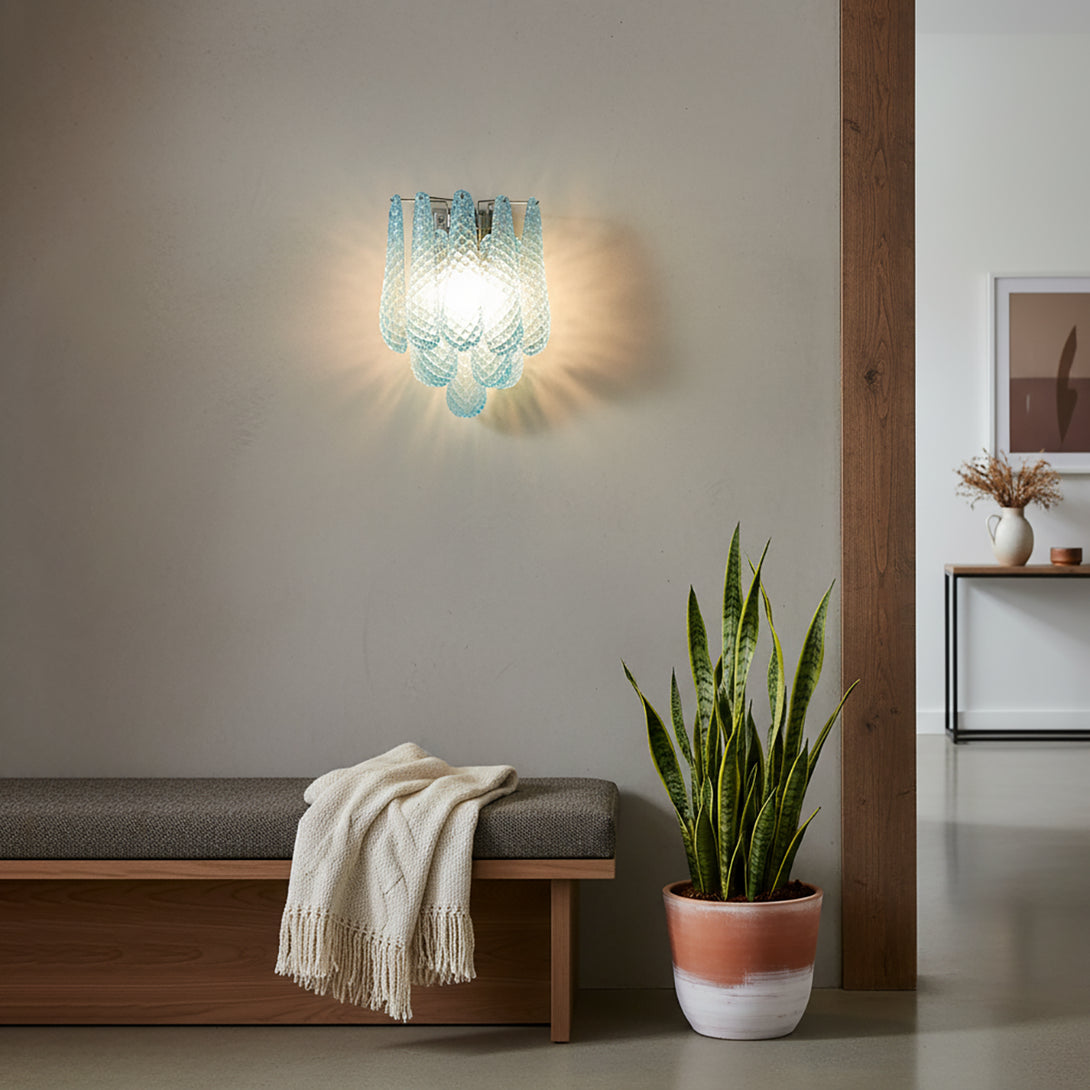 Illuminate your space with this elegant and captivating Murano Petals Glass Blue Wall Light! It perfectly blends glass art with tranquil ocean hues, adding a sophisticated and enchanting glow to your walls. The wall light is composed of multiple intricately crafted blue glass teardrop/petal elements. As light passes through, it creates a dazzling yet soft refraction effect.