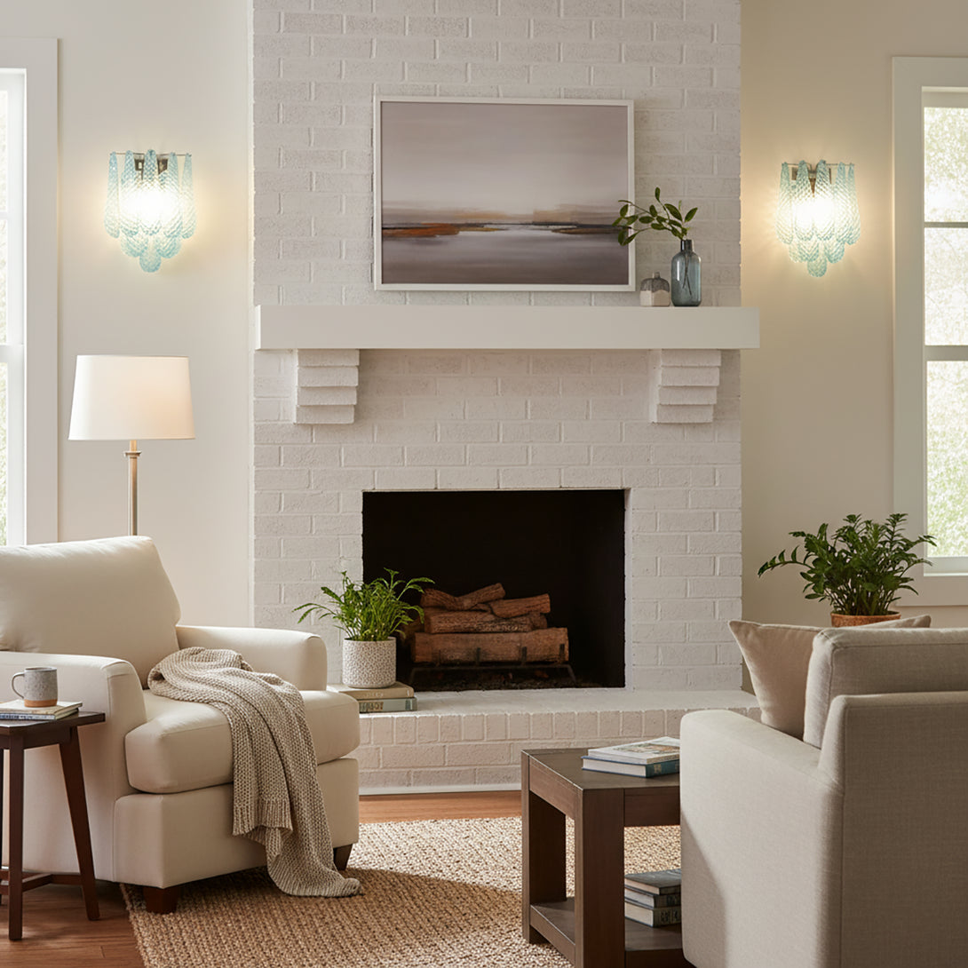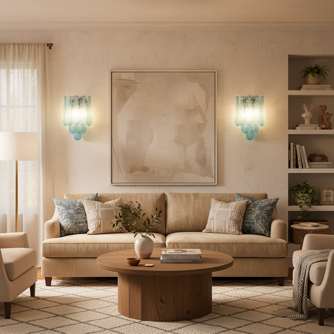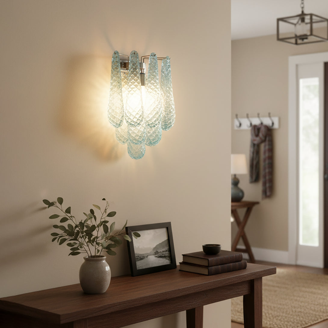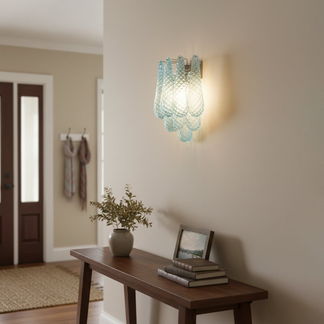 Illuminate your space with this elegant and captivating Murano Petals Glass Blue Wall Light! It perfectly blends glass art with tranquil ocean hues, adding a sophisticated and enchanting glow to your walls. The wall light is composed of multiple intricately crafted blue glass teardrop/petal elements. As light passes through, it creates a dazzling yet soft refraction effect.