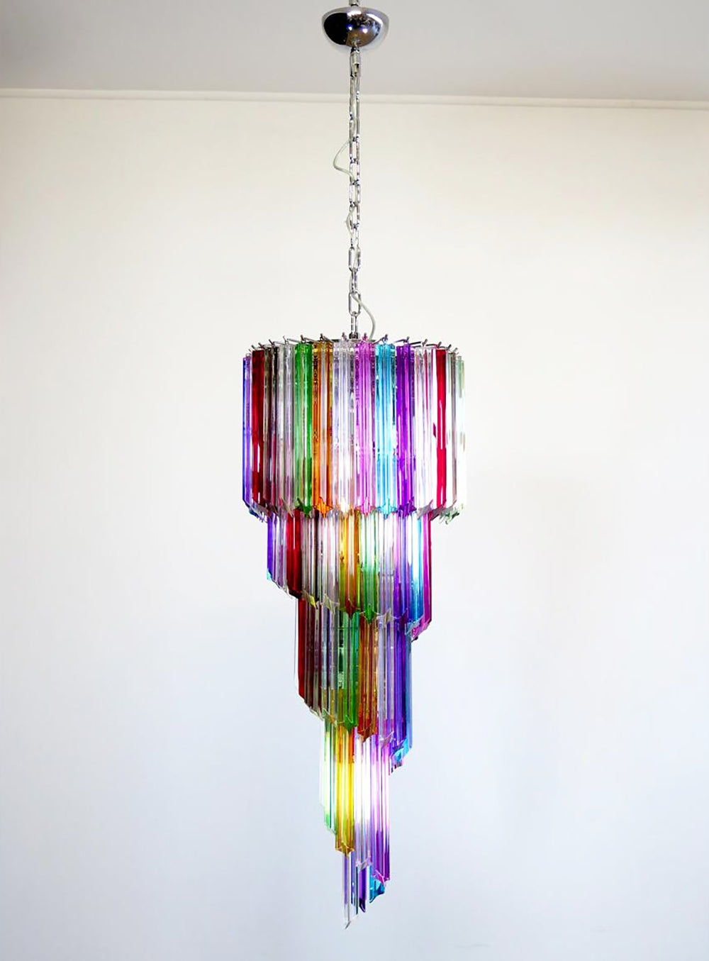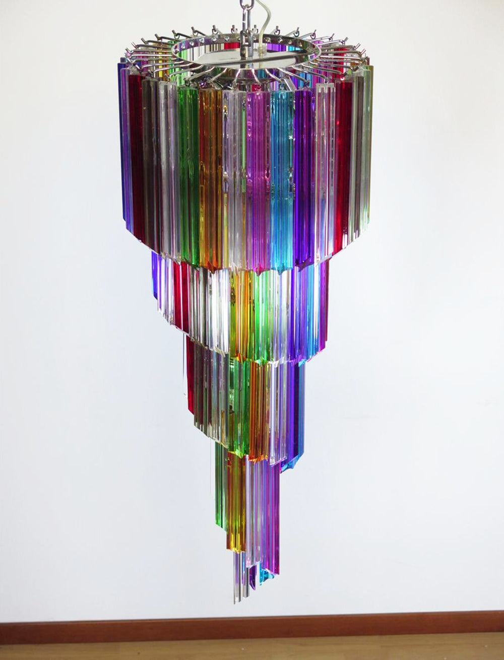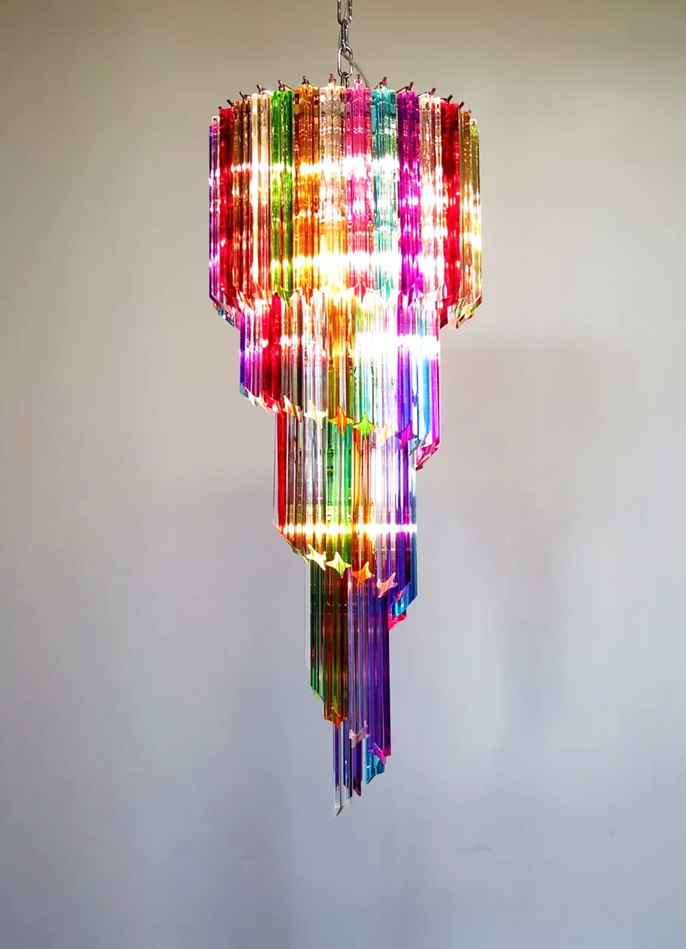 Murano Spiral Multicolor Prism Glass Chandelier. Experience unparalleled beauty and elegance with this stunning that will add a touch of luxury to any room. It is handcrafted from transparent blue glass prisms, carefully arranged on a durable nickel metal frame. Creating an alluring and atmospheric light that will mesmerize and delight any visitor.