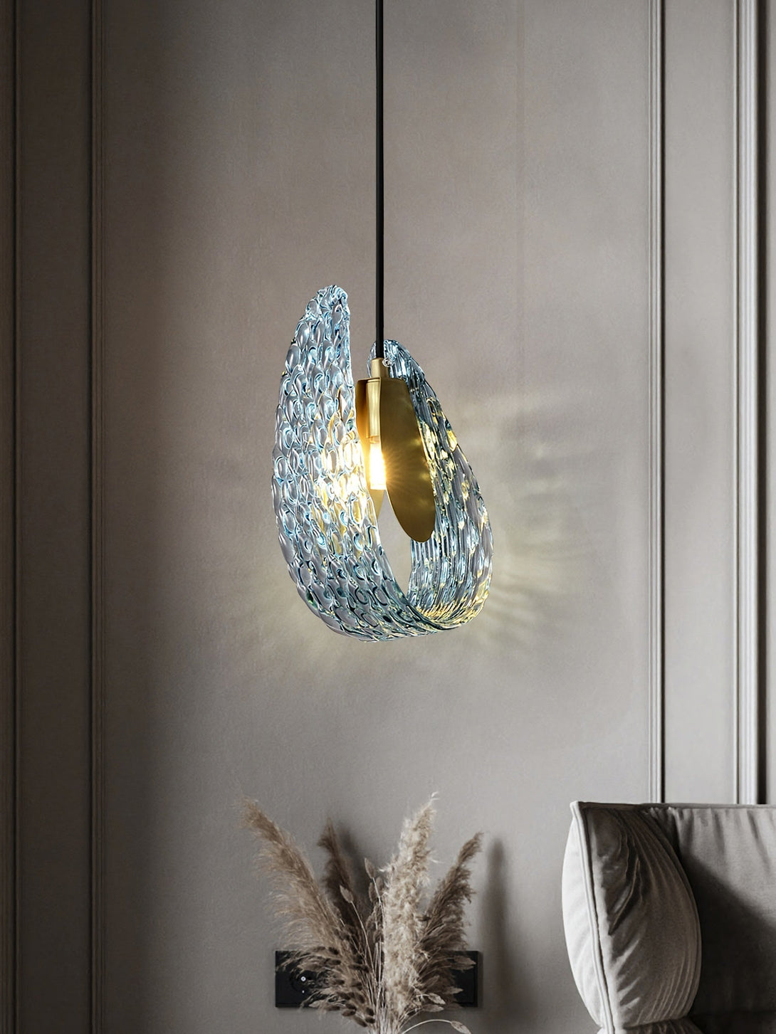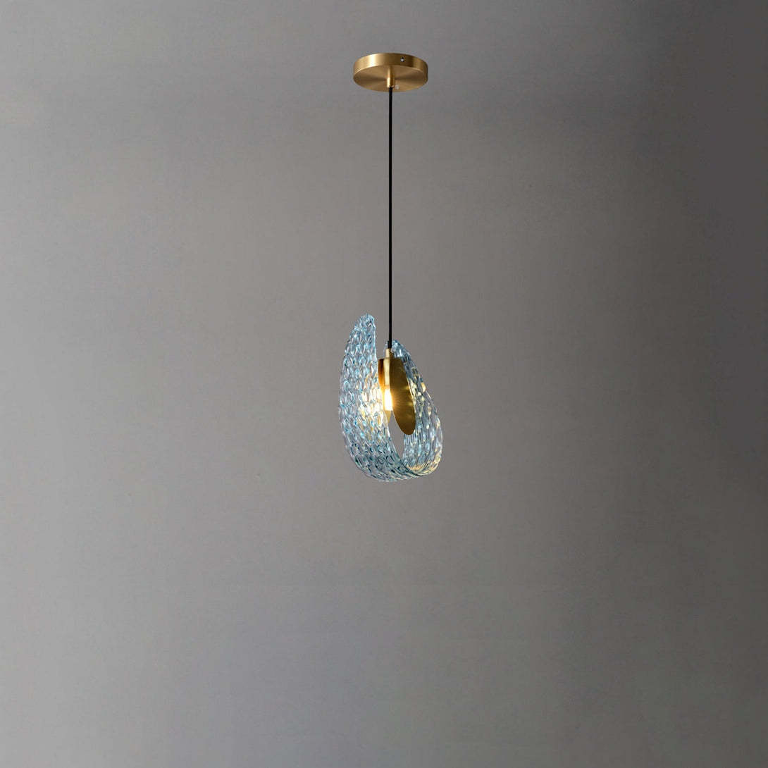 Crafted with a copper body and vibrant blue glass shade, the Petal Blue Glass Pendant Light showcases intricate petal details in a blend of blue and gold. The handmade craftsmanship and textured glass create a unique and alluring light display, elevating the atmosphere to a mysterious and distinguished level. This light is a true work of art, bringing a touch of quality to any living space.