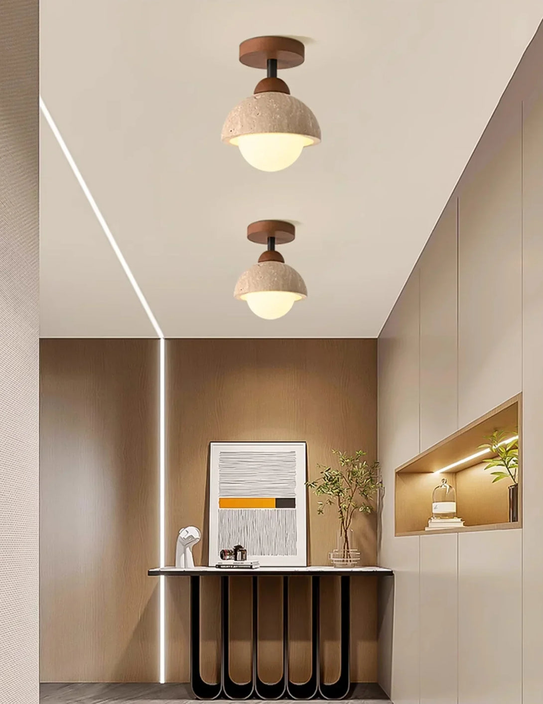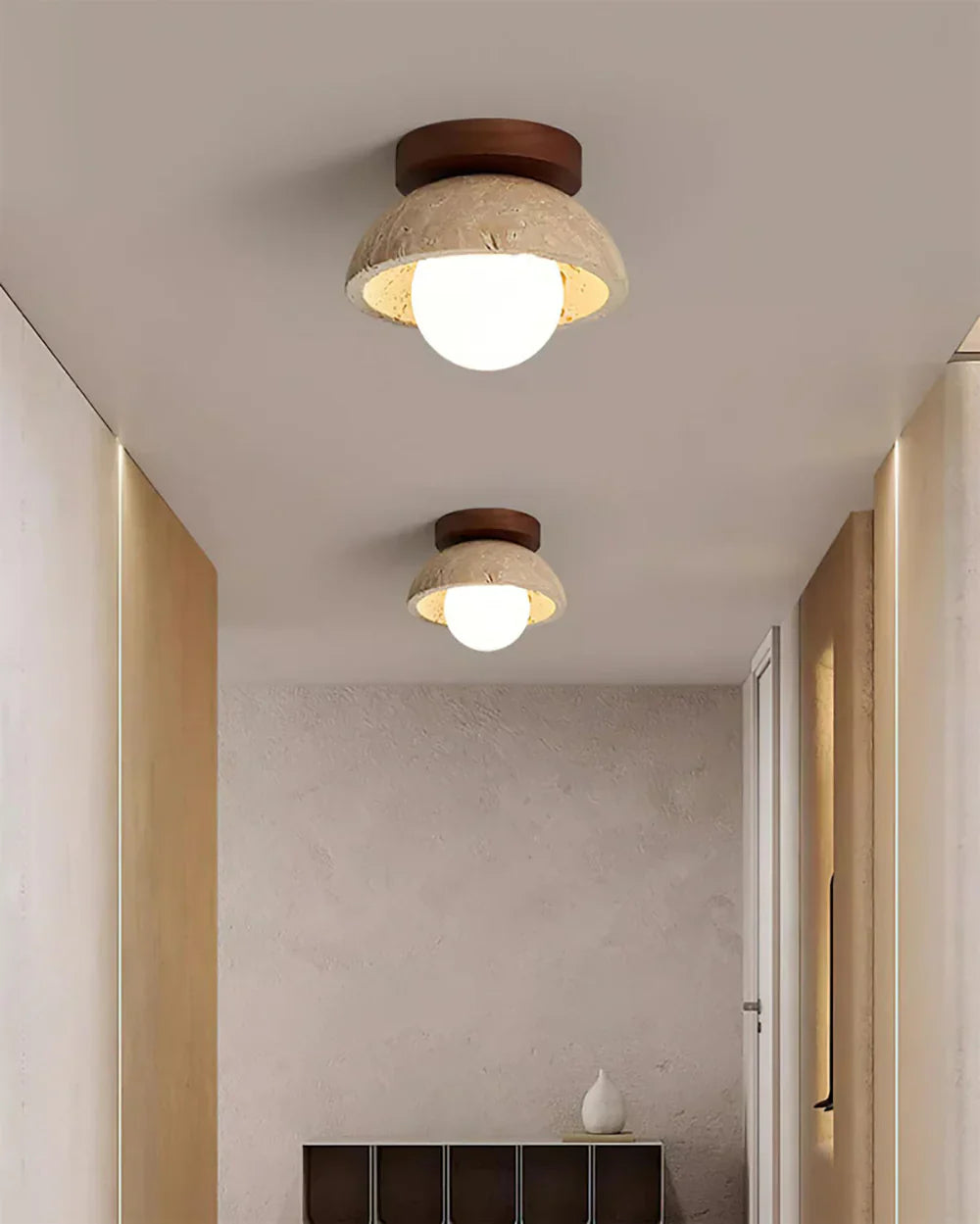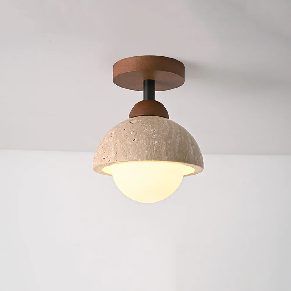 Experience the elegant allure of the Piedra Travertine Ceiling Light. Featuring a textured stone shade and a sophisticated wooden mount, this light fixture effortlessly brings a touch of natural refinement to any space. The soft diffused light from the opal glass globe creates a warm and inviting ambiance, making it an ideal addition to modern interiors.