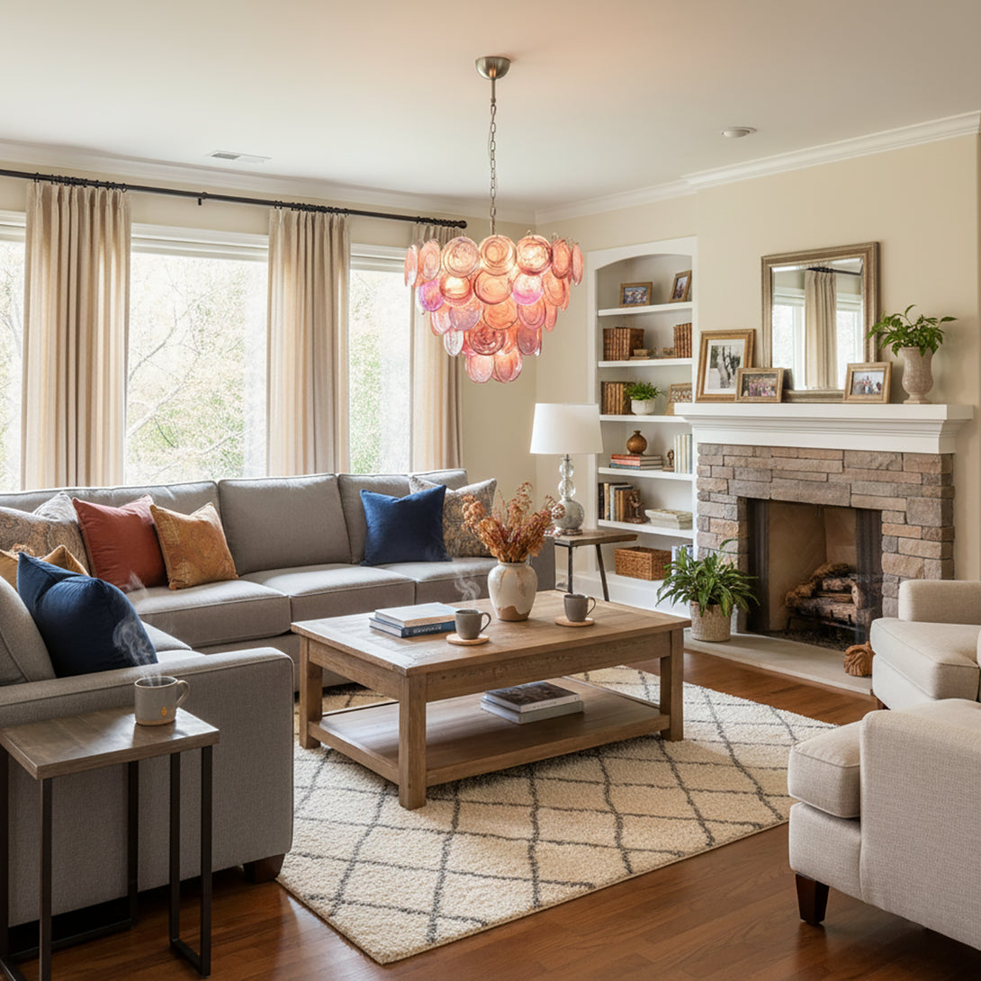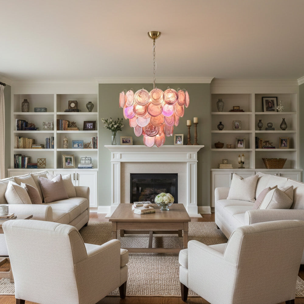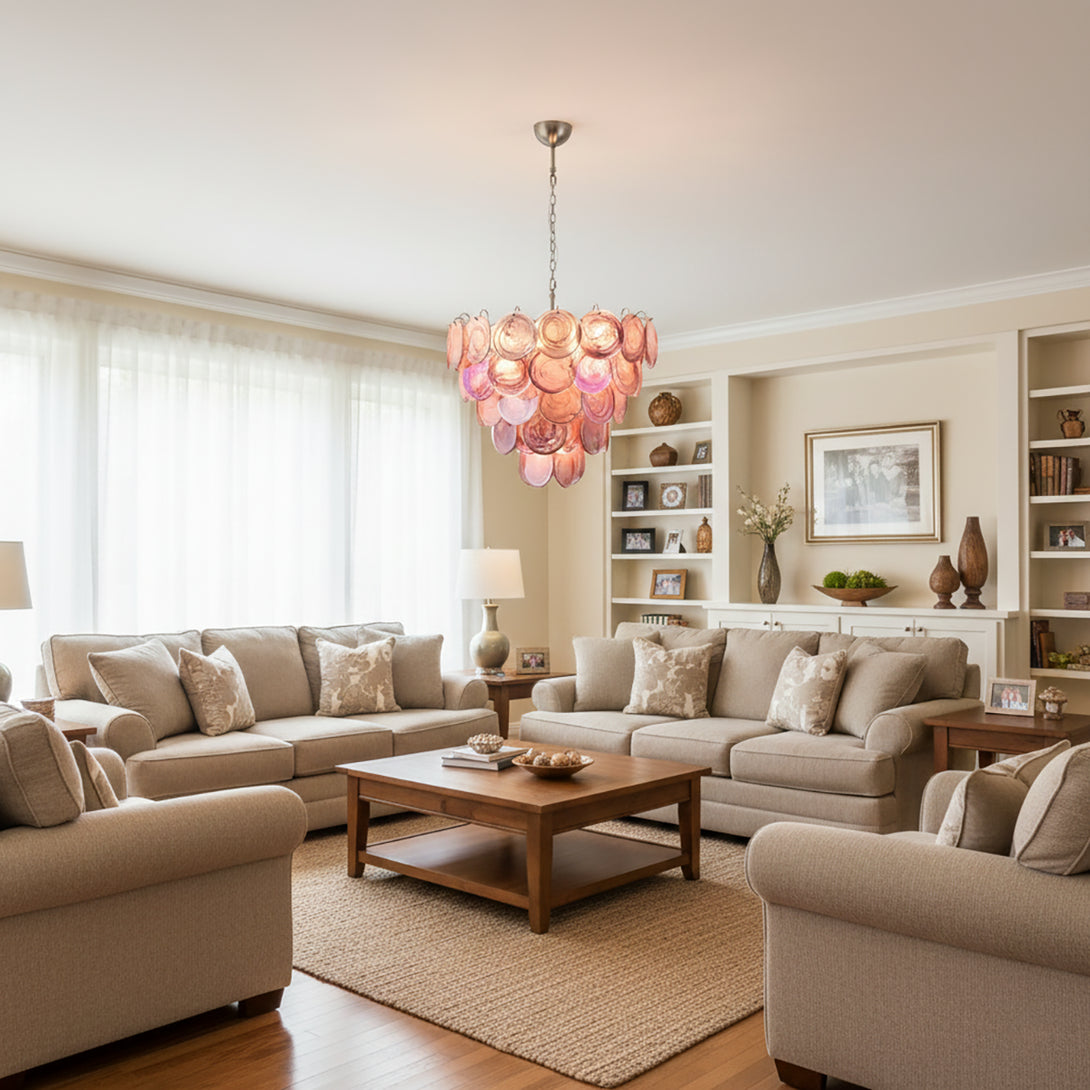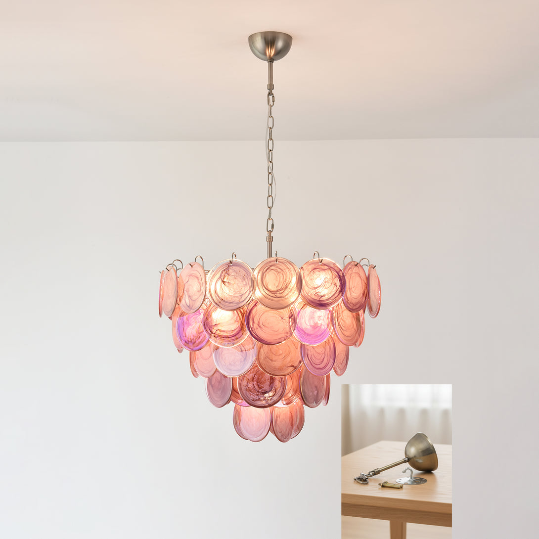 Transform your interior with this stunning Pink Disc Murano Chandelier, where modern aesthetics meet time-honored artisanal techniques. Each delicate pink glass disk catches and diffuses light beautifully, casting a warm, sophisticated ambiance throughout your space. This captivating piece serves as an instant conversation starter, infusing rooms with refined elegance and timeless charm that elevates any décor style.
