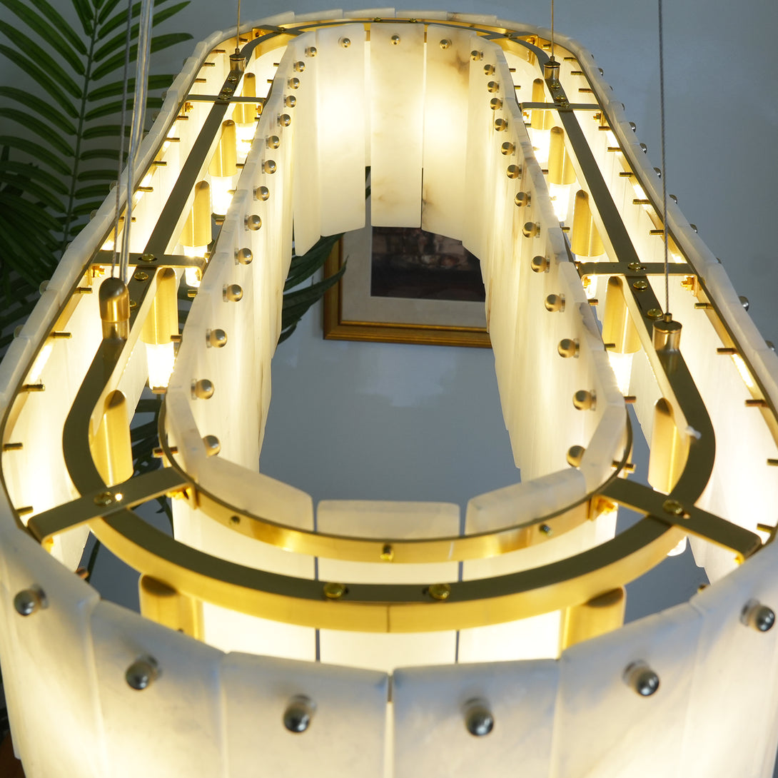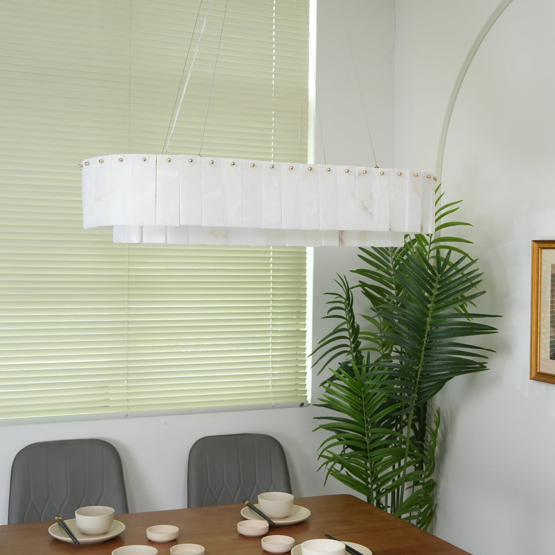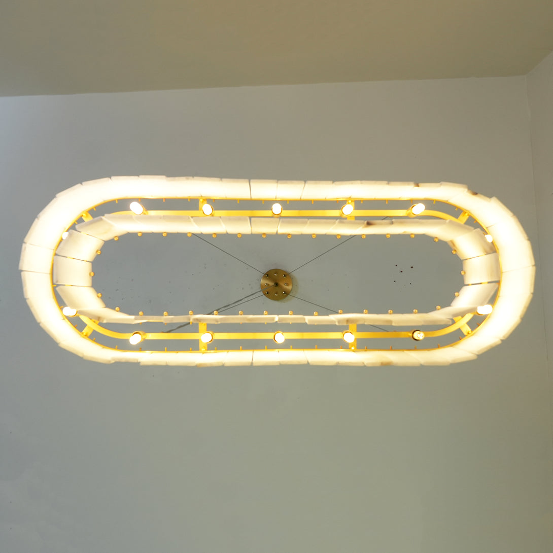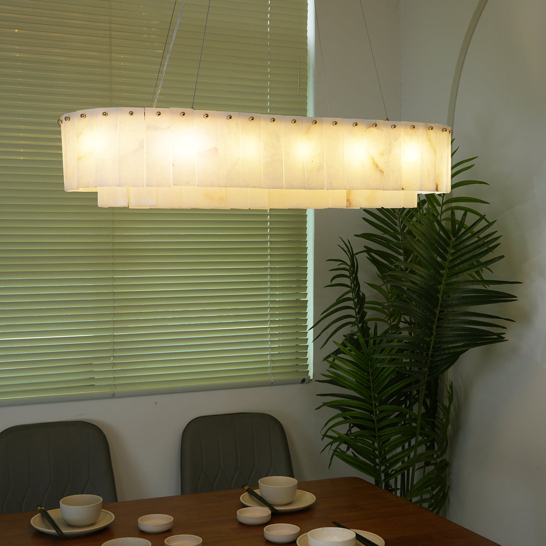 The Rectangular Linear Alabaster Chandelier combines natural elements with modern design into an artistic lighting tool. Its main body is carefully made of high-quality alabaster. Each piece of alabaster has a unique texture and color, showing the uncanny craftsmanship of nature. The rectangular design gives the entire lamp clean lines, creating a warm and comfortable environment for your space.