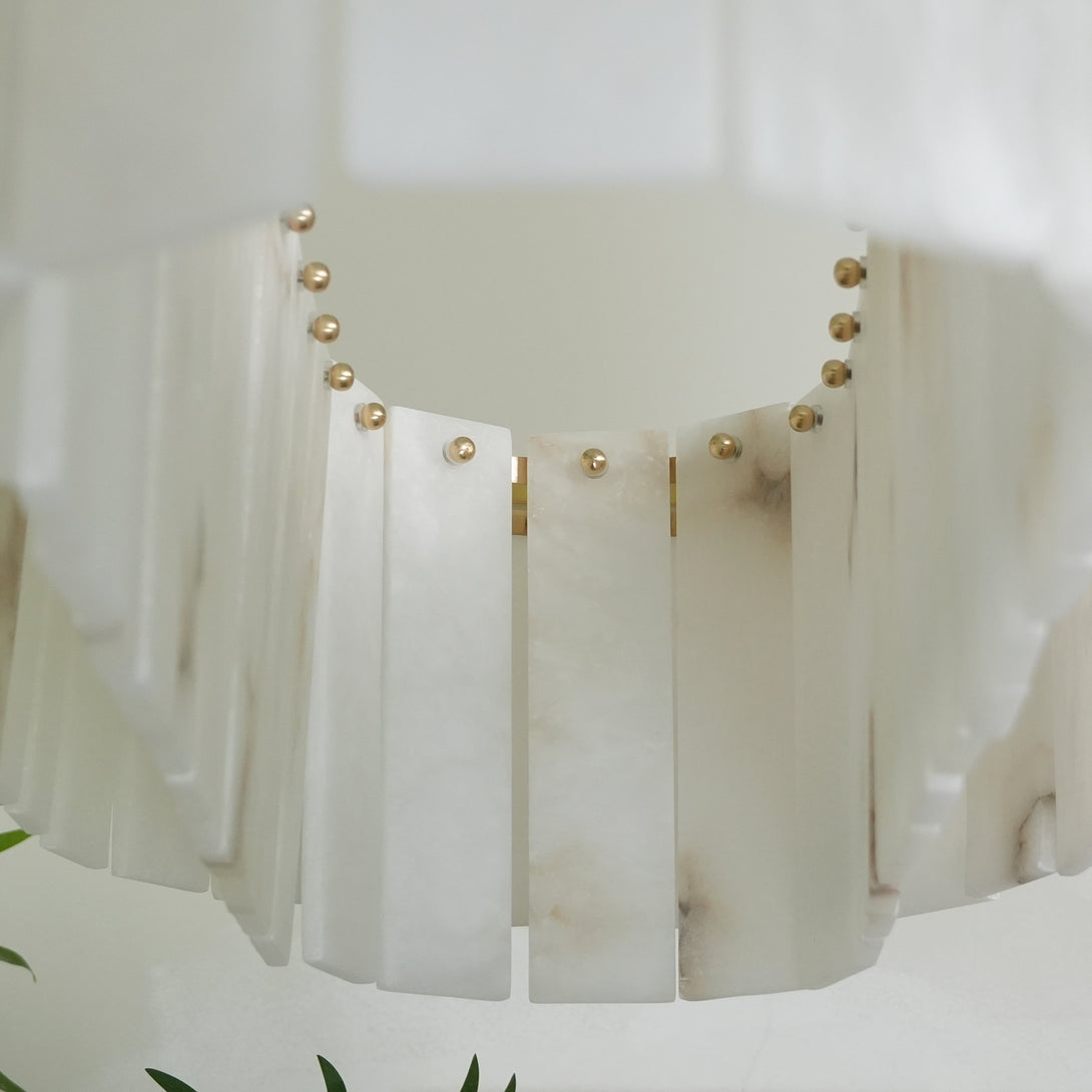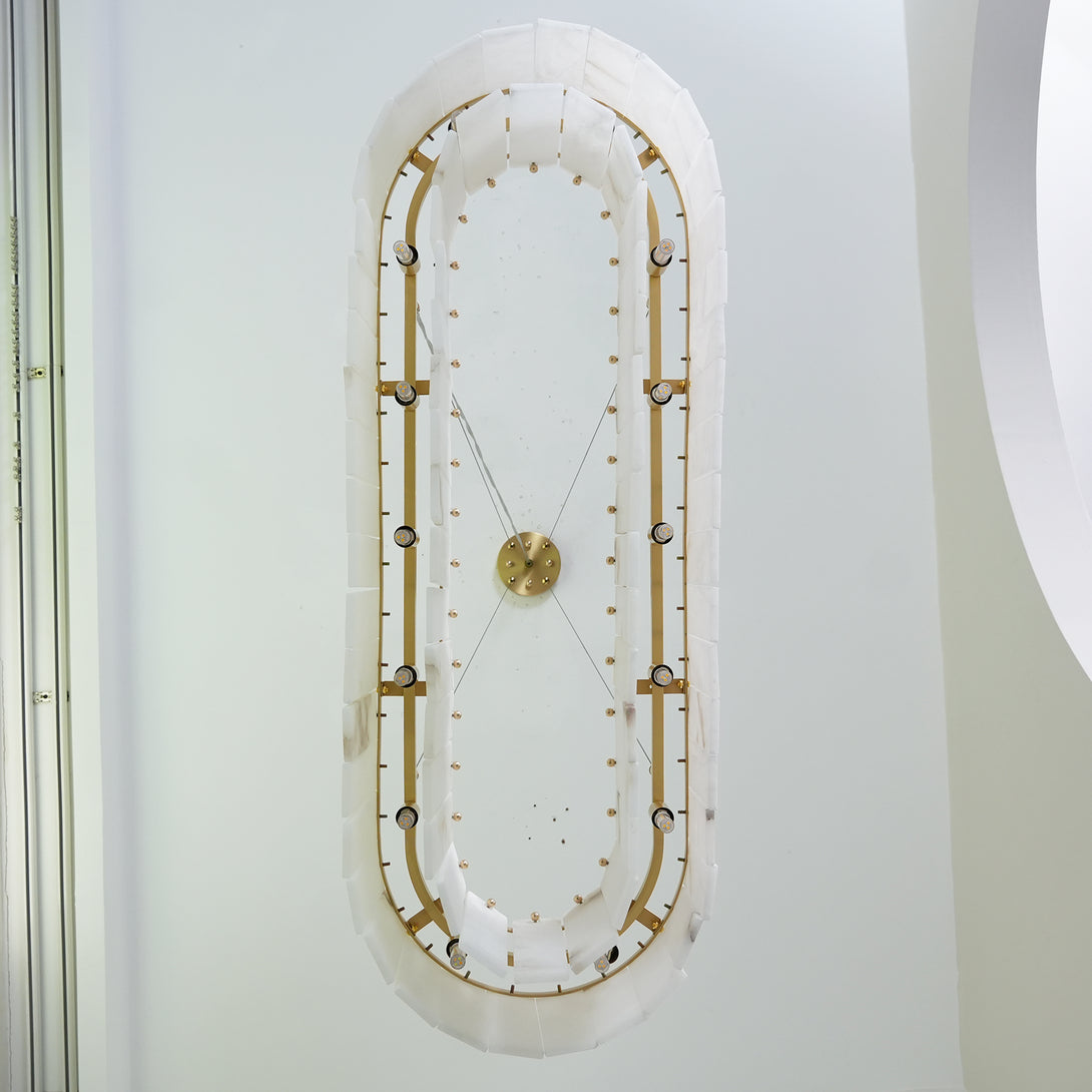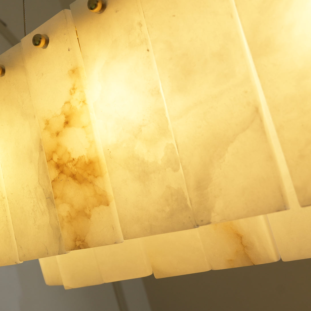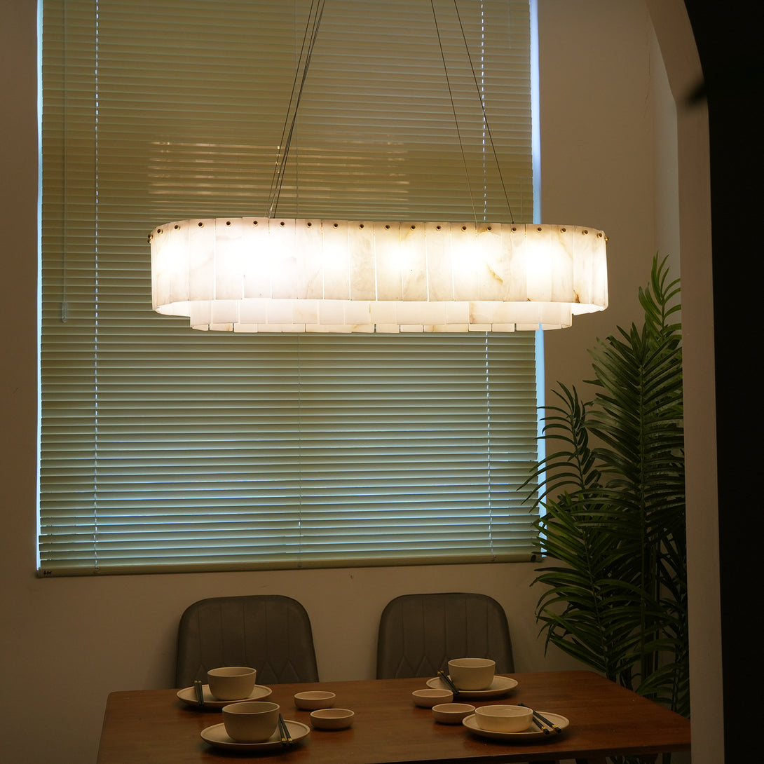 The Rectangular Linear Alabaster Chandelier combines natural elements with modern design into an artistic lighting tool. Its main body is carefully made of high-quality alabaster. Each piece of alabaster has a unique texture and color, showing the uncanny craftsmanship of nature. The rectangular design gives the entire lamp clean lines, creating a warm and comfortable environment for your space.