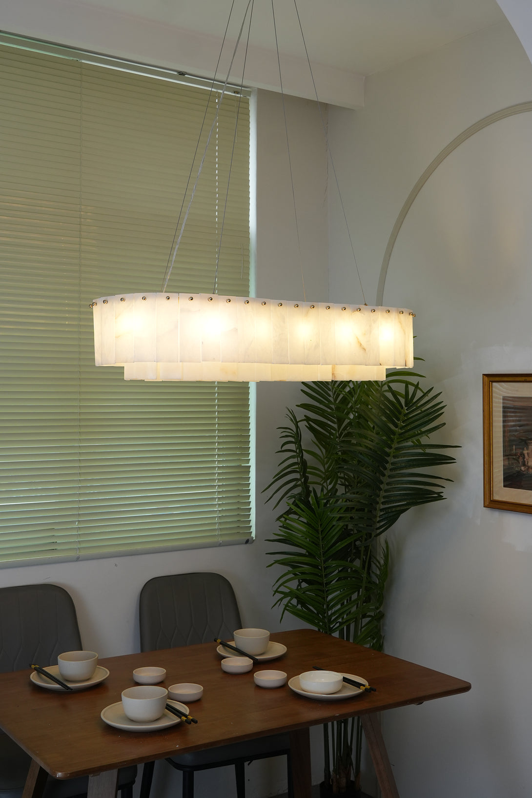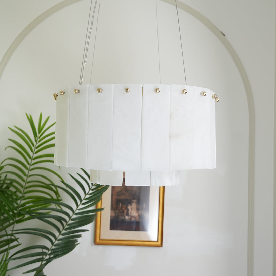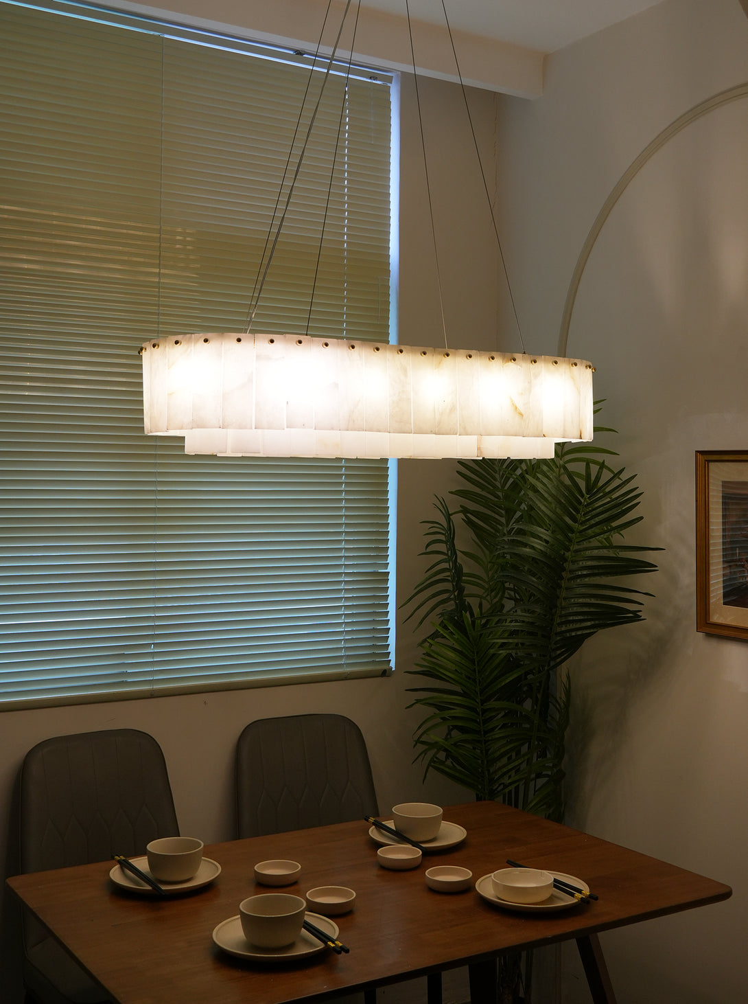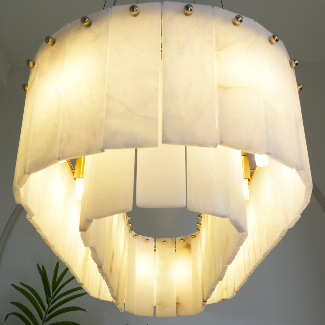 The Rectangular Linear Alabaster Chandelier combines natural elements with modern design into an artistic lighting tool. Its main body is carefully made of high-quality alabaster. Each piece of alabaster has a unique texture and color, showing the uncanny craftsmanship of nature. The rectangular design gives the entire lamp clean lines, creating a warm and comfortable environment for your space.