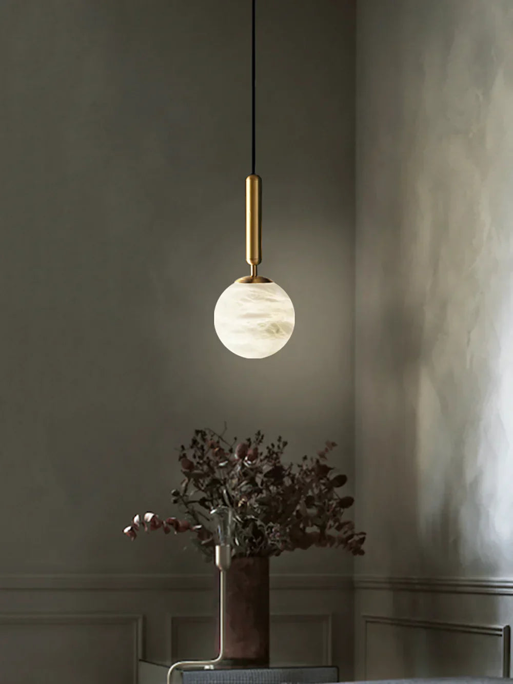 Elevate your space with the understated charm of the Round Bosso Alabaster Pendant Lamp. Featuring a smooth white satin Alabaster globe suspended from a sleek brass fixture, this pendant light strikes the perfect balance between modern elegance and timeless versatility. More than just lighting, it is a clever interpretation of style and comfort that can easily enhance the sophistication of any room.