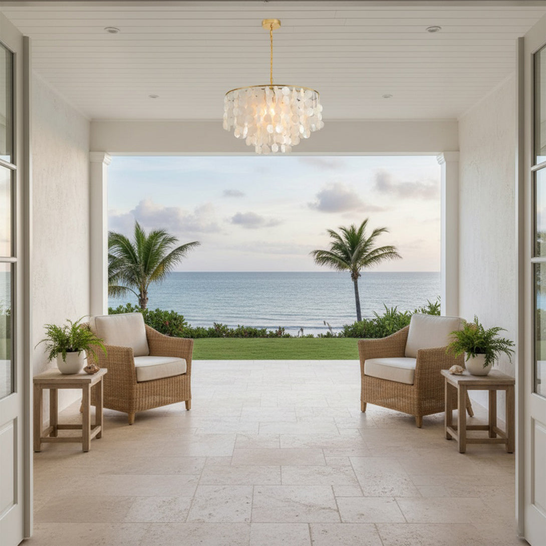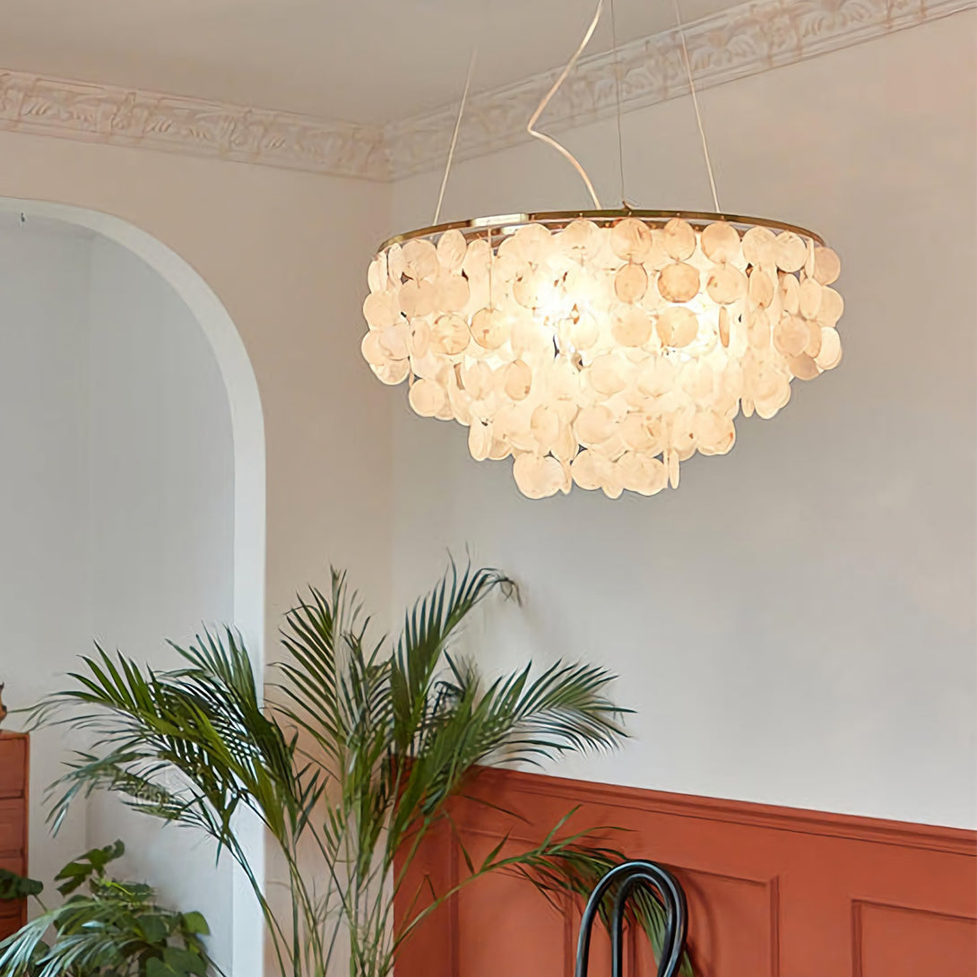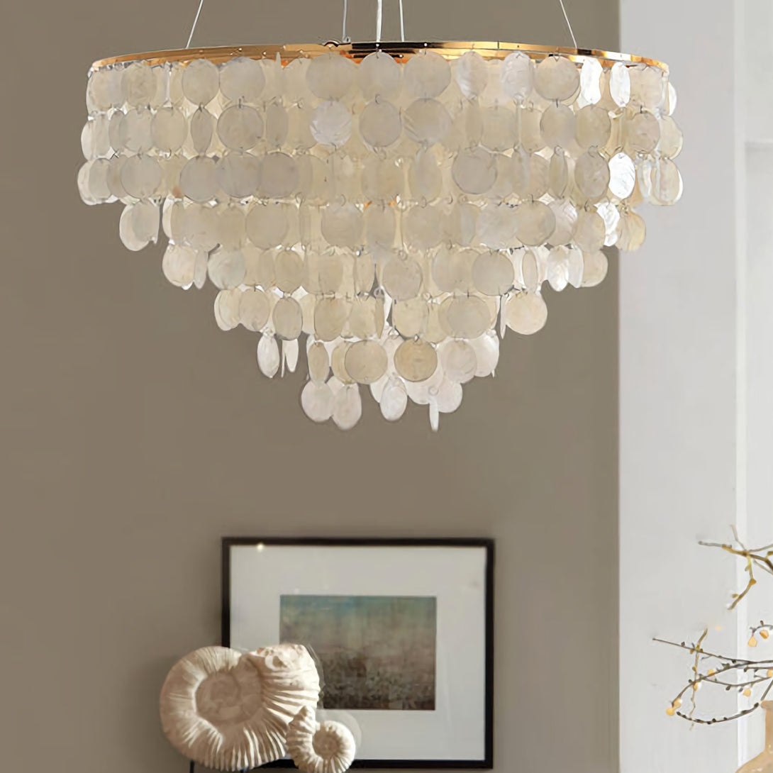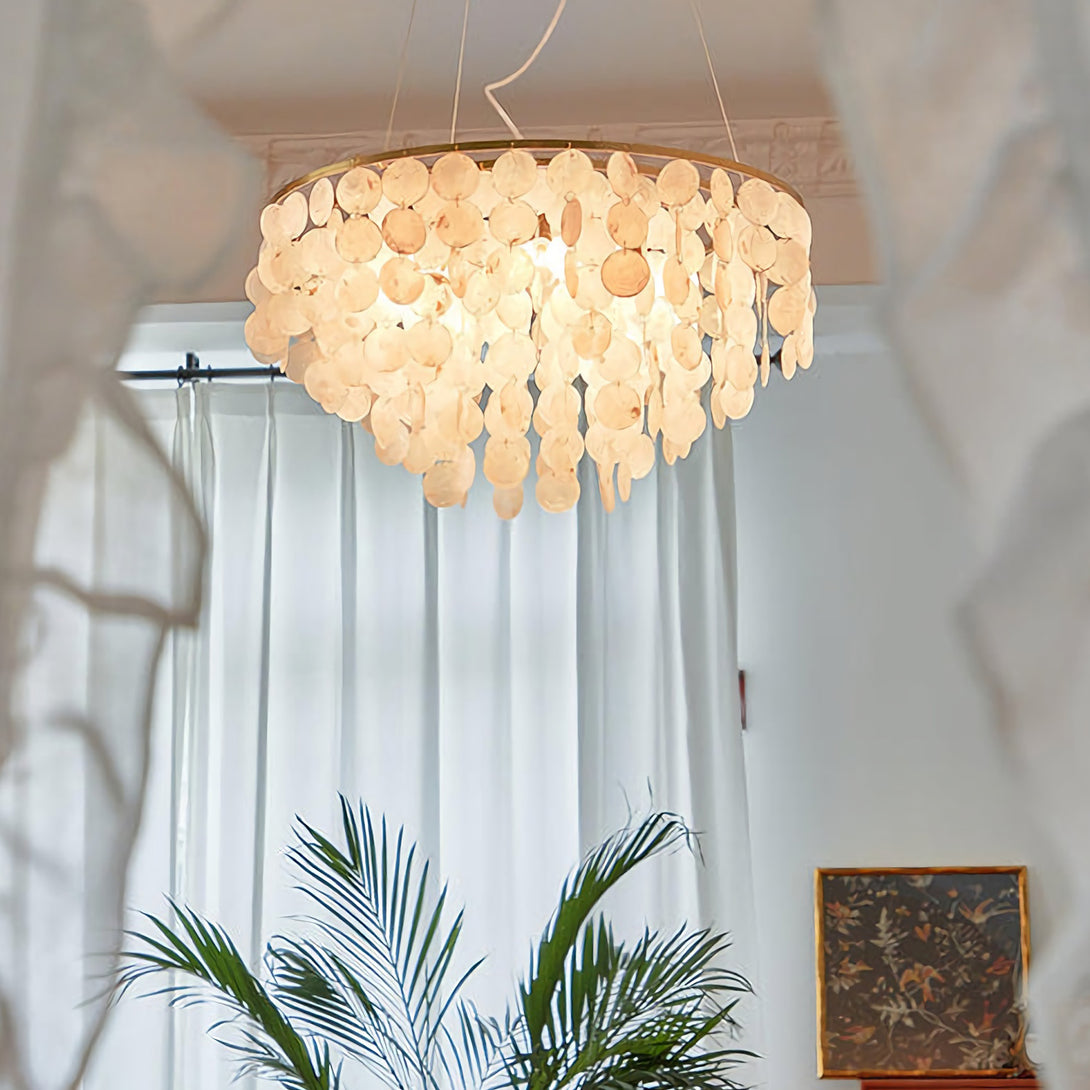 The Shell Wind Chime Chandelier by korewolamp captures the soothing spirit of coastal living with its cascading layers of natural shells. Each delicate piece catches the light and sways gently, evoking the calm rhythm of an ocean breeze. Suspended from a sleek golden frame, it blends island-inspired serenity with refined elegance, making it a perfect statement for patios, gardens, or indoor spaces seeking a touch of seaside charm. More than just lighting, it brings an enchanting, tranquil atmosphere to your home.
