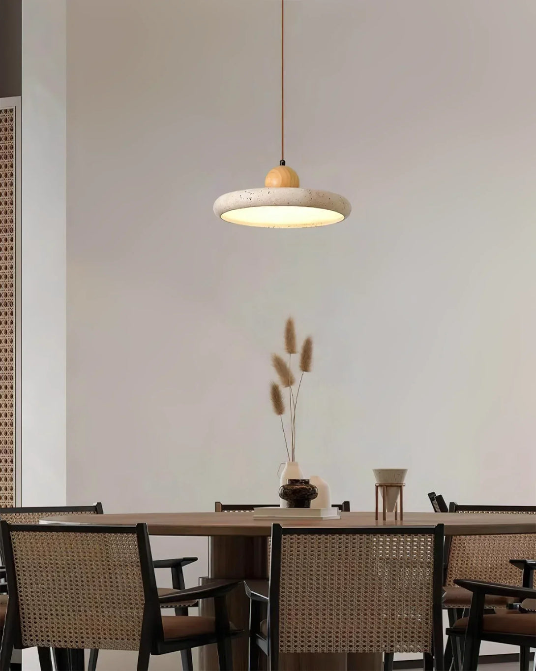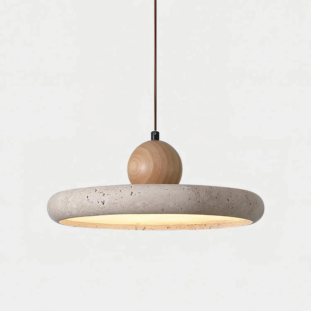 Experience the perfect blend of natural and modern design with the Siyane Travertine Pendant Lamp. Its circular shade is crafted from Travertine, adding an organic touch to the sleek wooden cap. This unique piece not only adds a warm aesthetic to any room, but also emits a soft, comforting glow that will enhance your living space.
